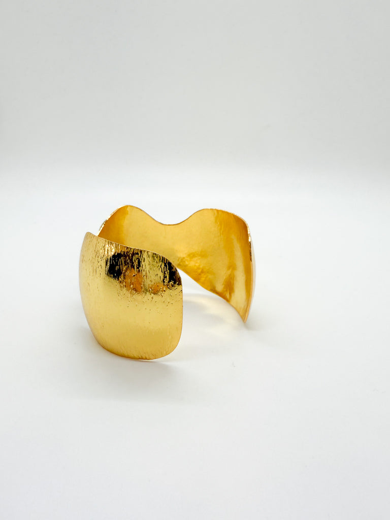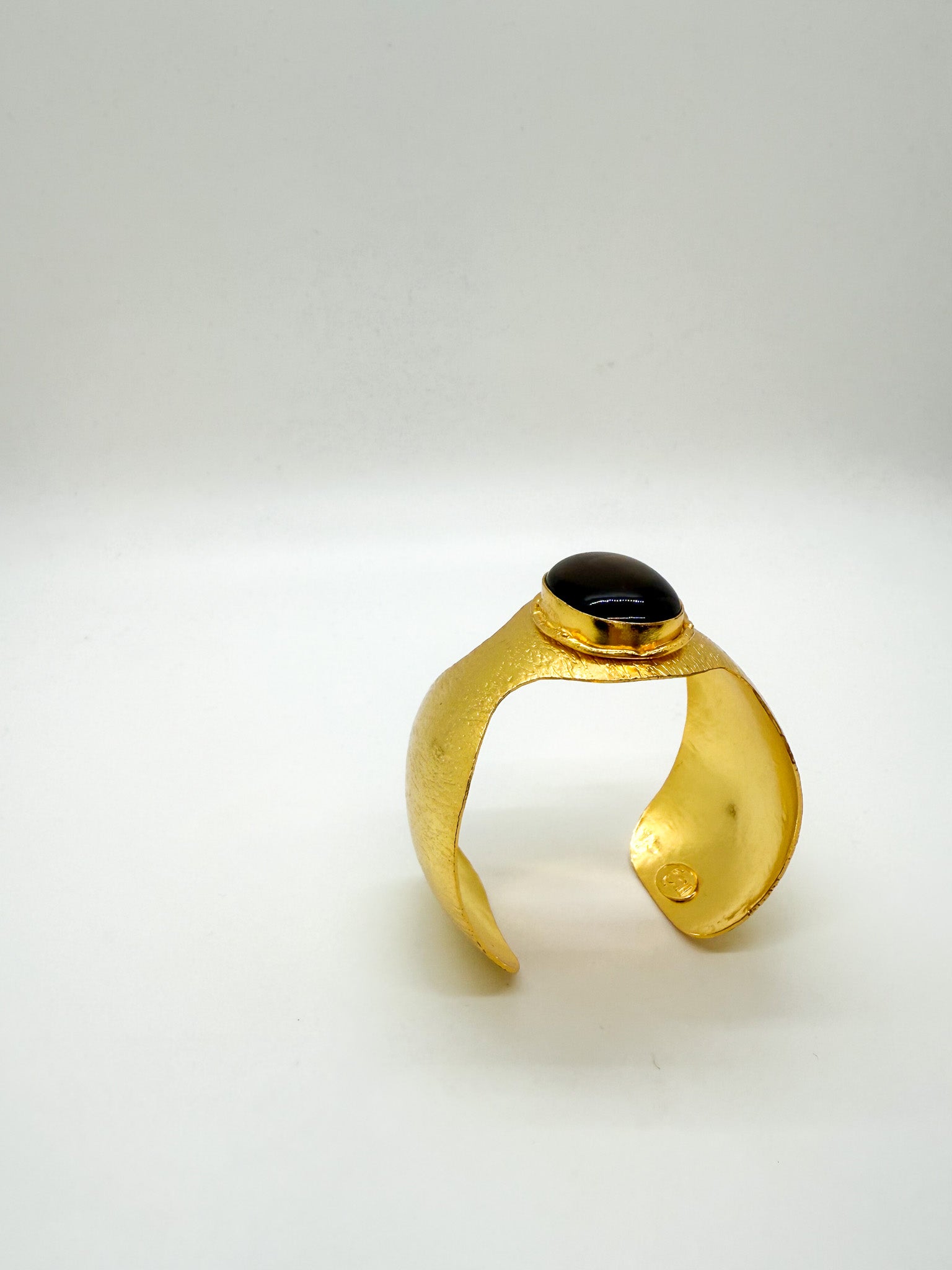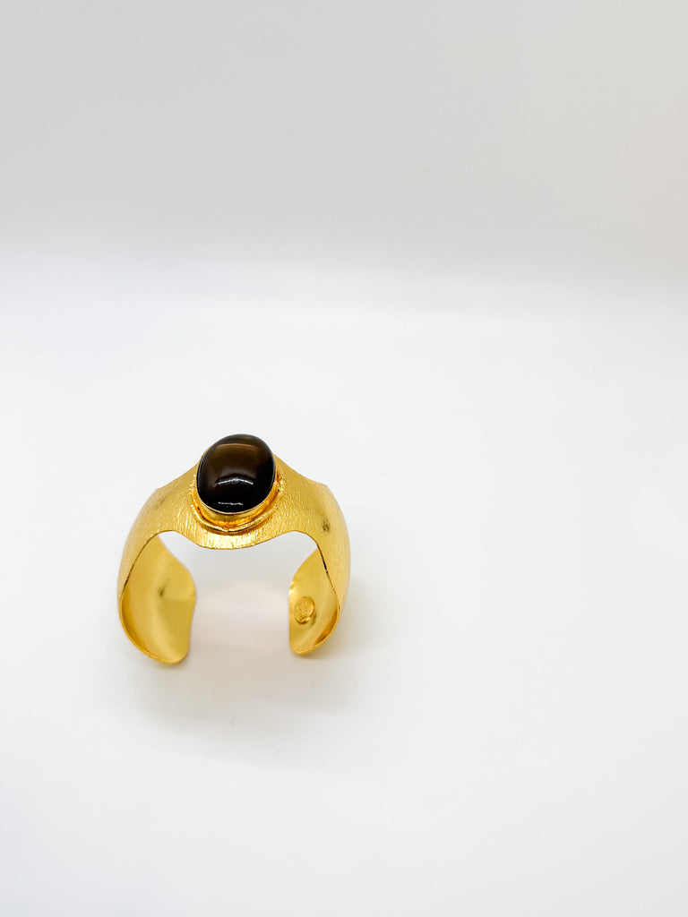 This gold cuff features a fluid, wave-like silhouette with a striking smoky quartz stone.