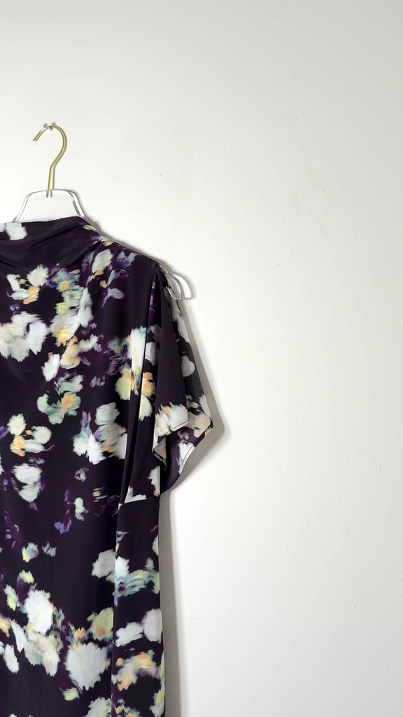 This maxi dress in a silk blend showcases asymmetrical sleeves and a side slit at the hem. Lightweight and adorned with a delicate floral print, it features a button closure at the back of the neck for an effortlessly refined look.