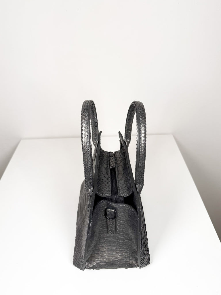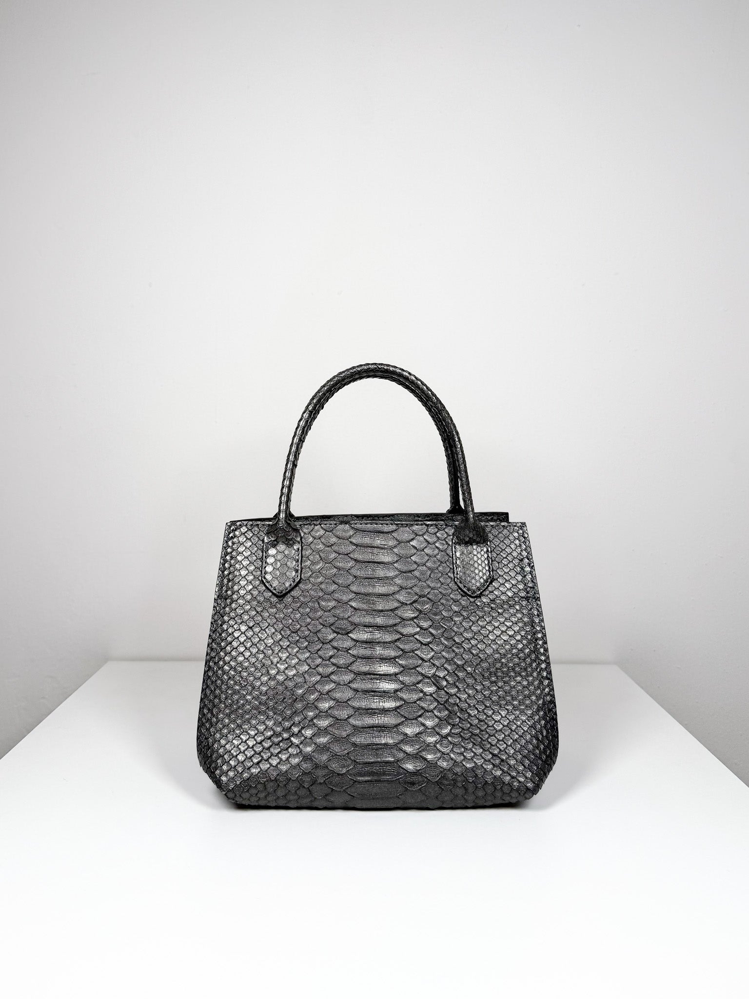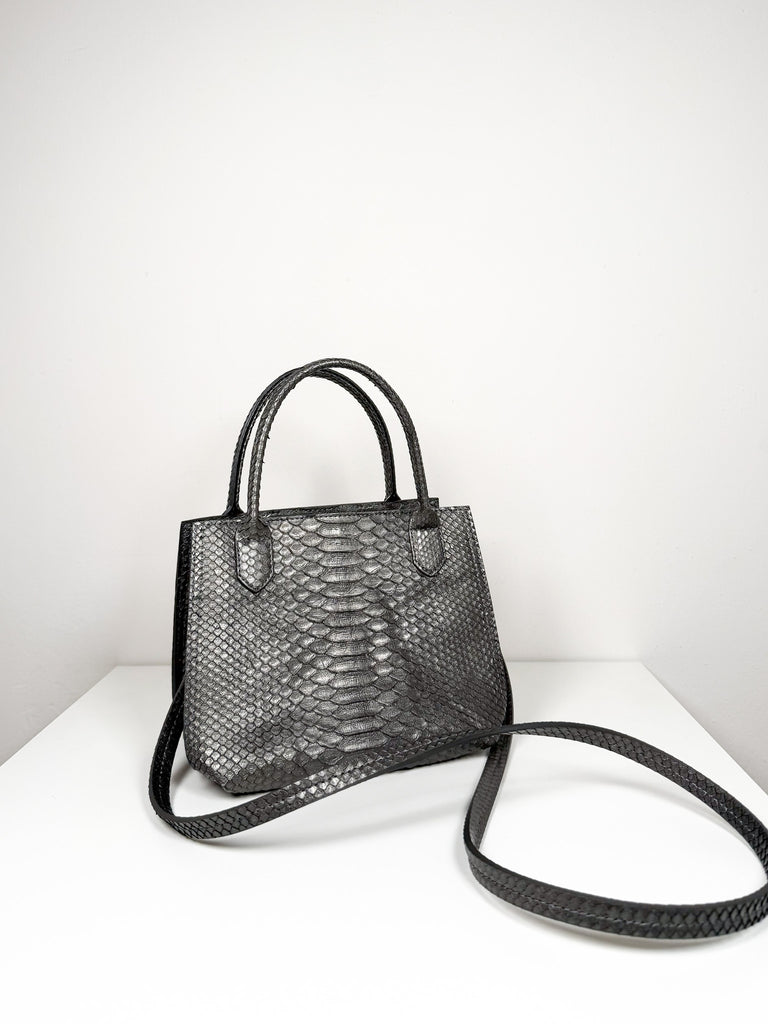 This compact python handbag features two handles and a zipper closure. It includes a detachable crossbody strap for versatile carrying. The bag can stand upright on its own and offers an interior zipper pocket, easily accommodating a large phone.