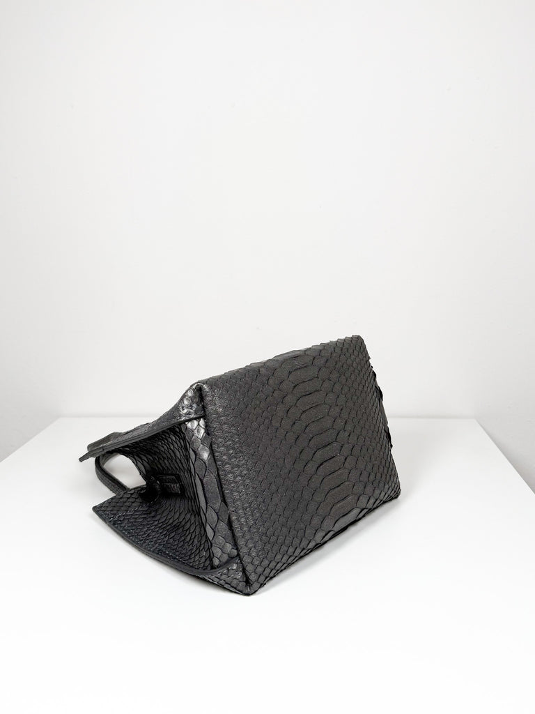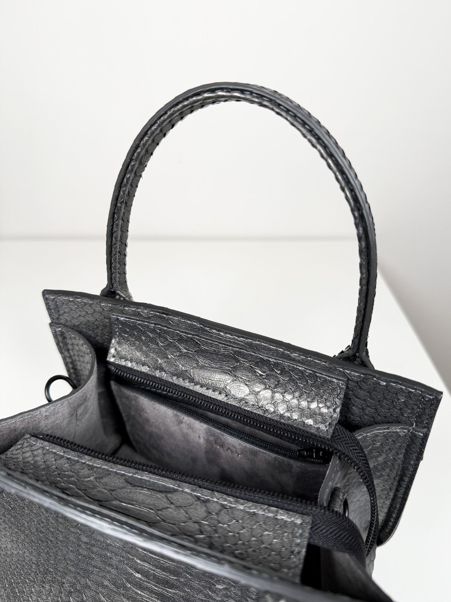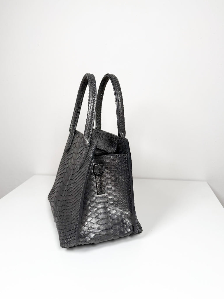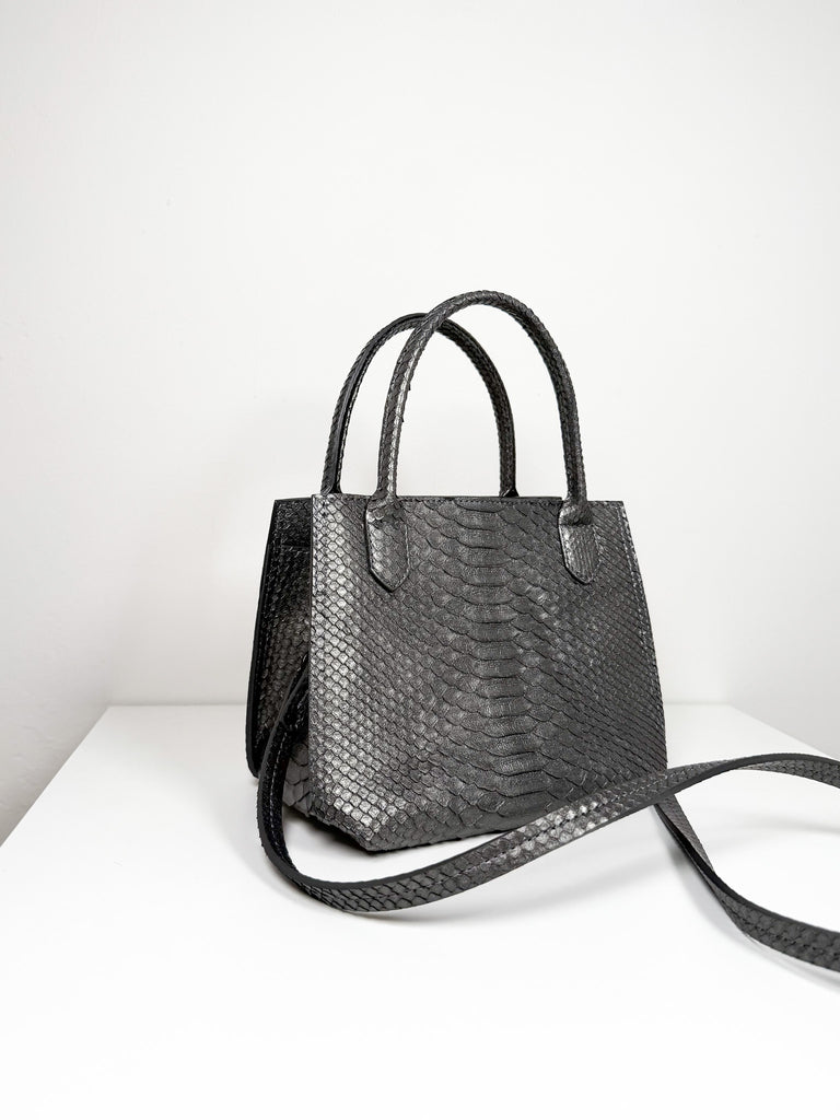 This compact python handbag features two handles and a zipper closure. It includes a detachable crossbody strap for versatile carrying. The bag can stand upright on its own and offers an interior zipper pocket, easily accommodating a large phone.