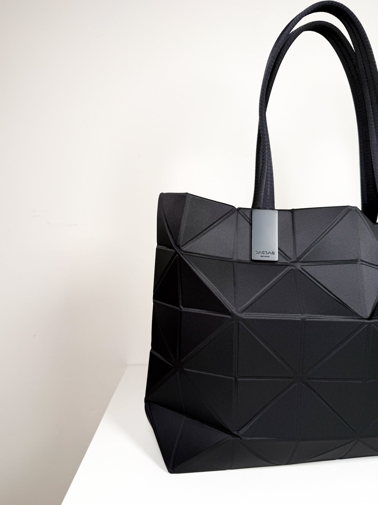 Generous carryall with coated Bao Bao triangle construction and an interior pocket for essentials.