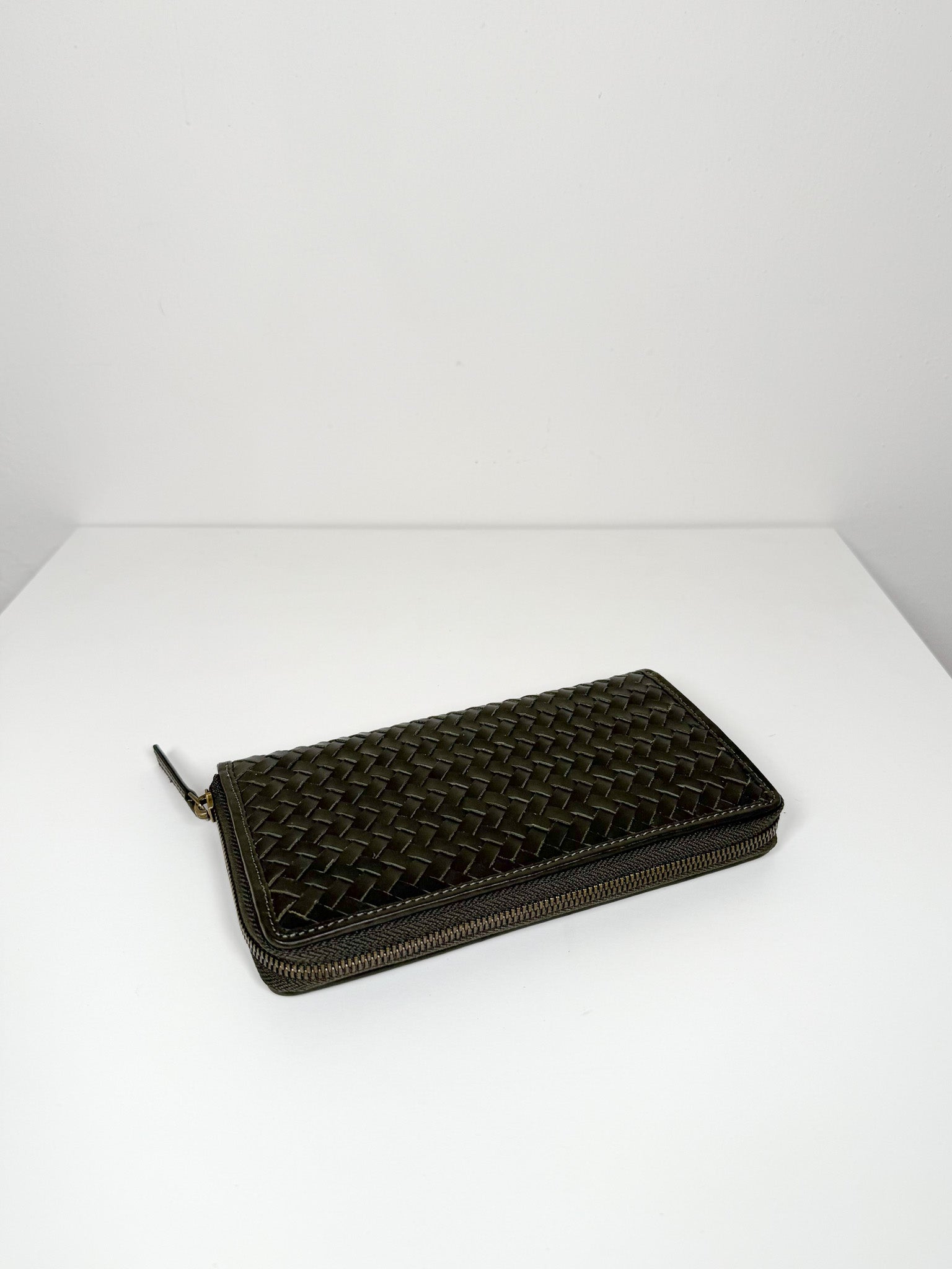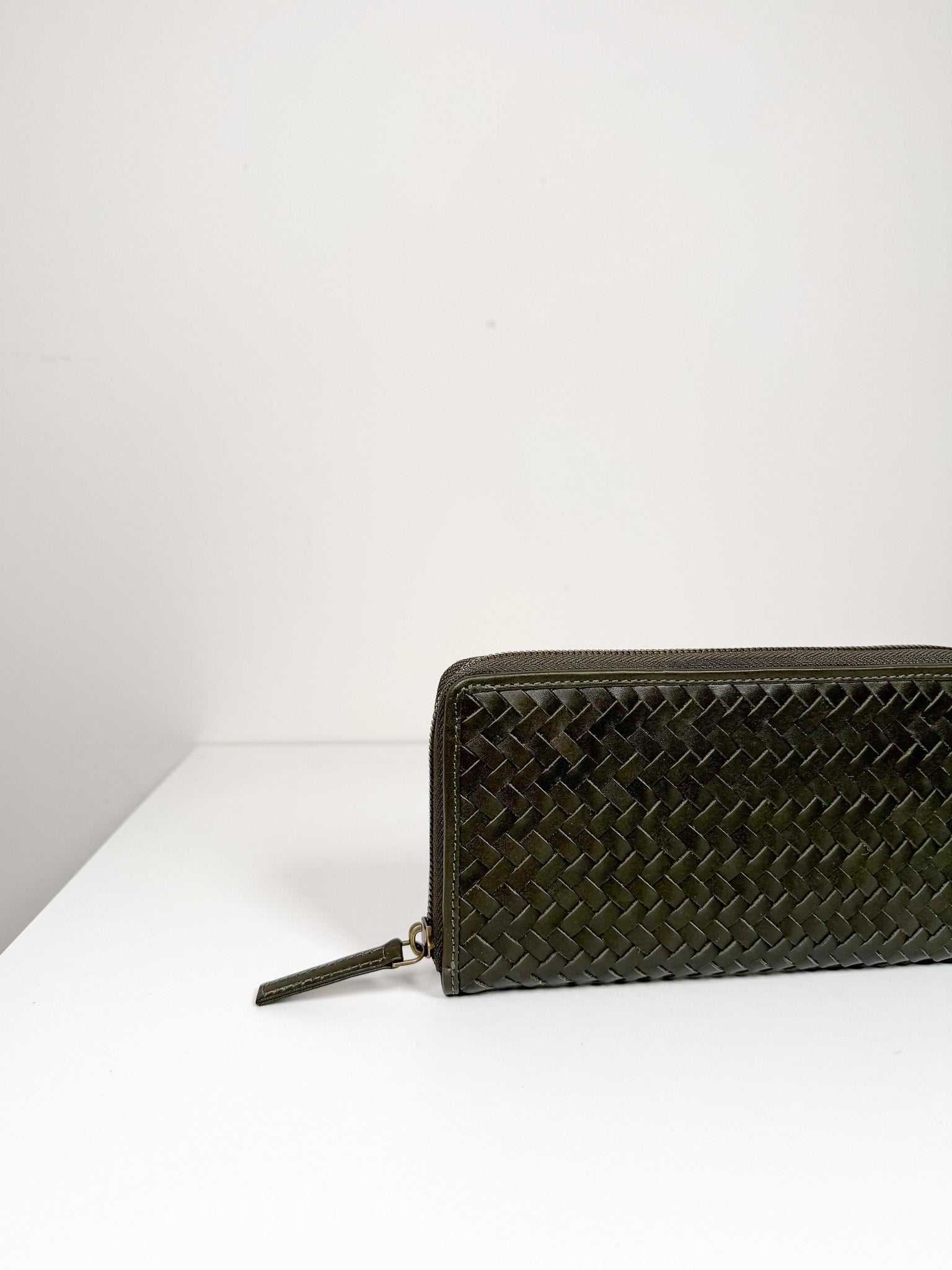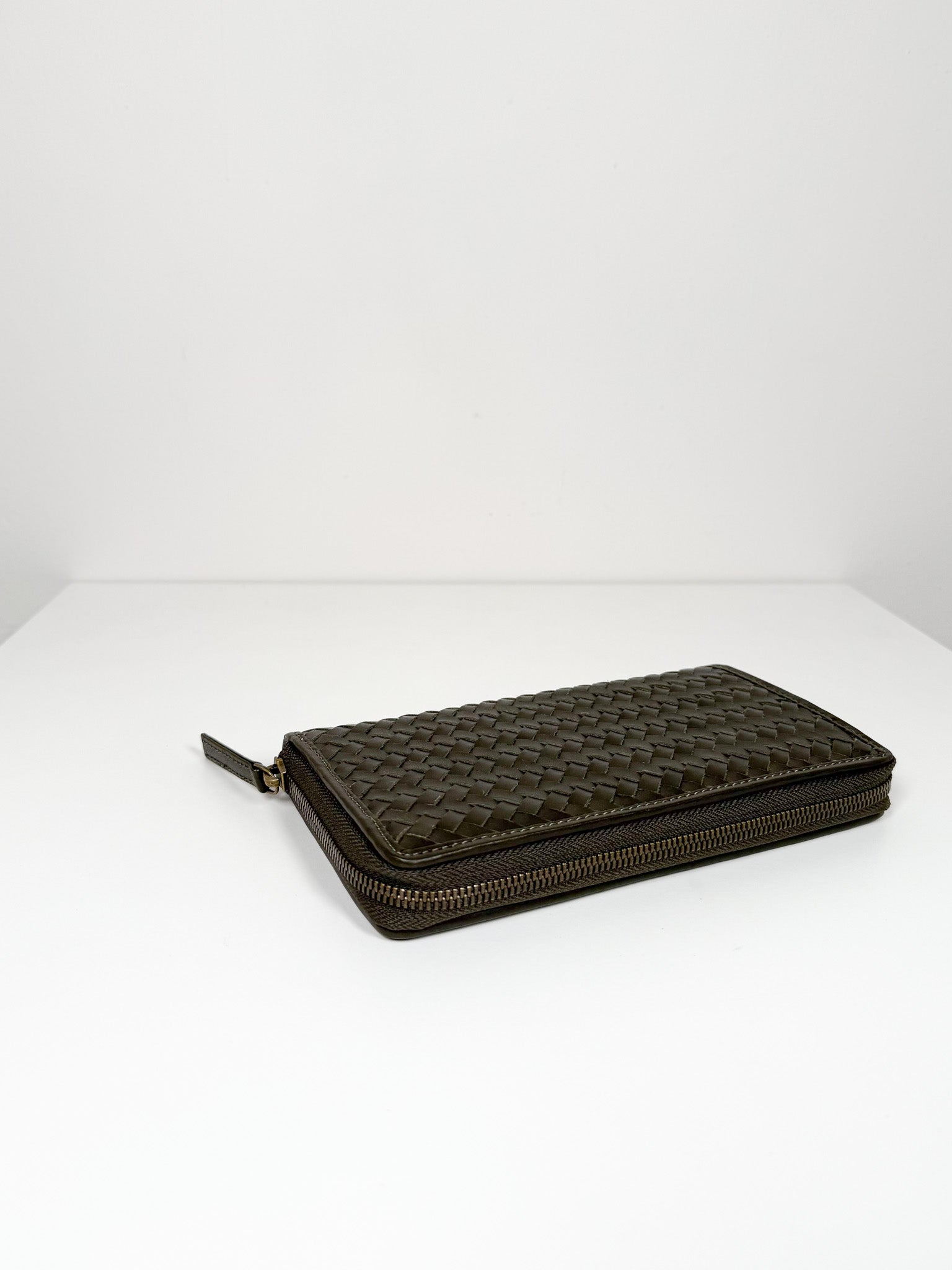 Woven leather wallet with zipper closure, card slots, and interior zippered pocket for everyday essentials.