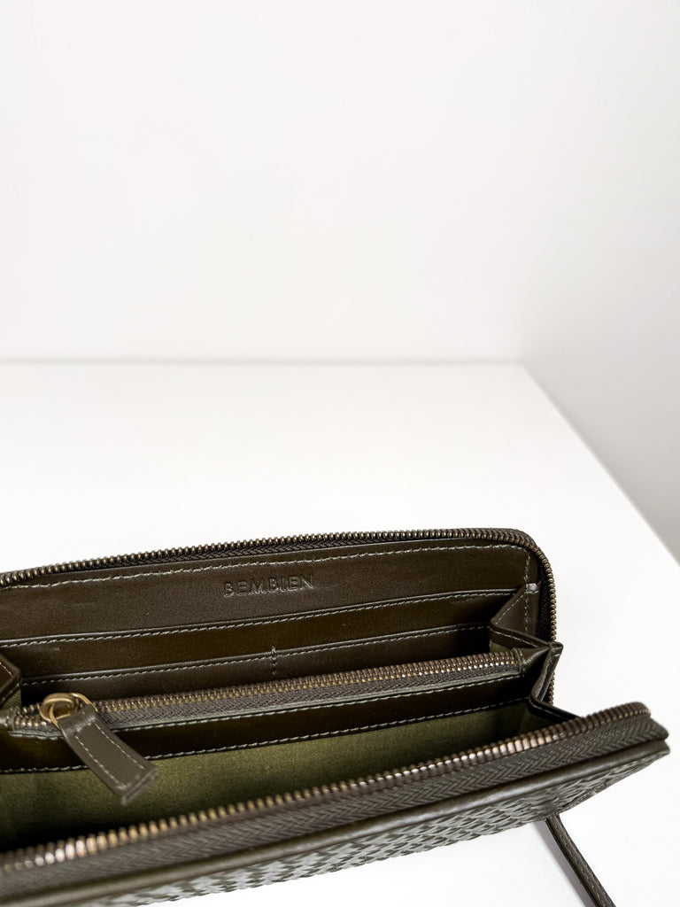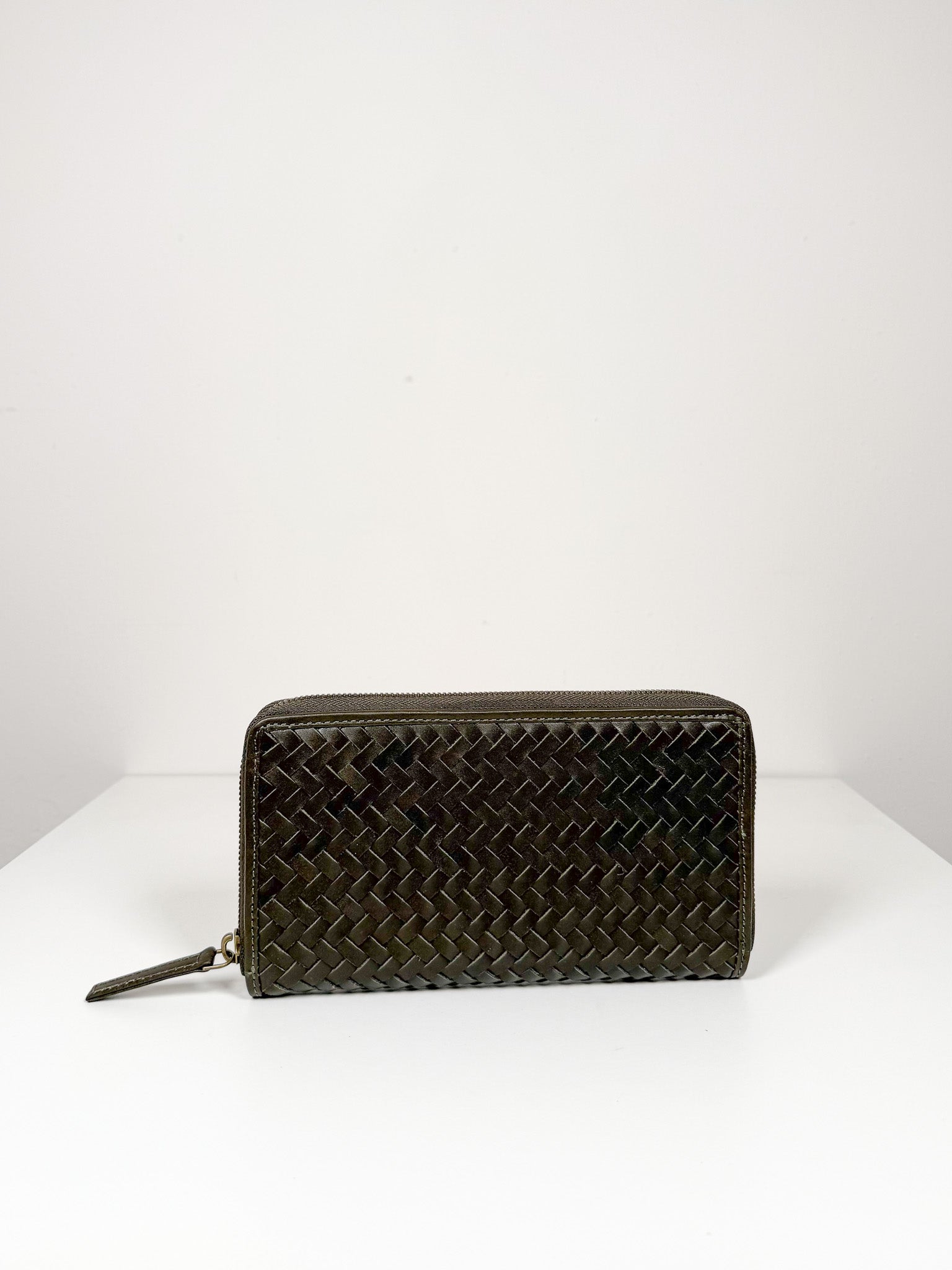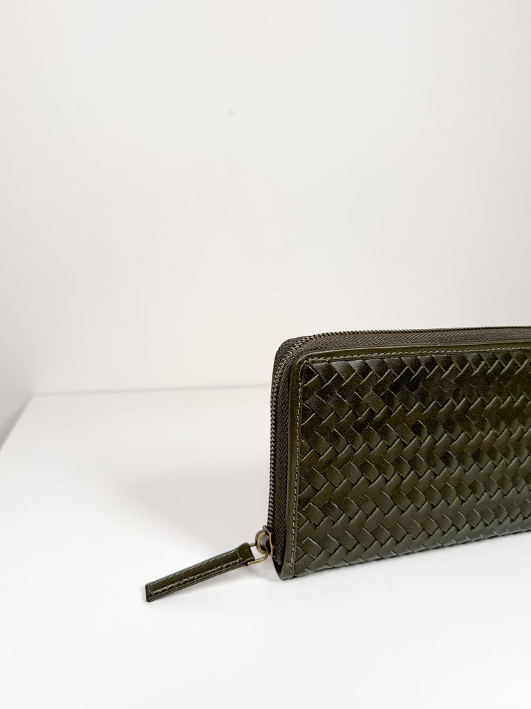 Woven leather wallet with zipper closure, card slots, and interior zippered pocket for everyday essentials.
