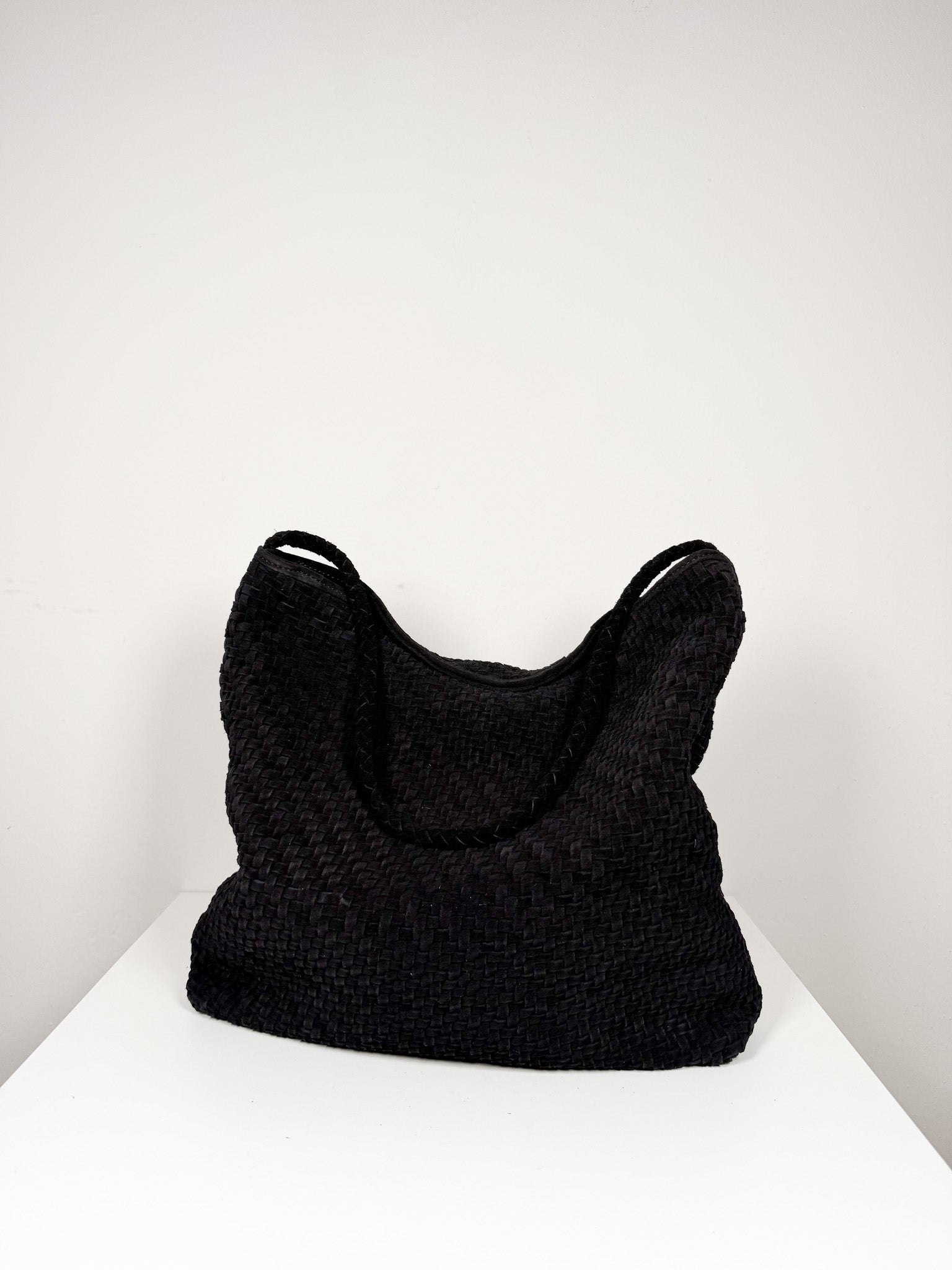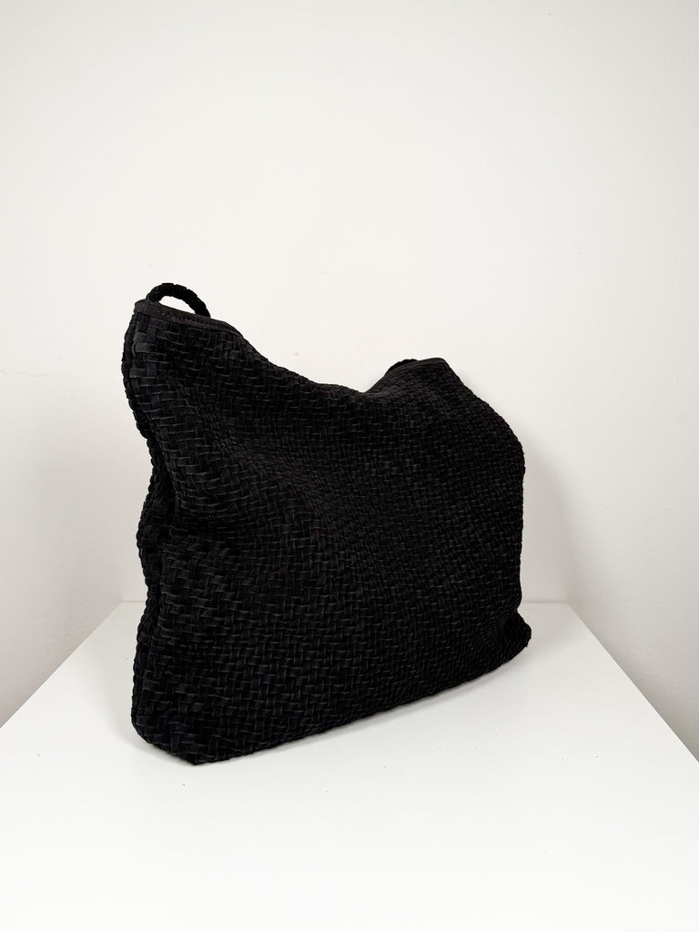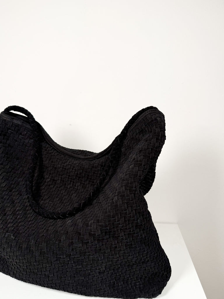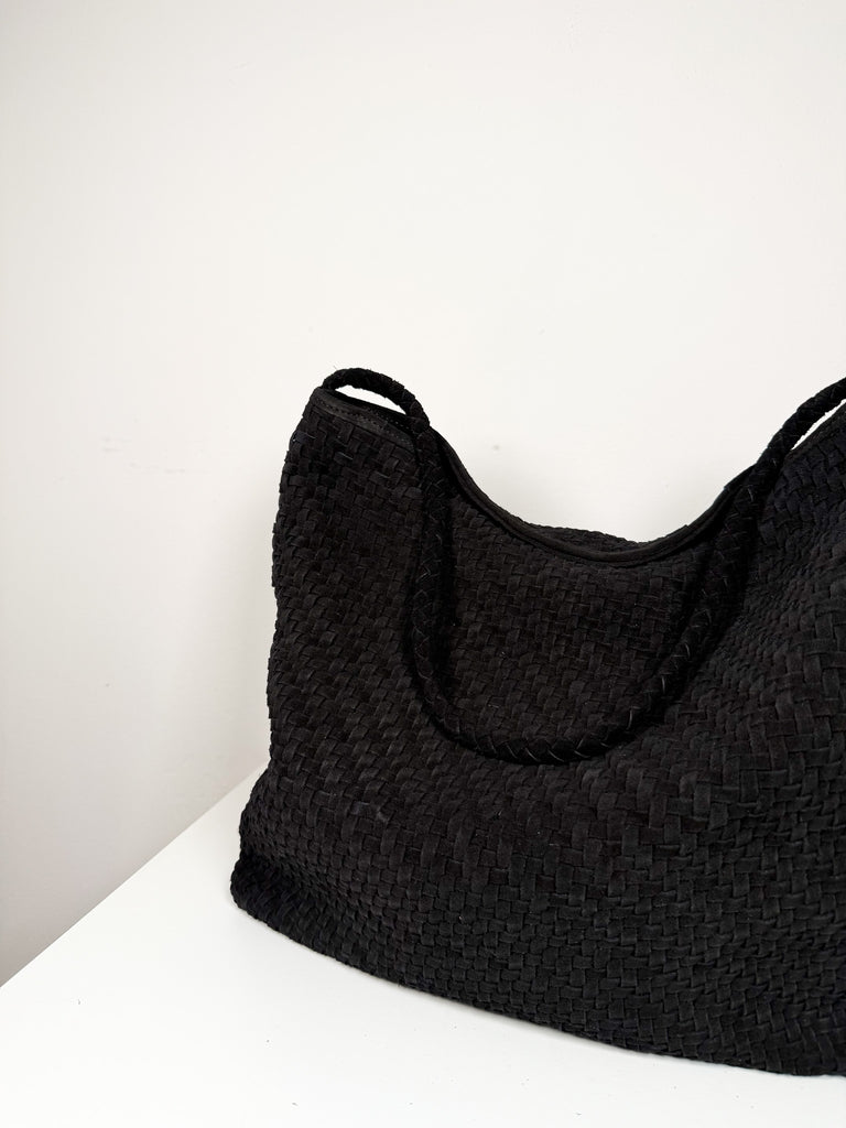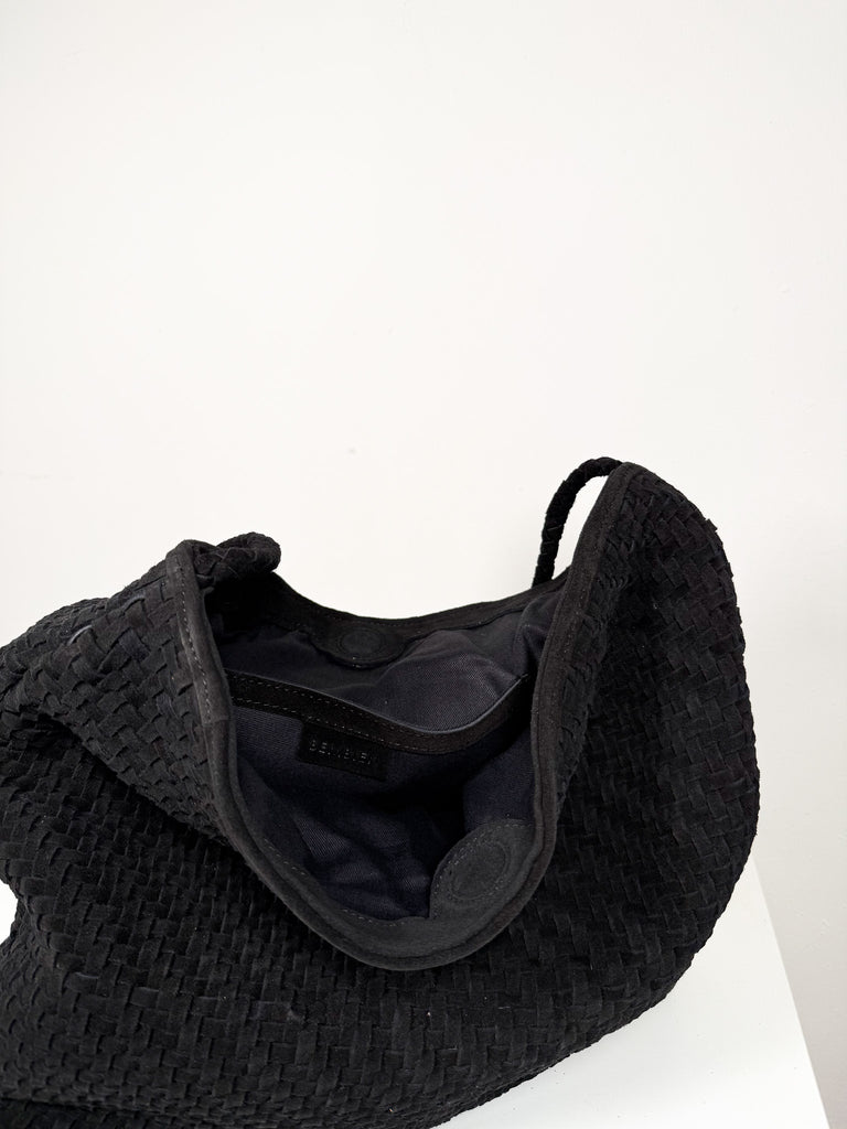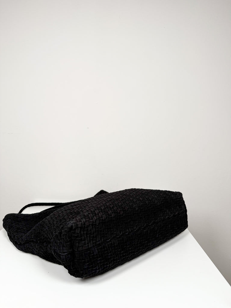 Soft black suede woven tote with single shoulder strap, magnetic closure, and interior pocket.