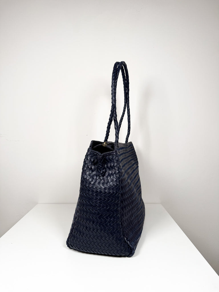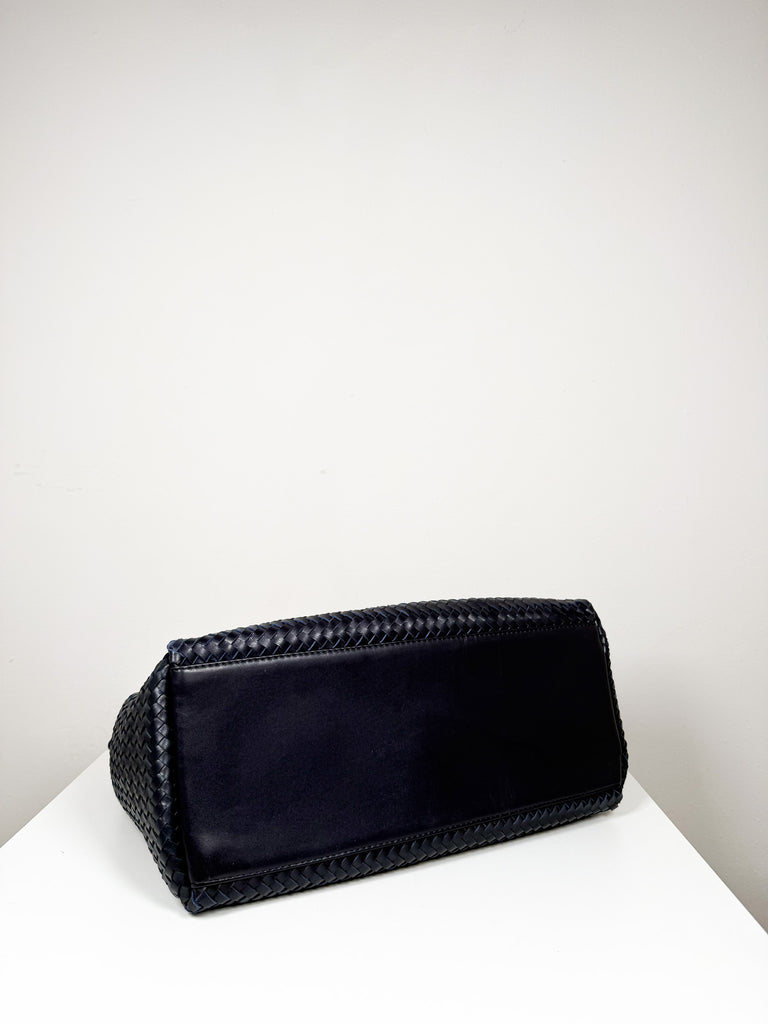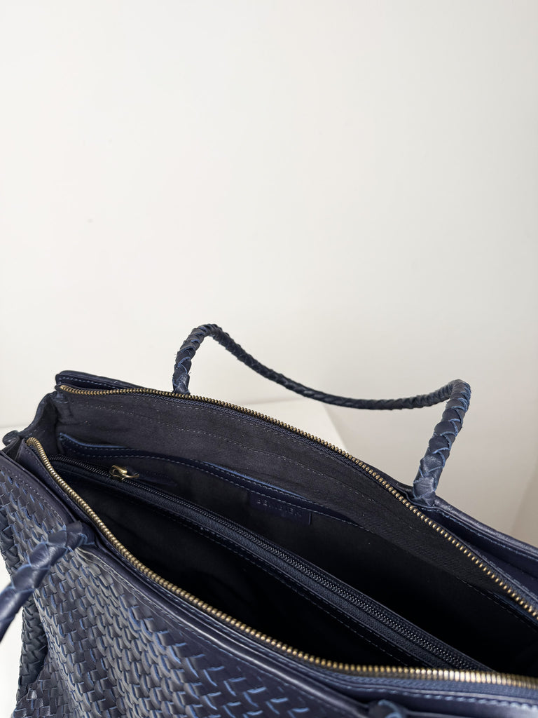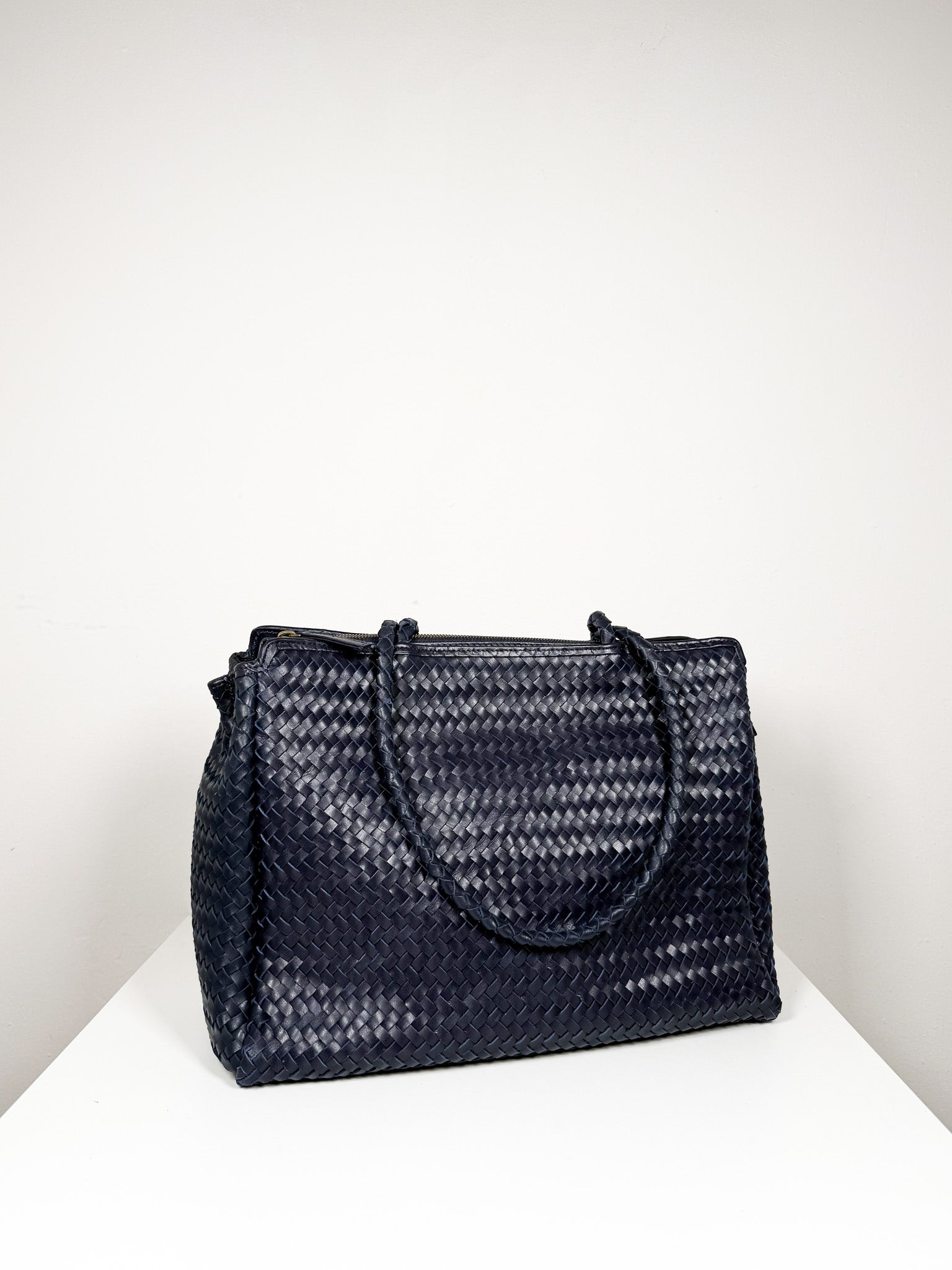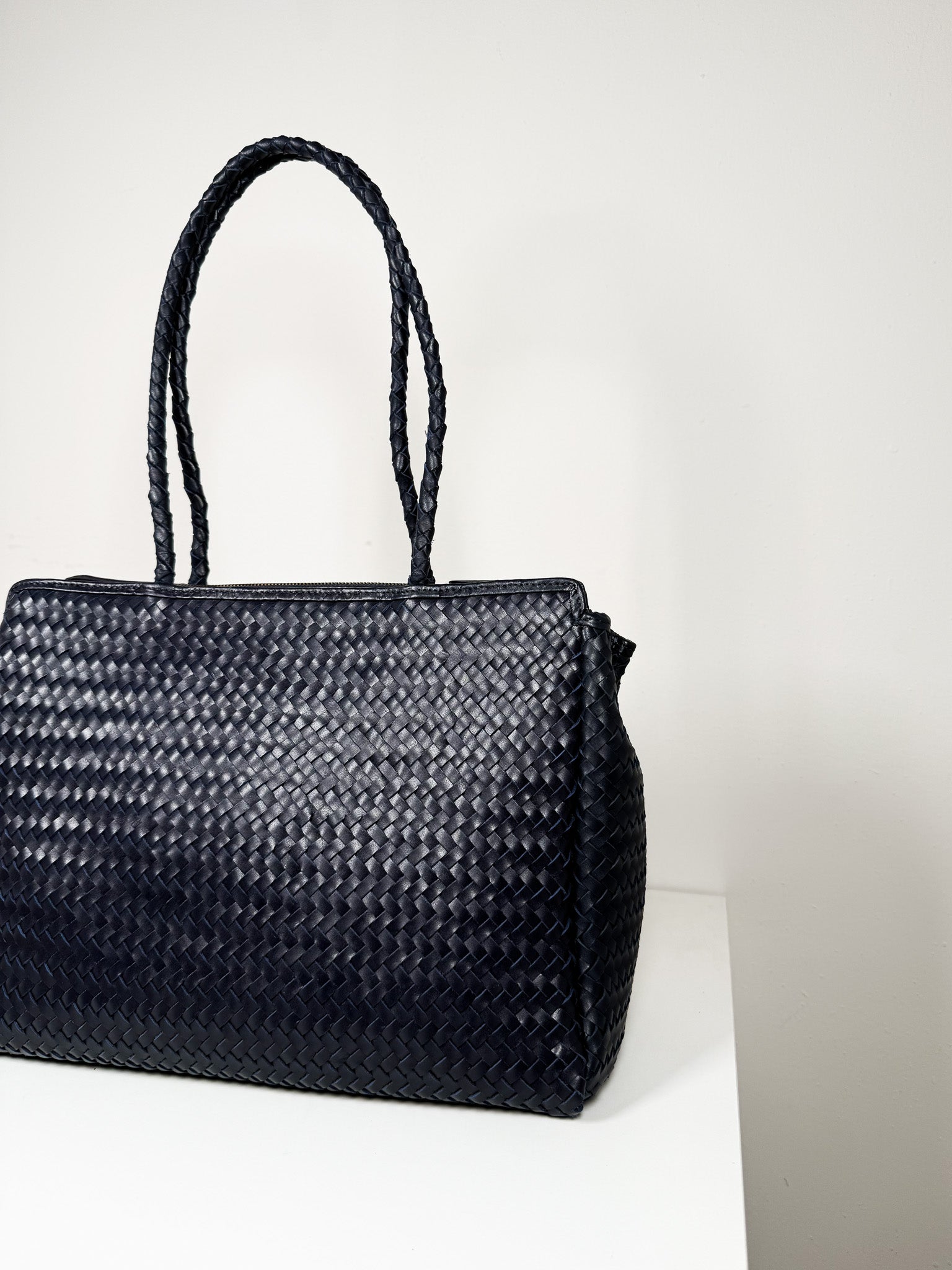 Spacious woven leather tote featuring a secure zipper top, dual shoulder straps for comfortable carrying, and practical interior organization with side pockets plus a zippered compartment.