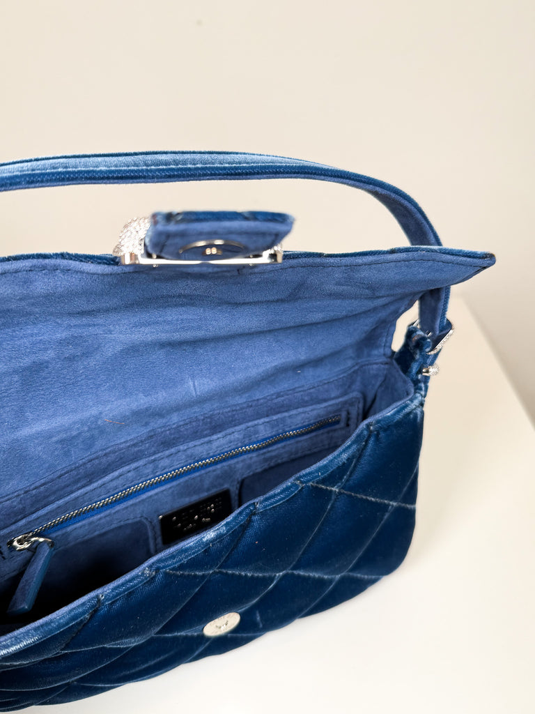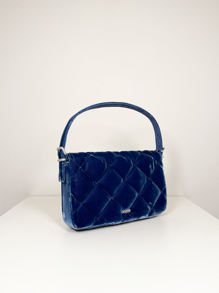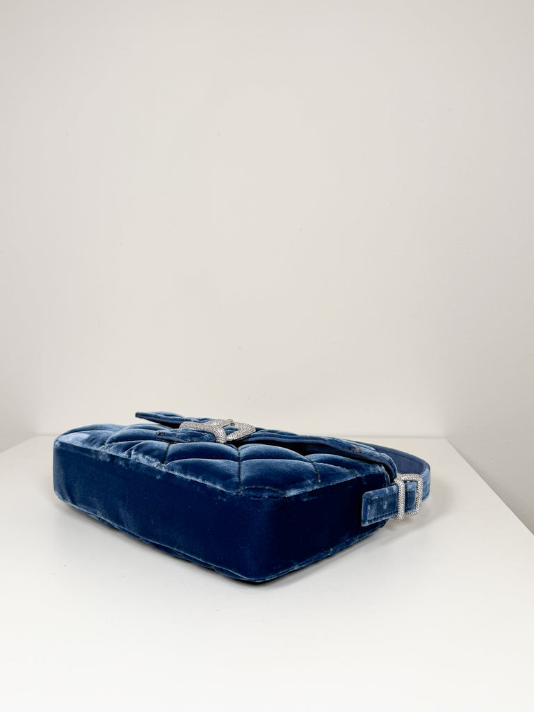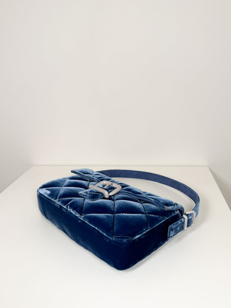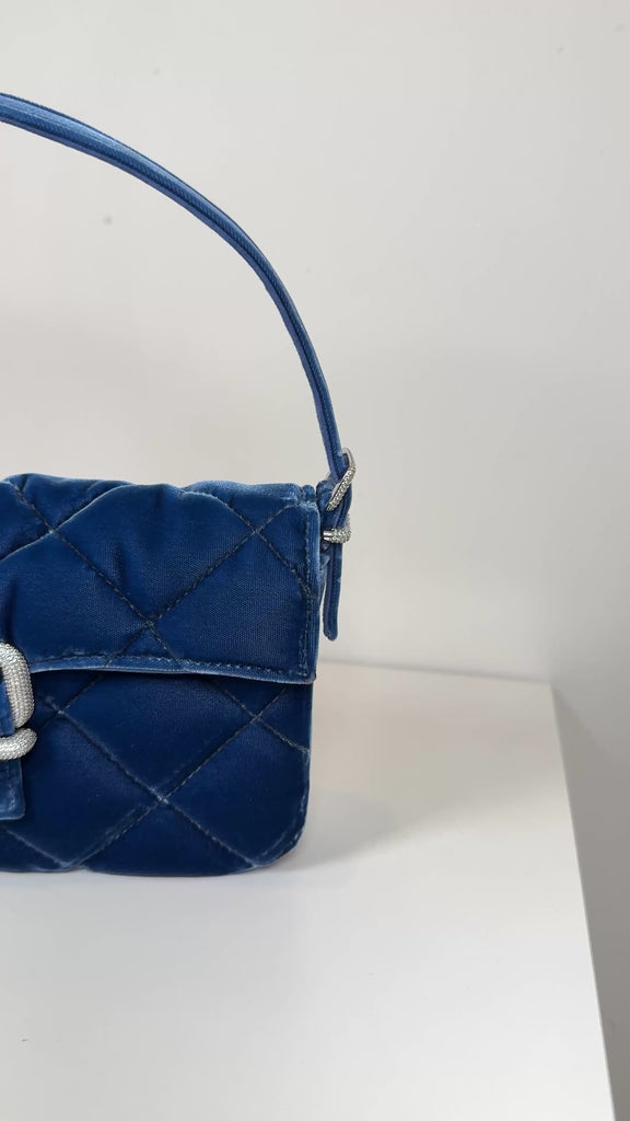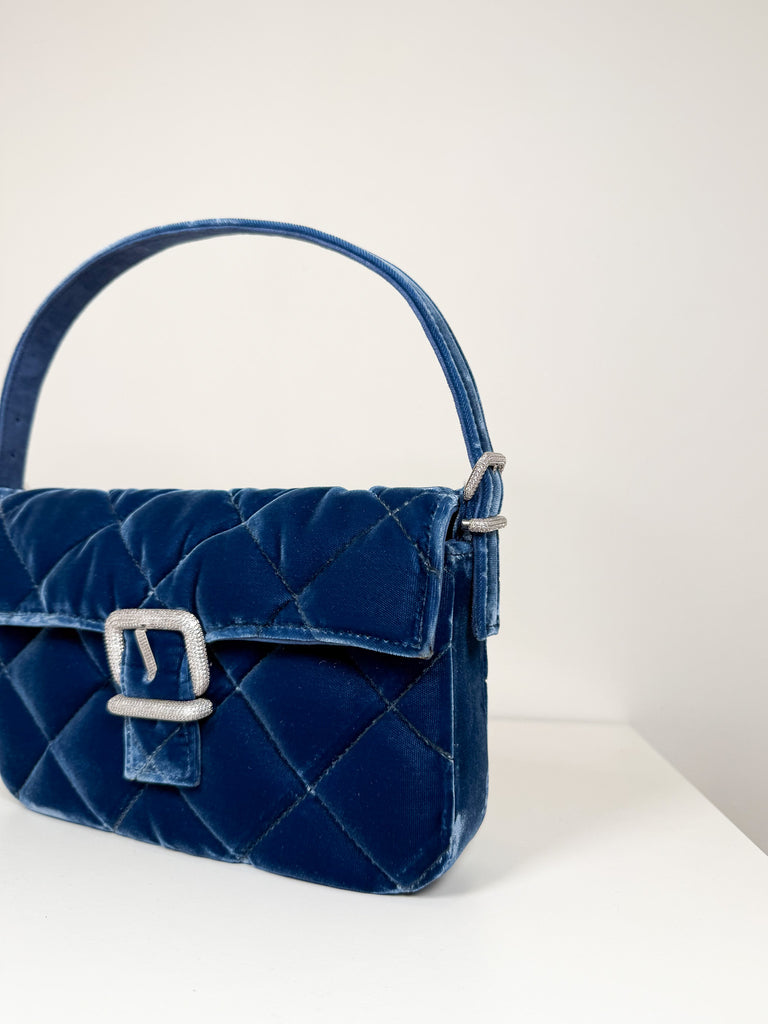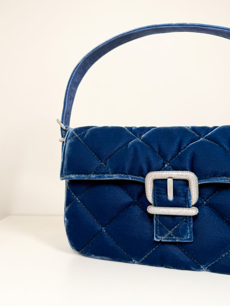 This compact quilted velvet handbag is adorned with a crystal buckle and secured with a magnetic flap. It includes an interior zip pocket and is perfectly sized to hold your phone with ease.