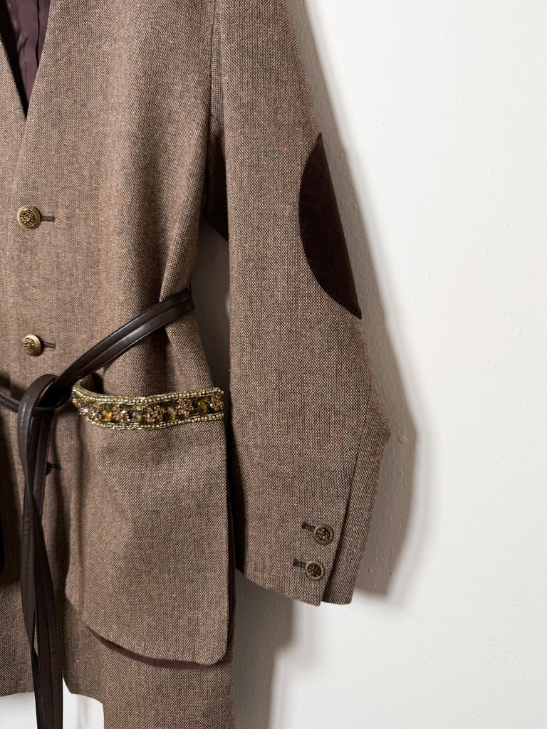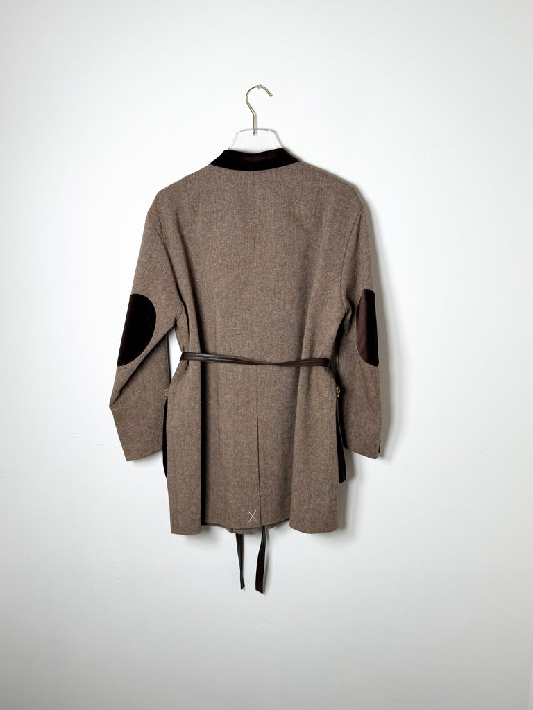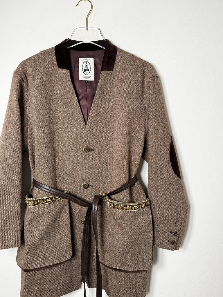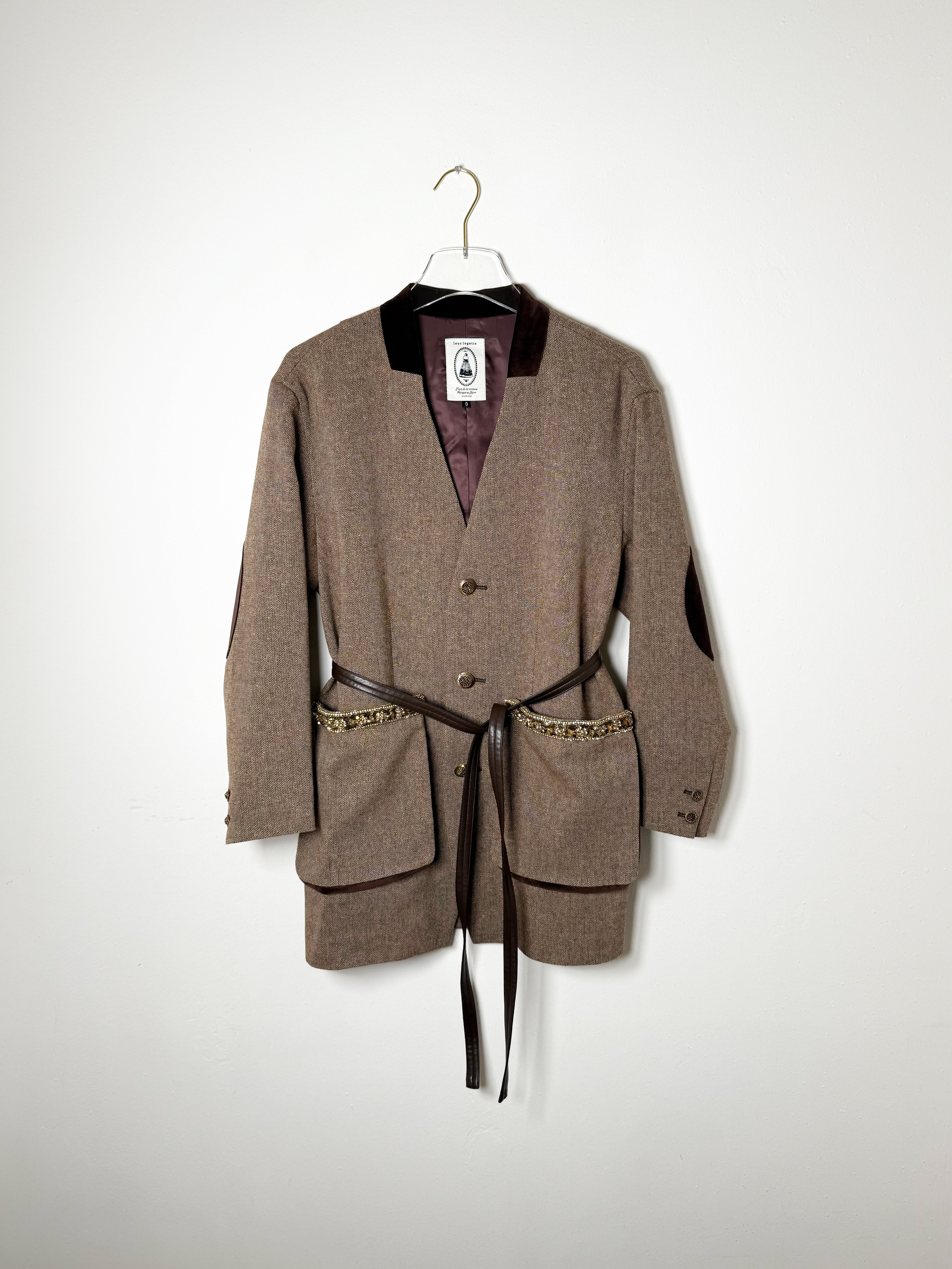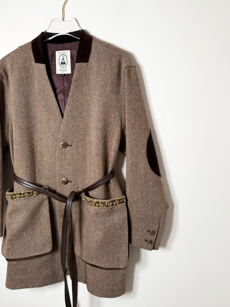 This wool jacket features a velour collar, three buttons, and oversized front pockets adorned with sequin and crystal details. It includes velvet elbow patches and a removable waist belt. Designed with a slightly relaxed, elongated fit.