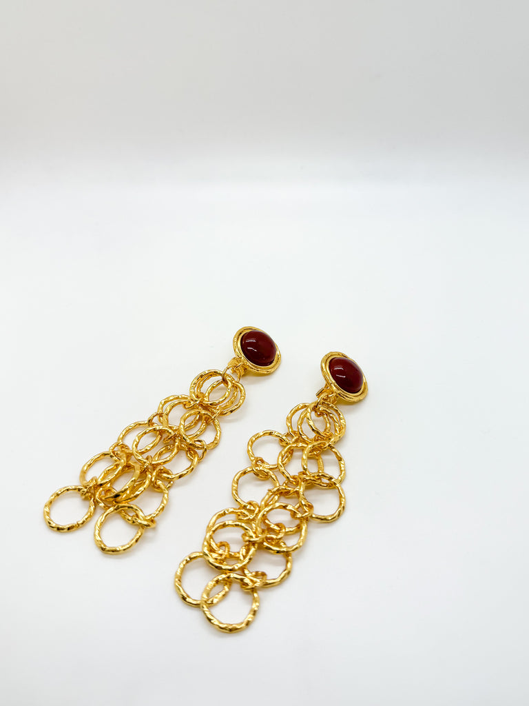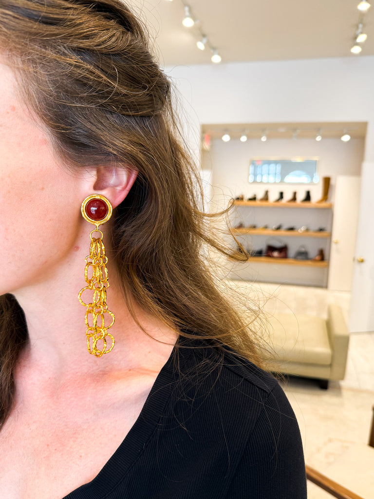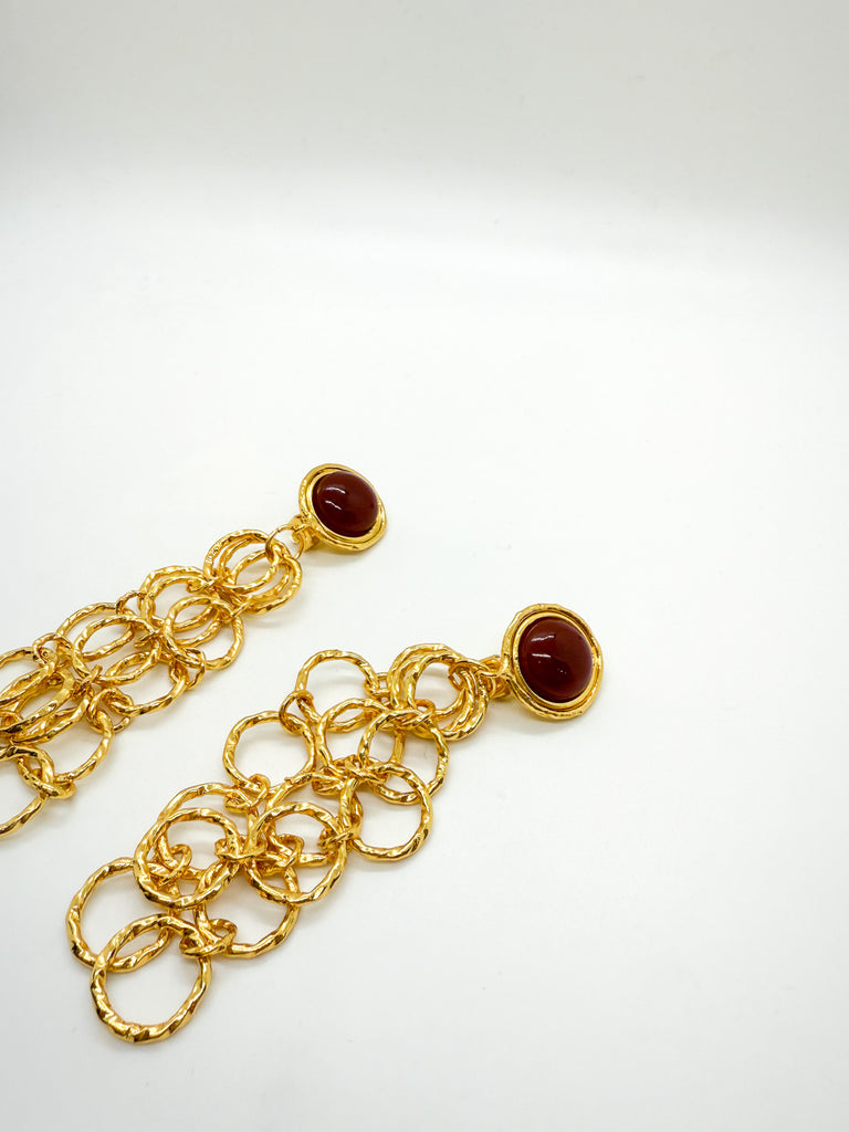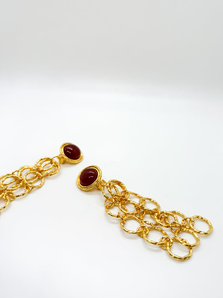 Clip-on earrings with carnelian stones set within linked gold ring chains that extend down the ear.
