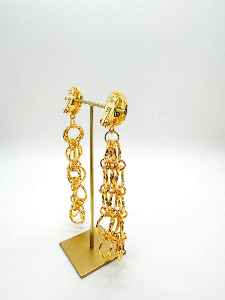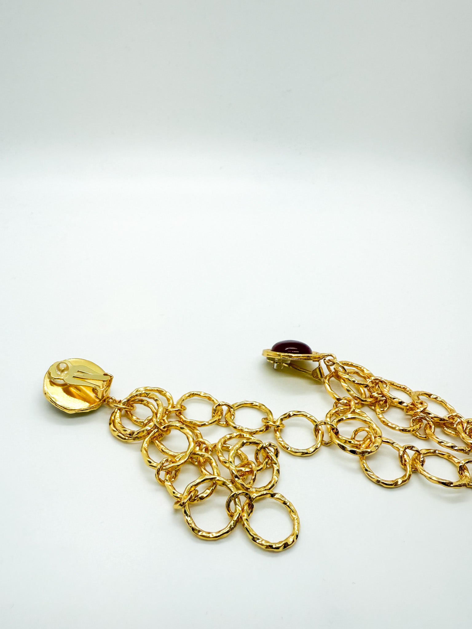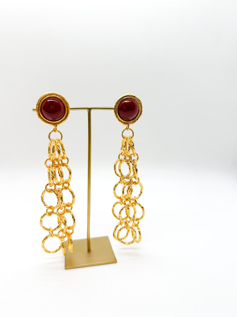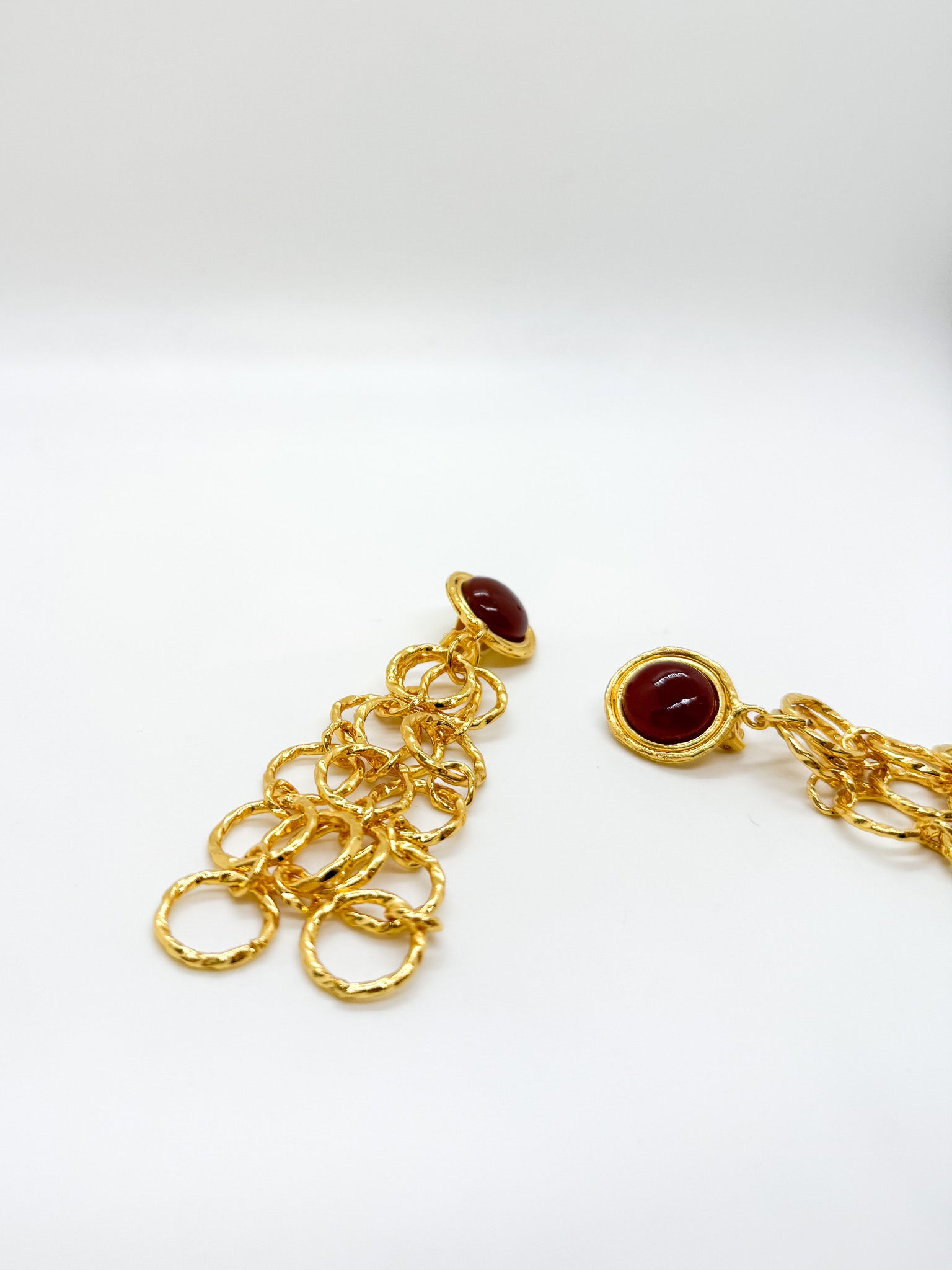 Clip-on earrings with carnelian stones set within linked gold ring chains that extend down the ear.
