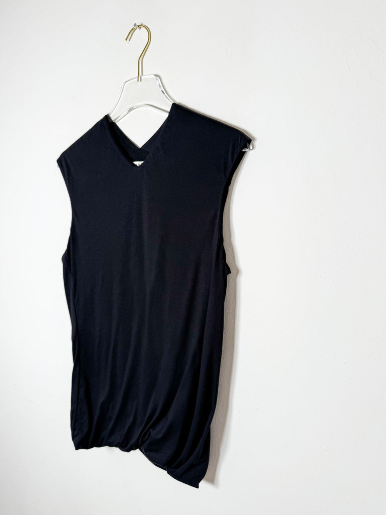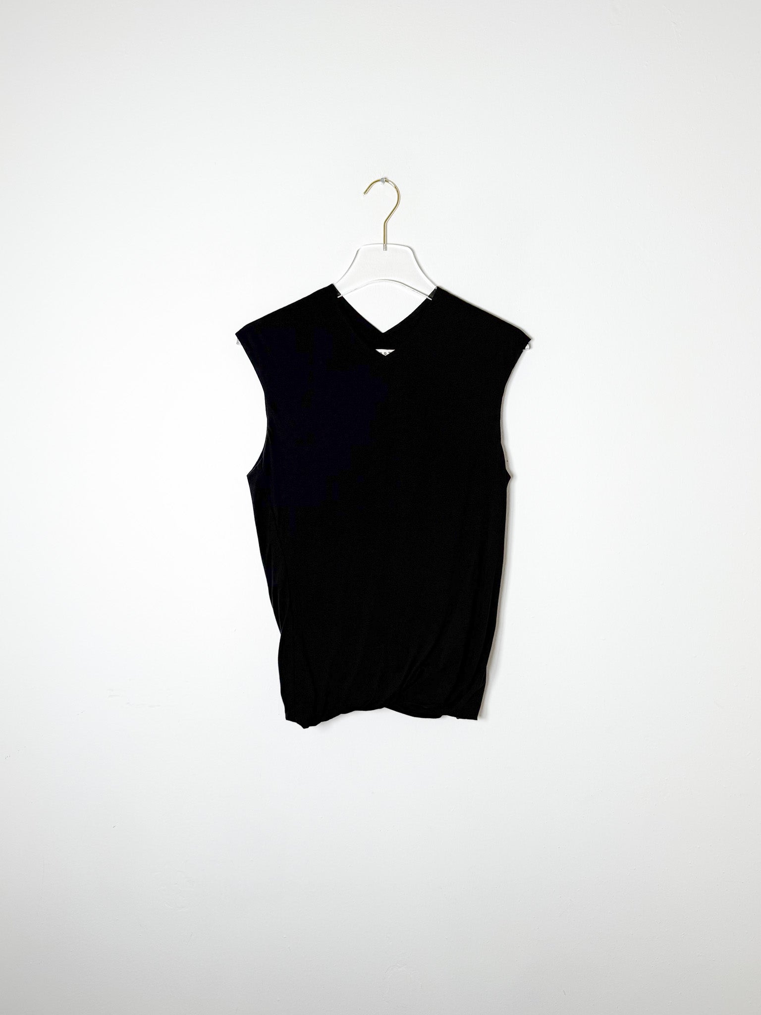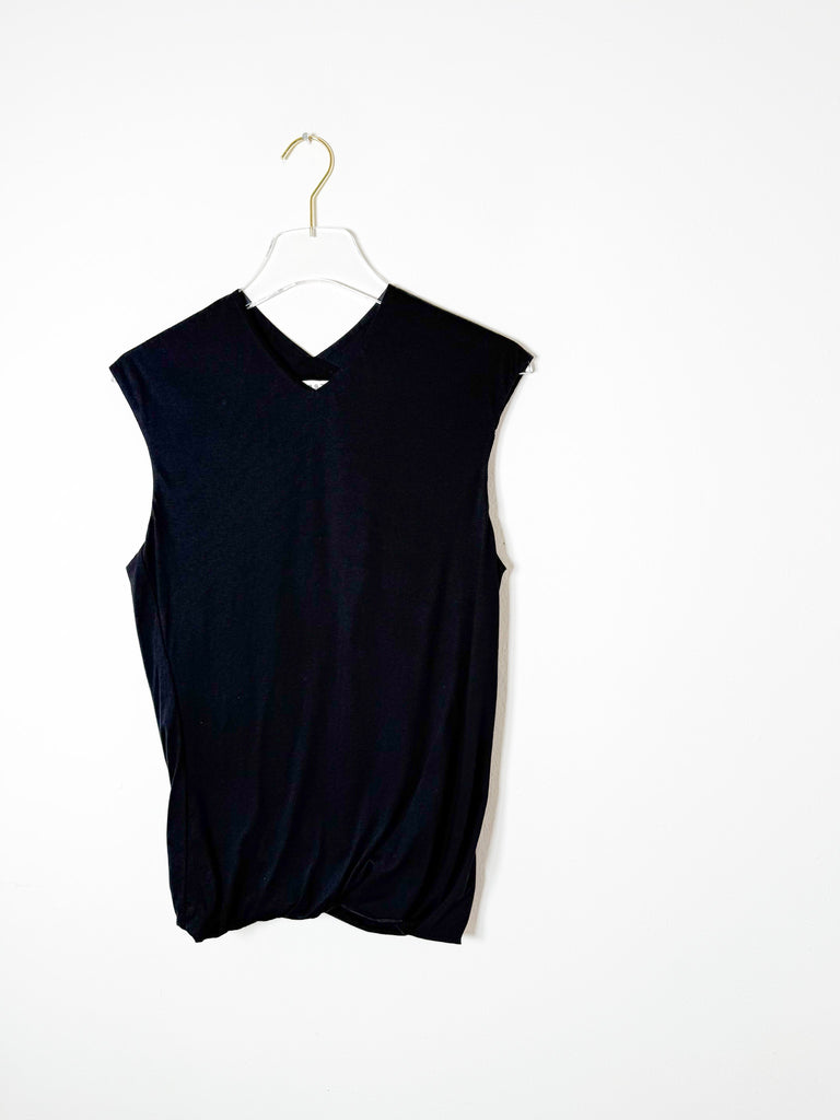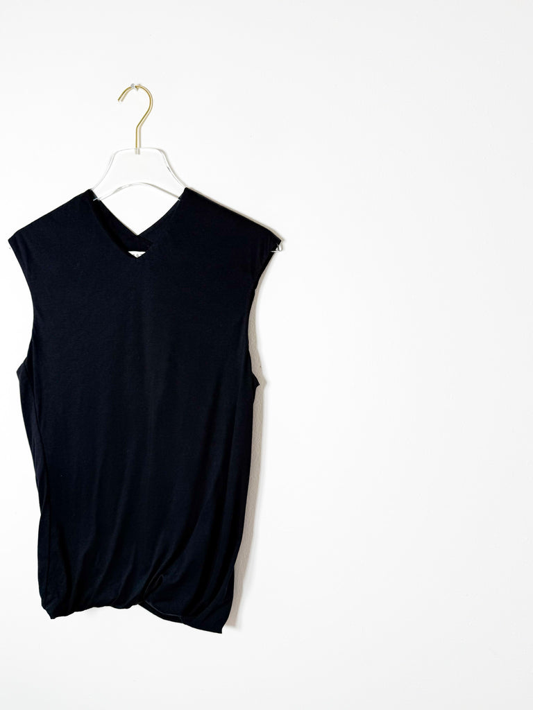This sleeveless v-neck top features a soft cotton knit fabric and a double-layered design with a twisted hem. Versatile enough to dress up or down, it offers a fresh twist on a timeless look.