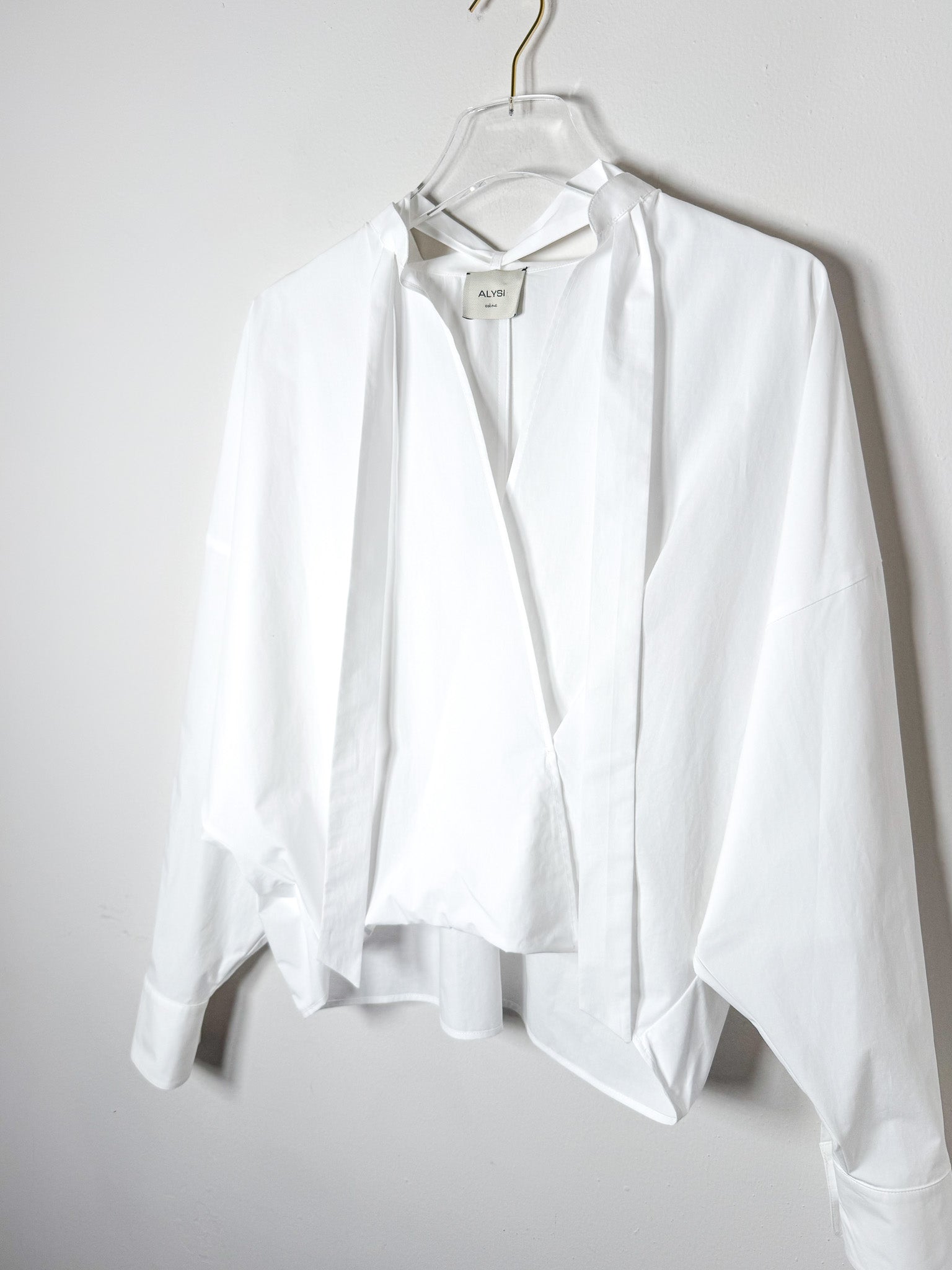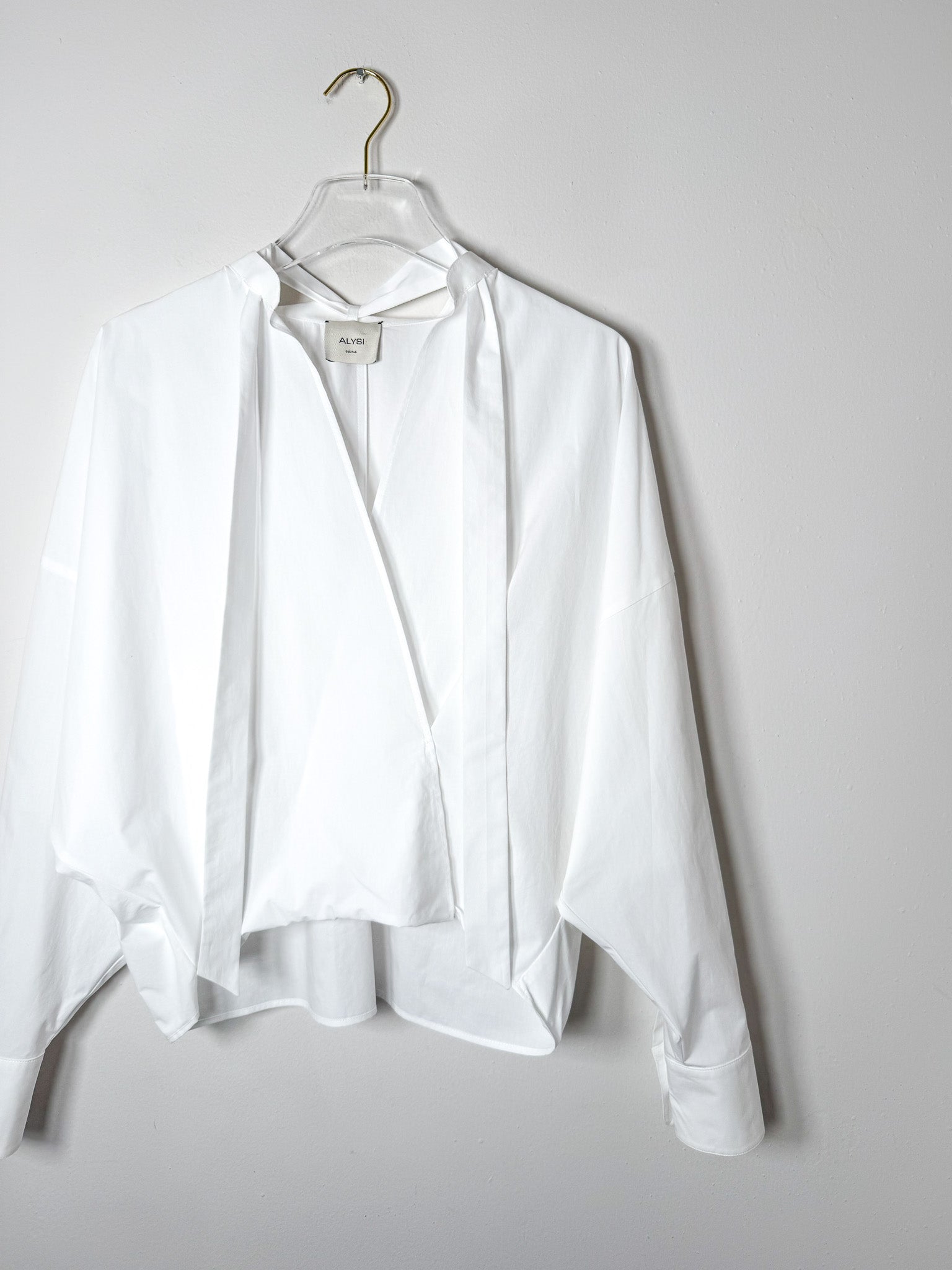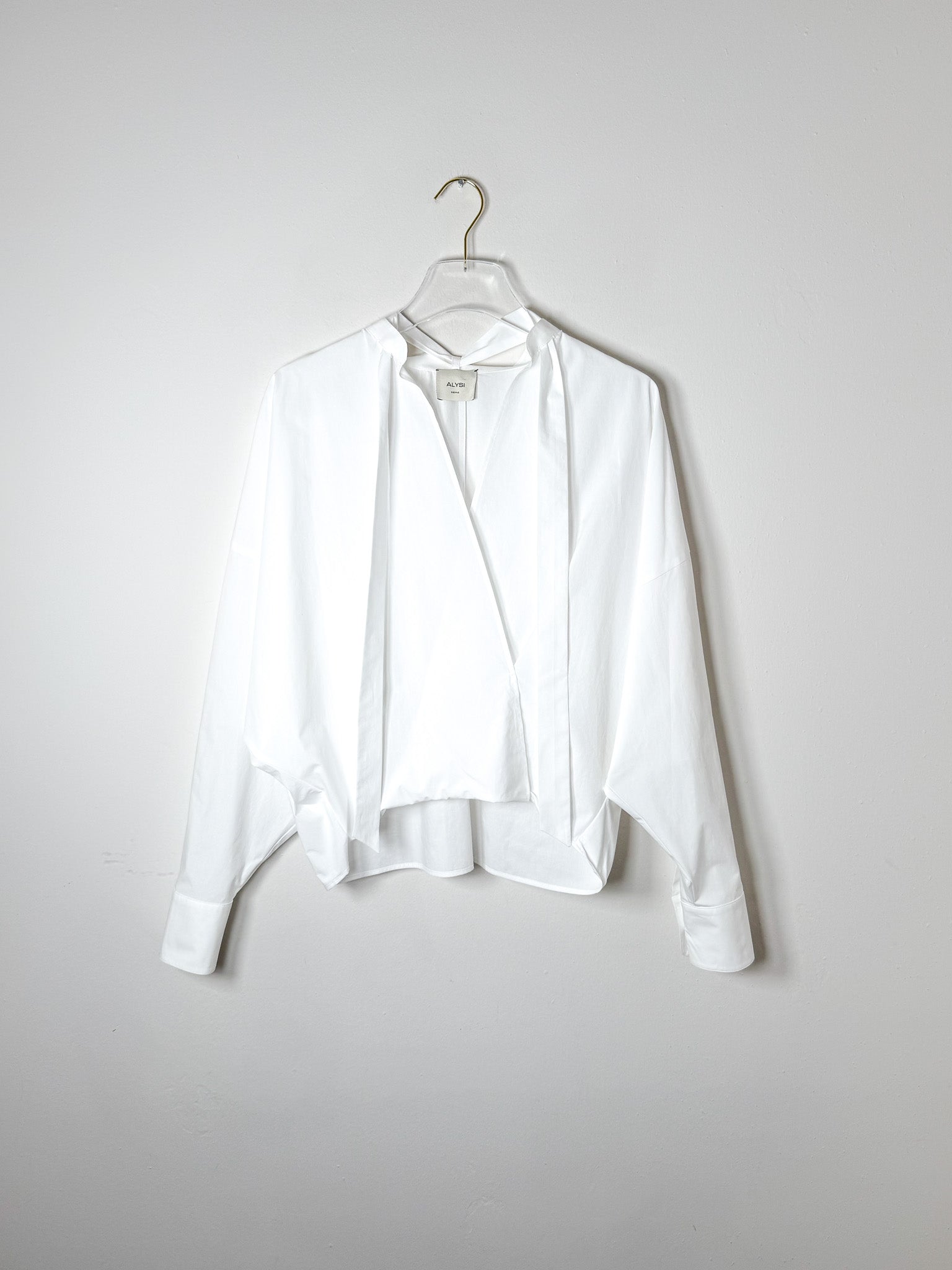 Cotton poplin blouse featuring long sleeves and a graceful tie accent at the neckline. Clean, versatile styling that works across seasons.