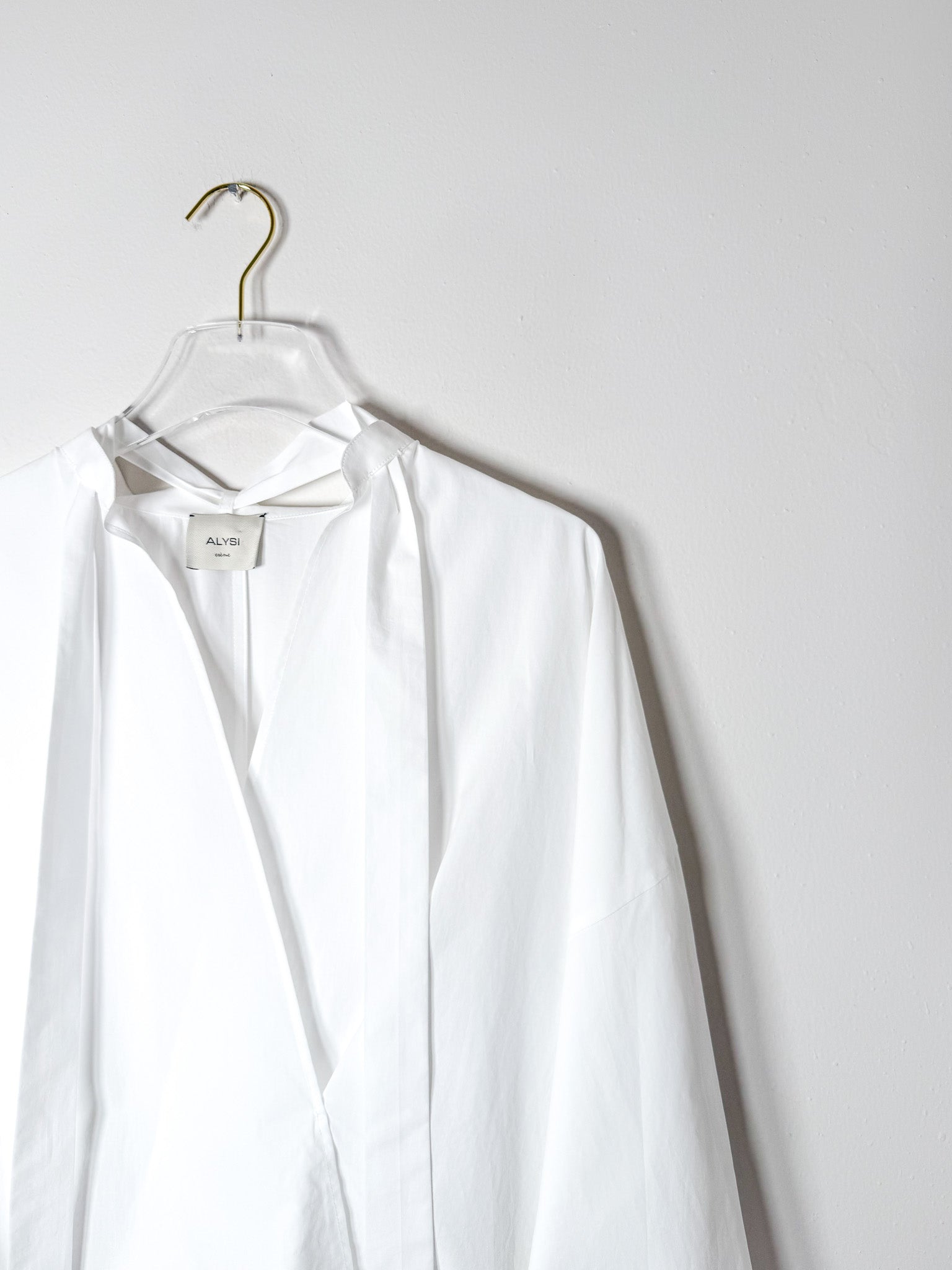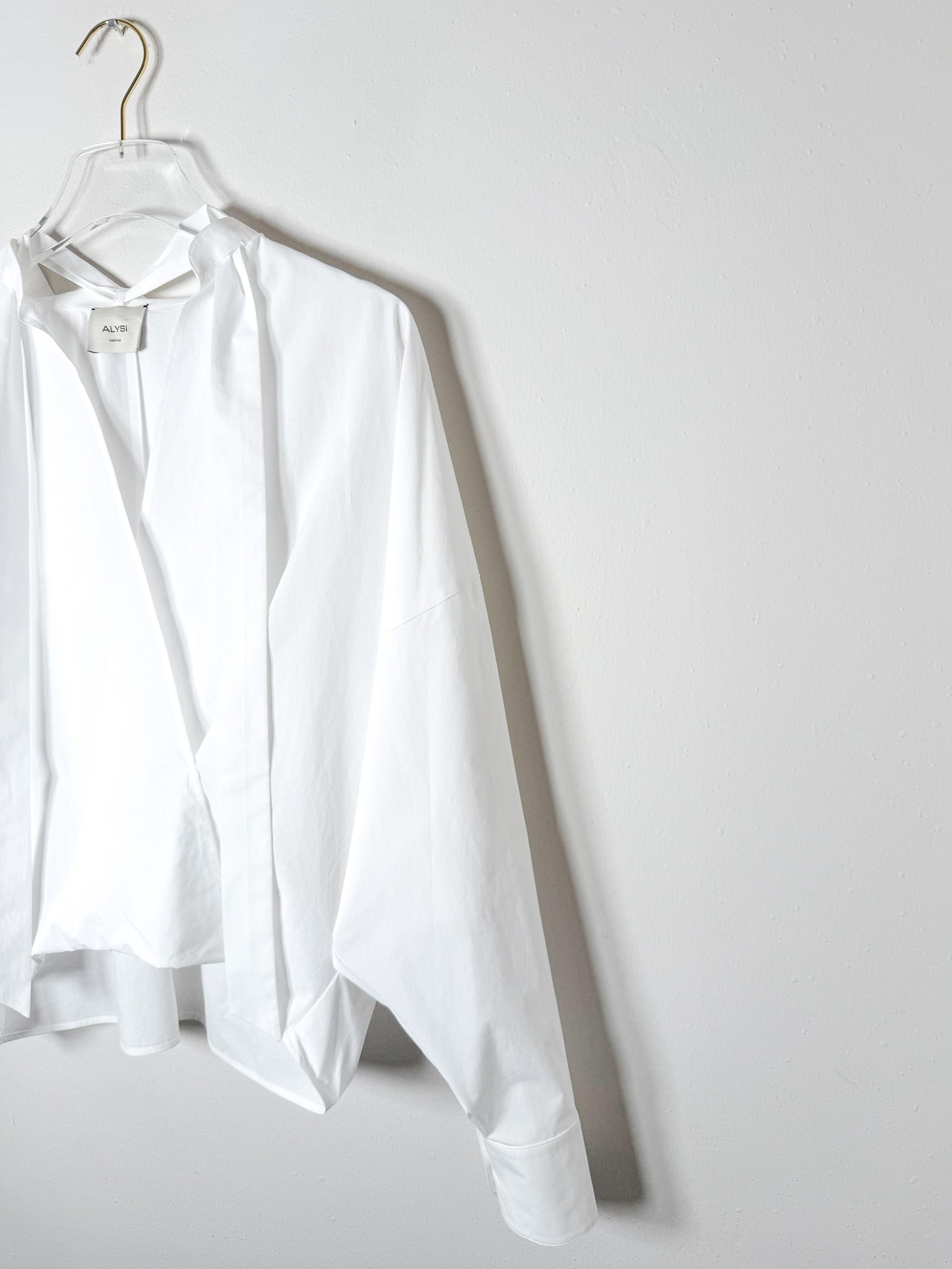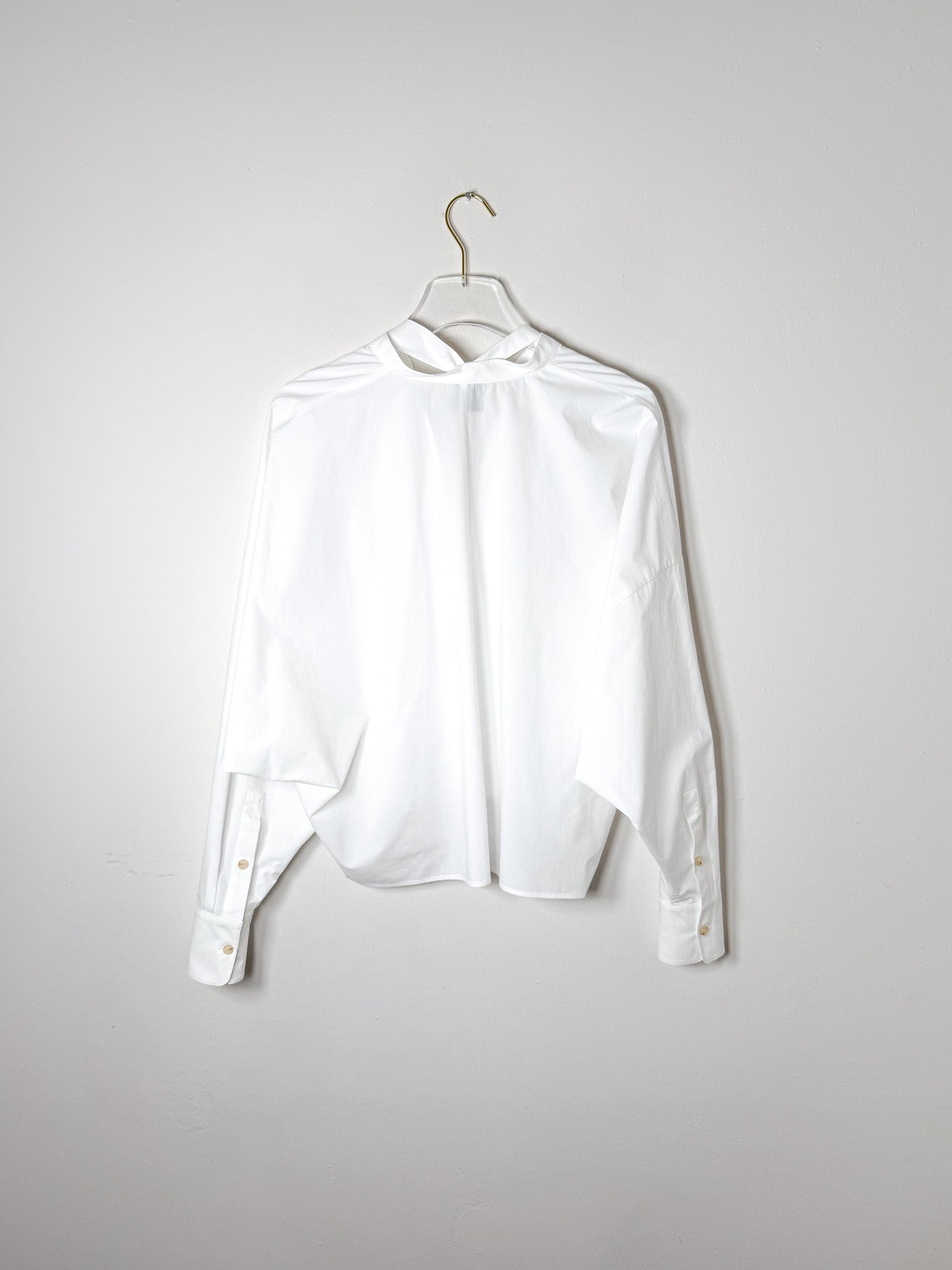 Cotton poplin blouse featuring long sleeves and a graceful tie accent at the neckline. Clean, versatile styling that works across seasons.