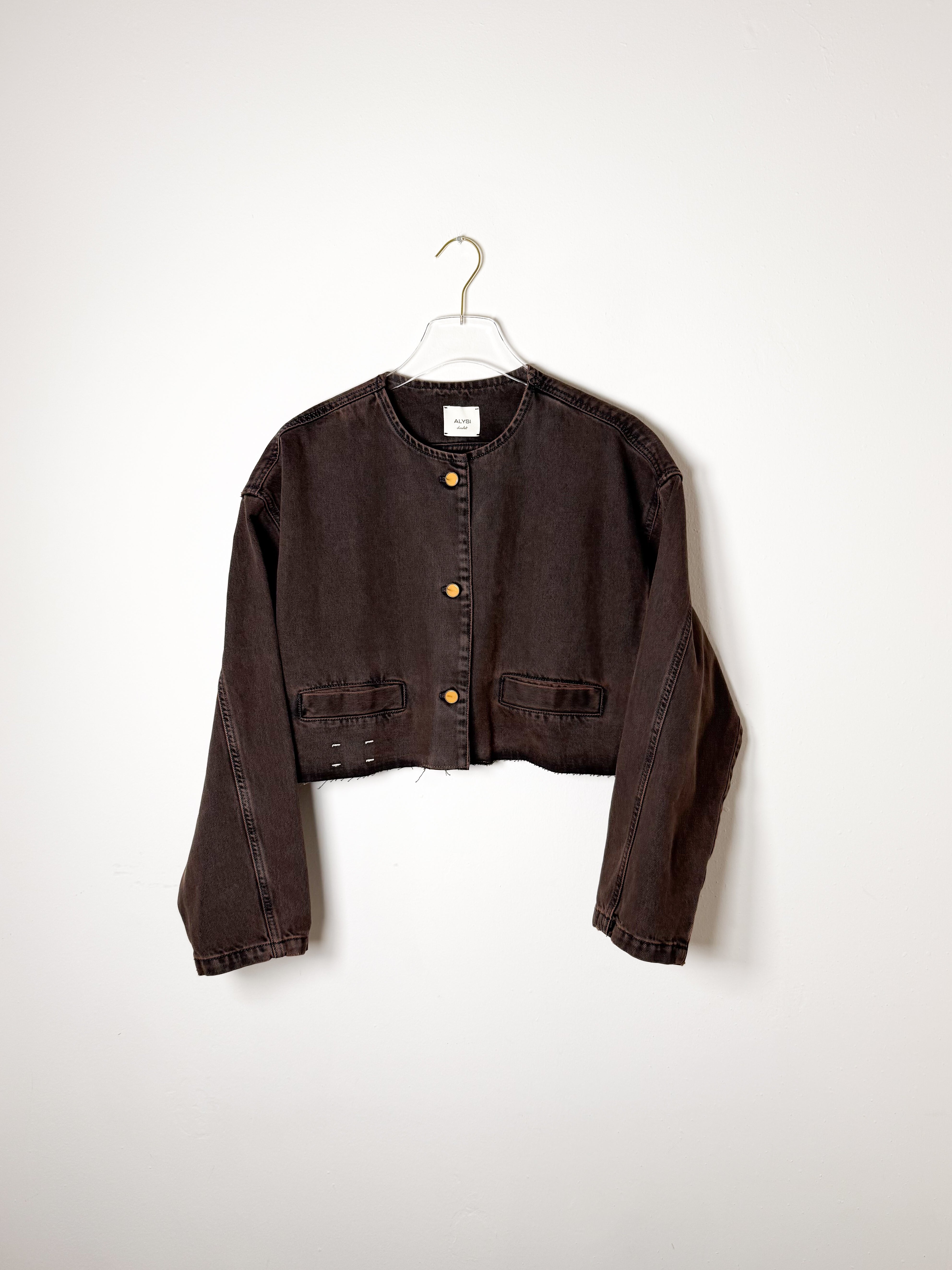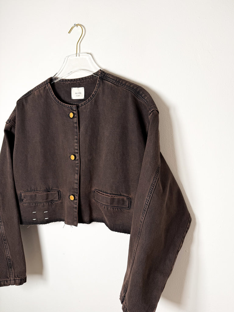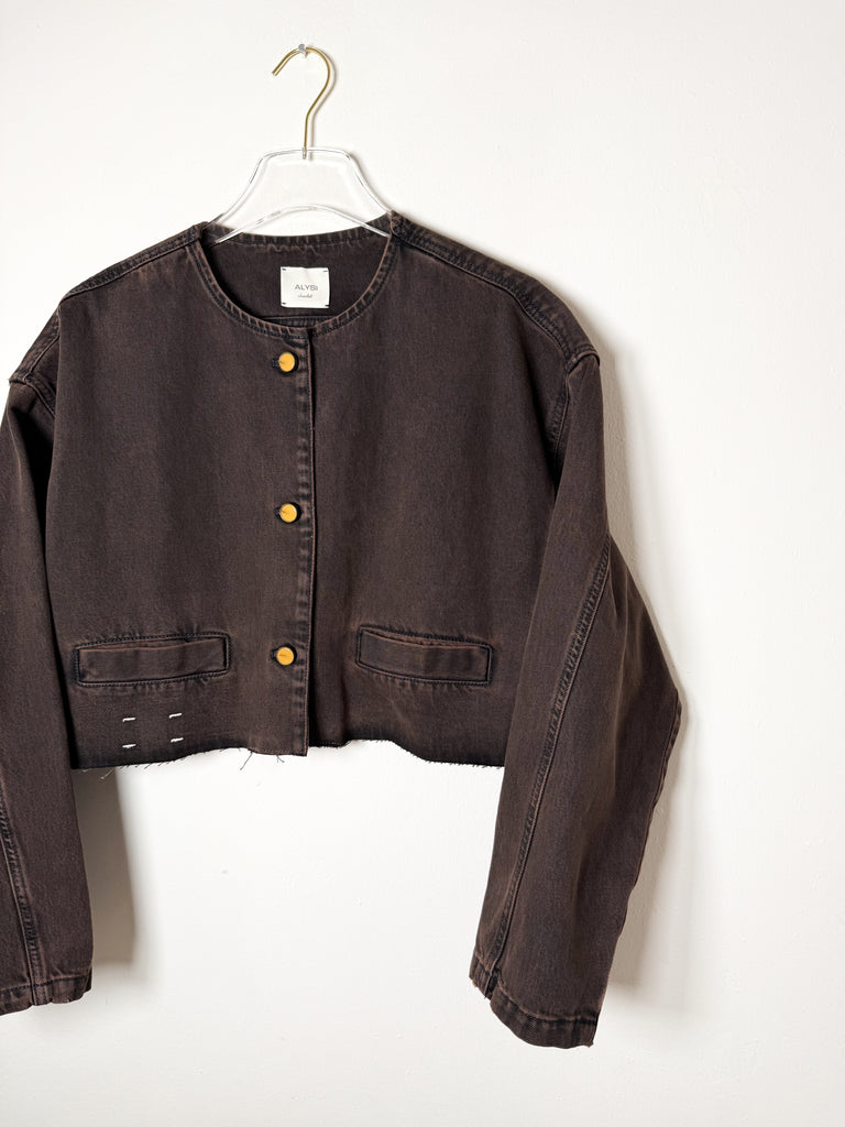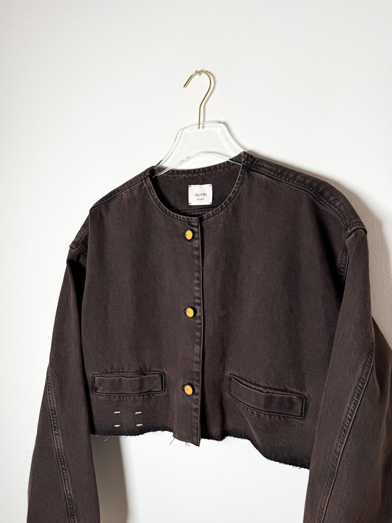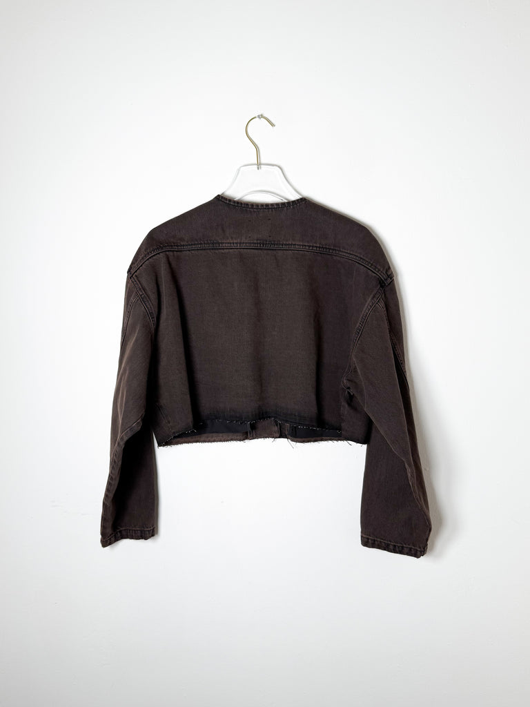 This brown cropped denim jacket features three contrasting buttons and a distressed fabric finish. Designed with a raw hem and a boxy silhouette, it combines casual ease with subtle edge.