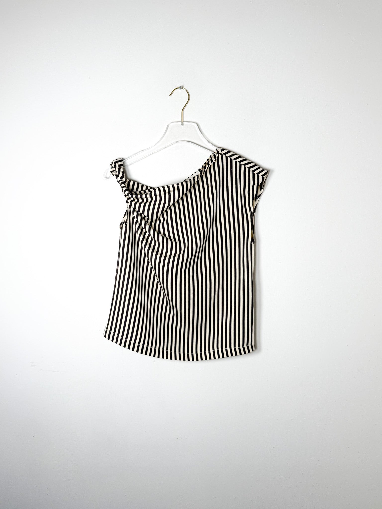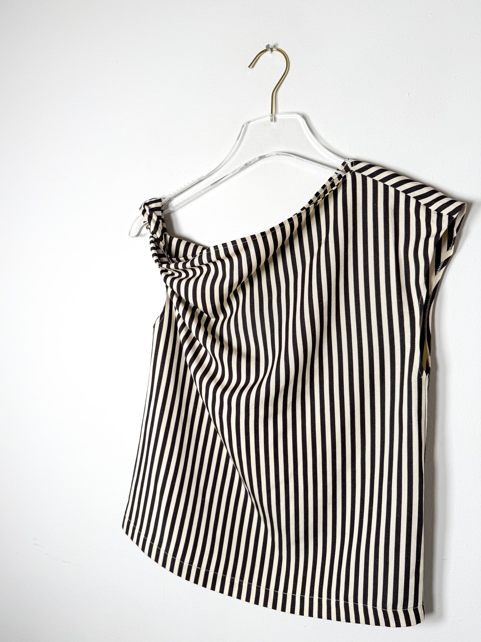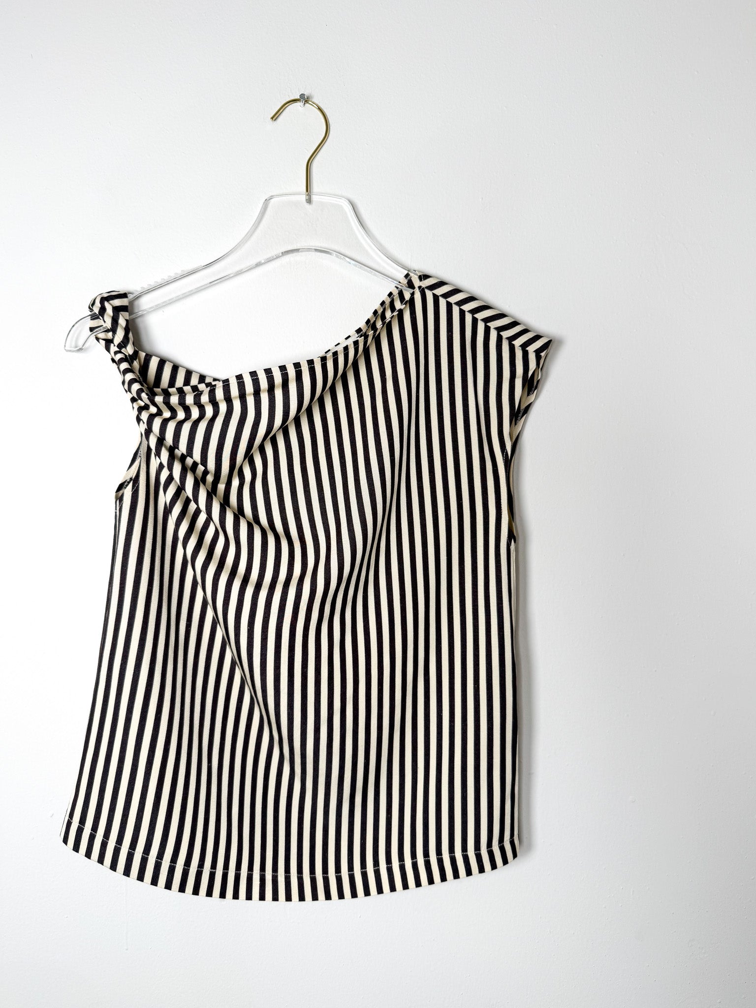 Chocolate-hued top with an off-center silhouette and striped pattern. A twisted shoulder accent adds subtle dimension to this asymmetrical design.