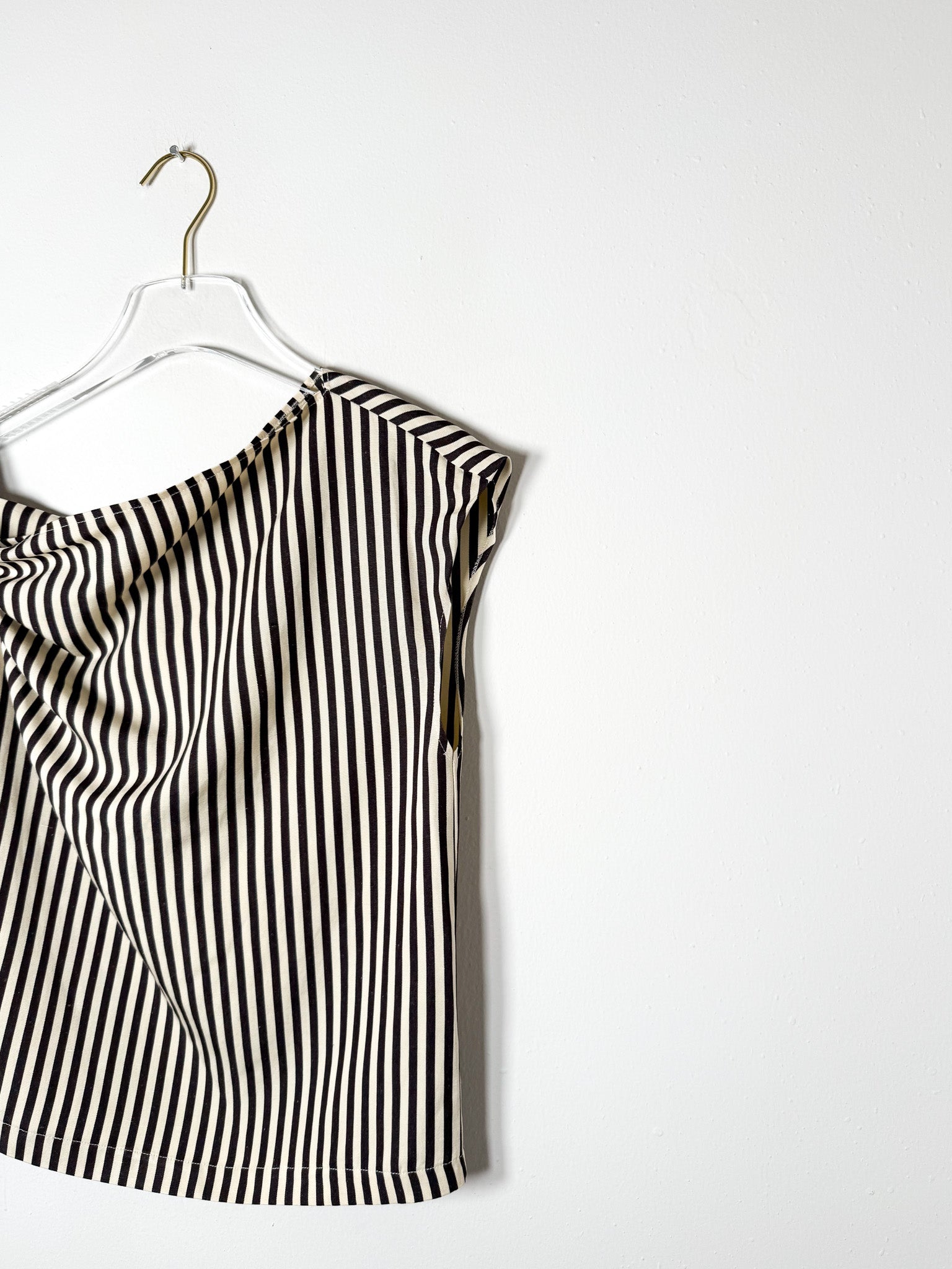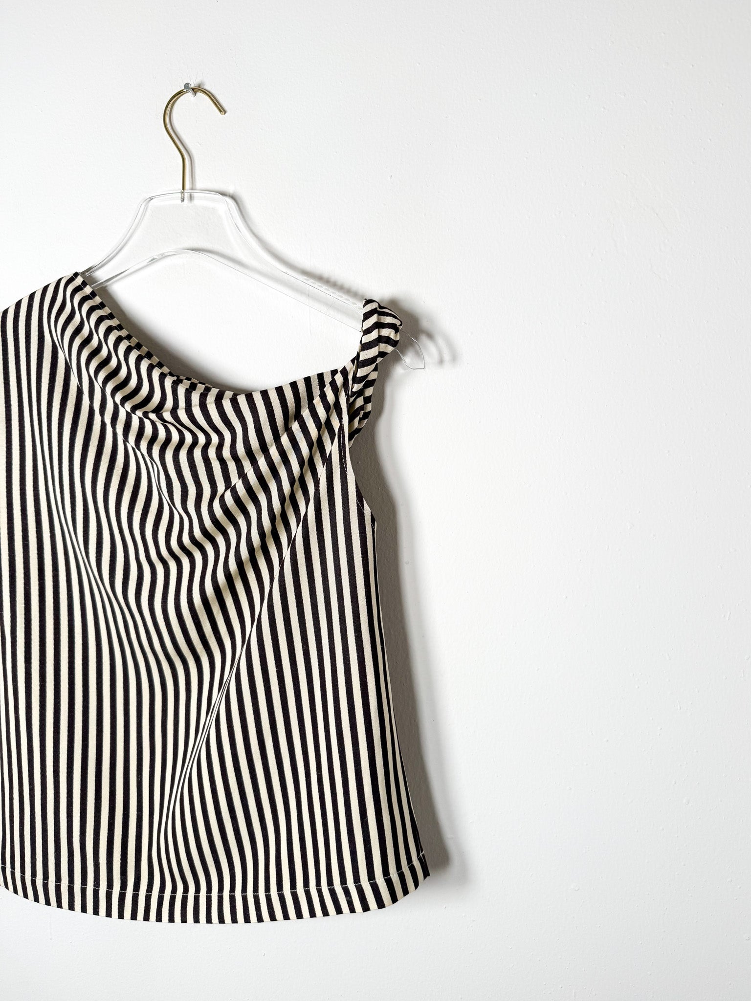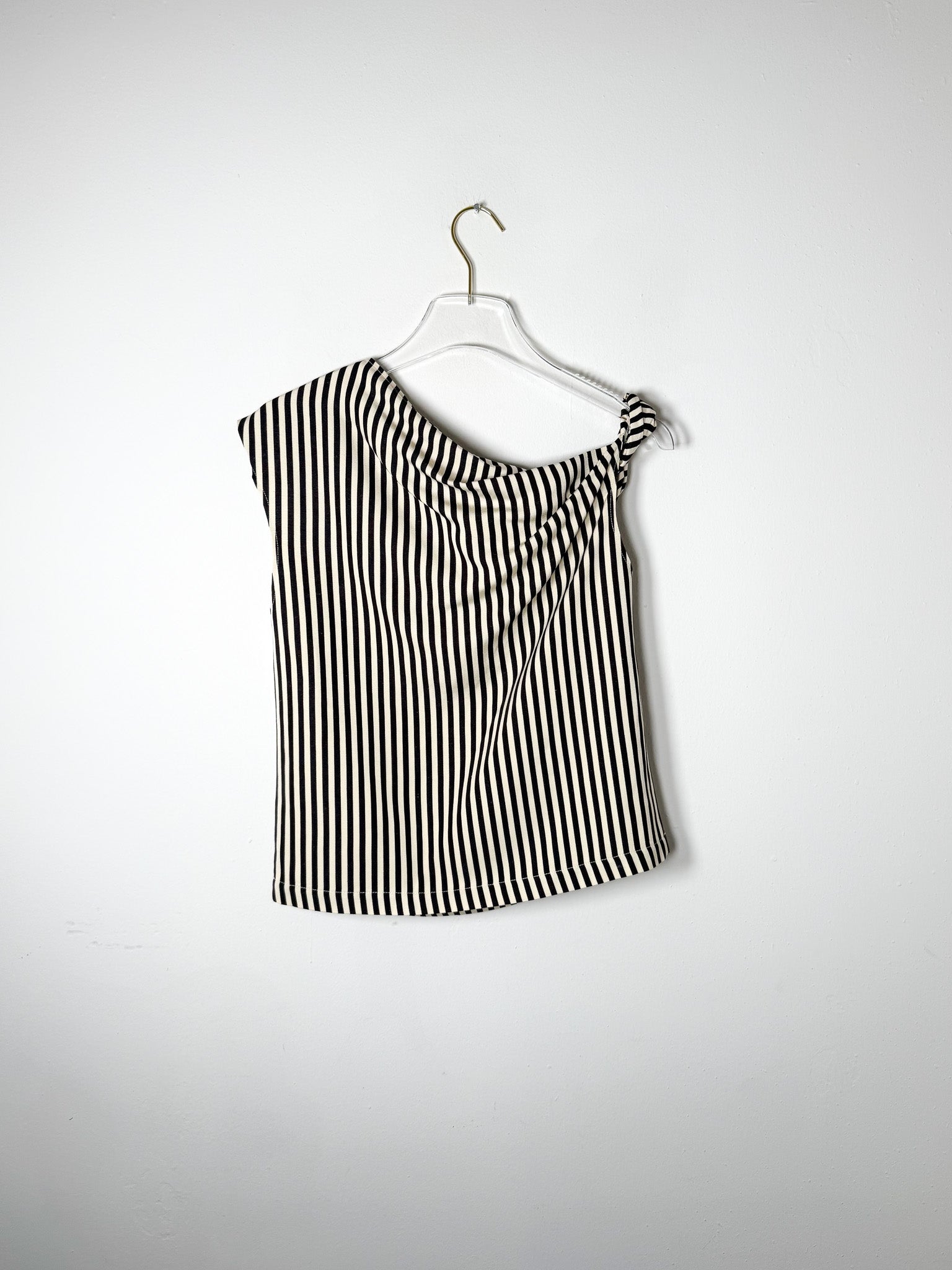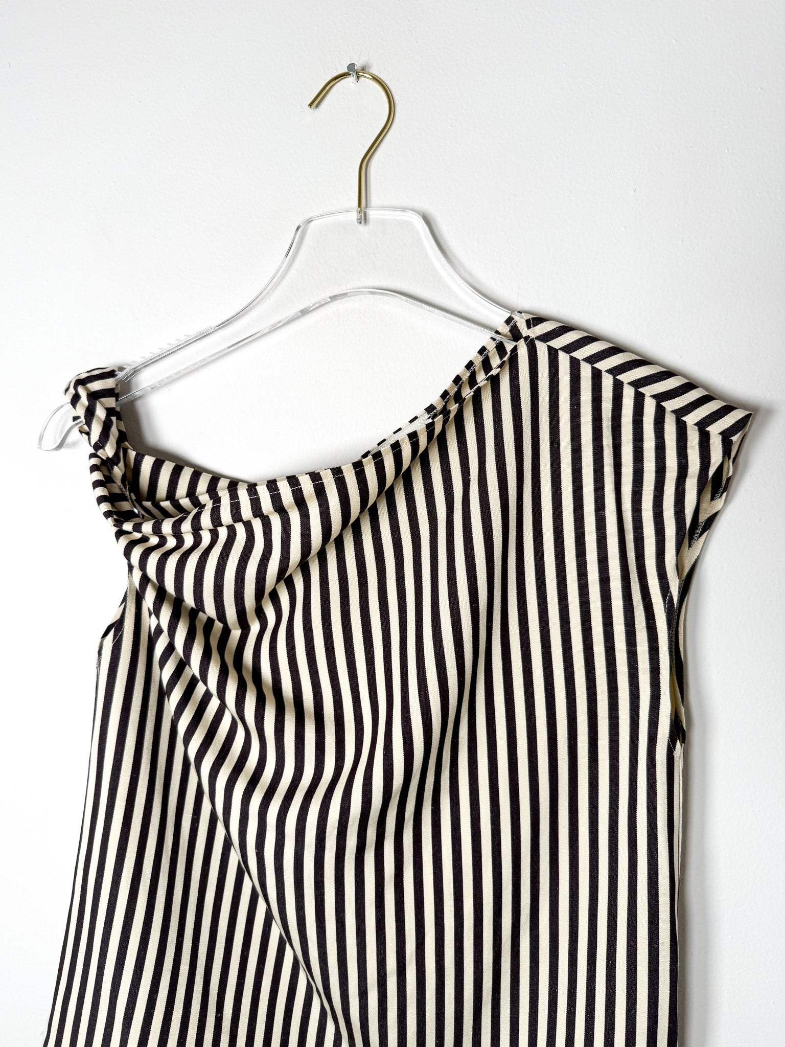Chocolate-hued top with an off-center silhouette and striped pattern. A twisted shoulder accent adds subtle dimension to this asymmetrical design.