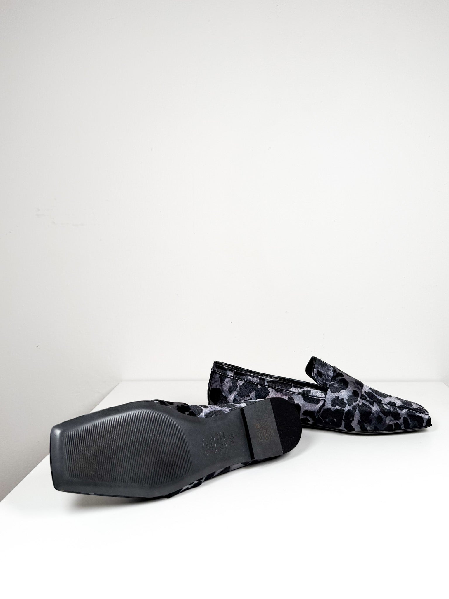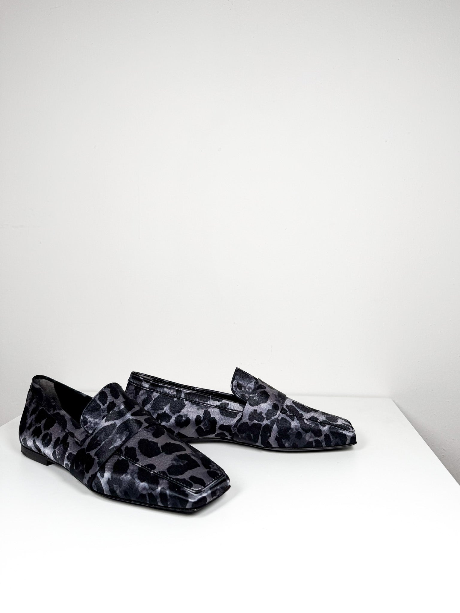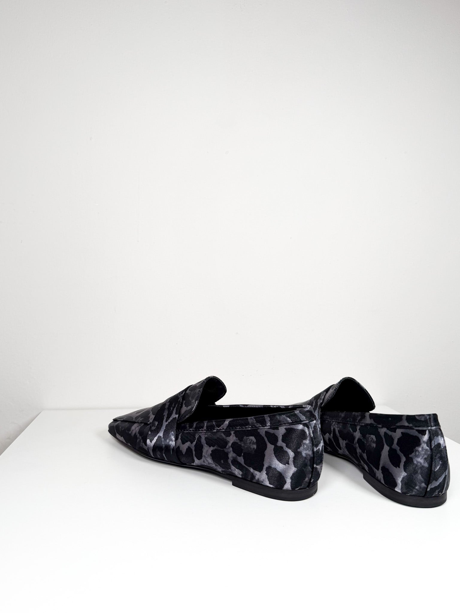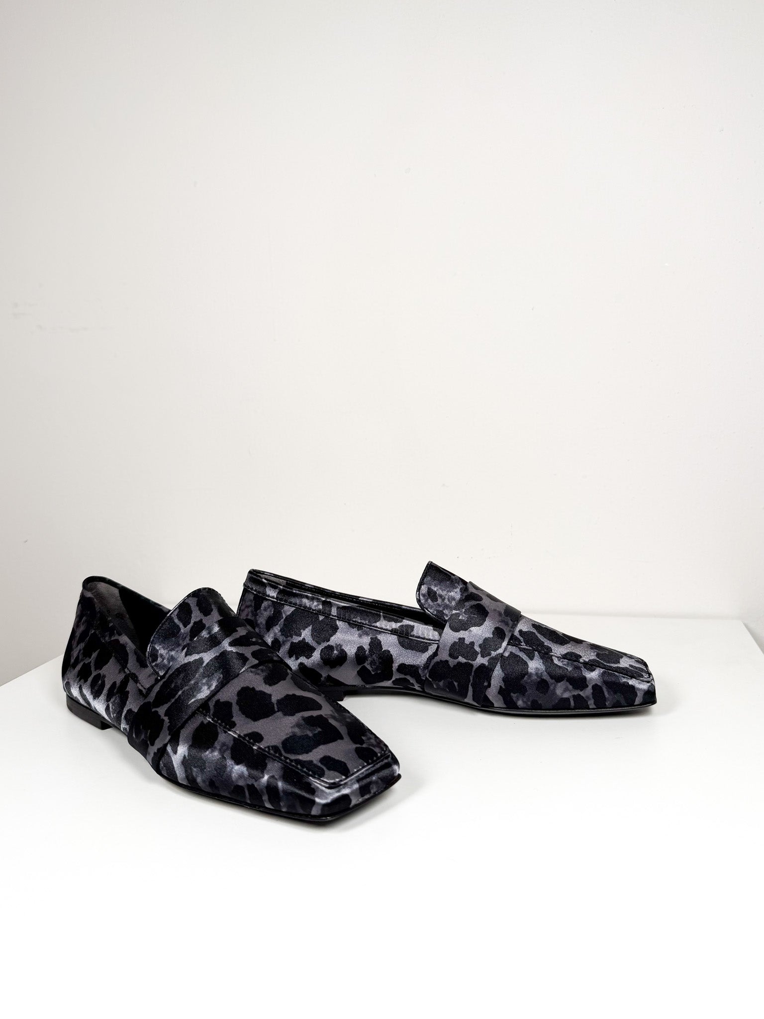 Sleek leopard-print silk mules featuring a structured square toe. A refined slip-on that balances animal print boldness with minimalist design.