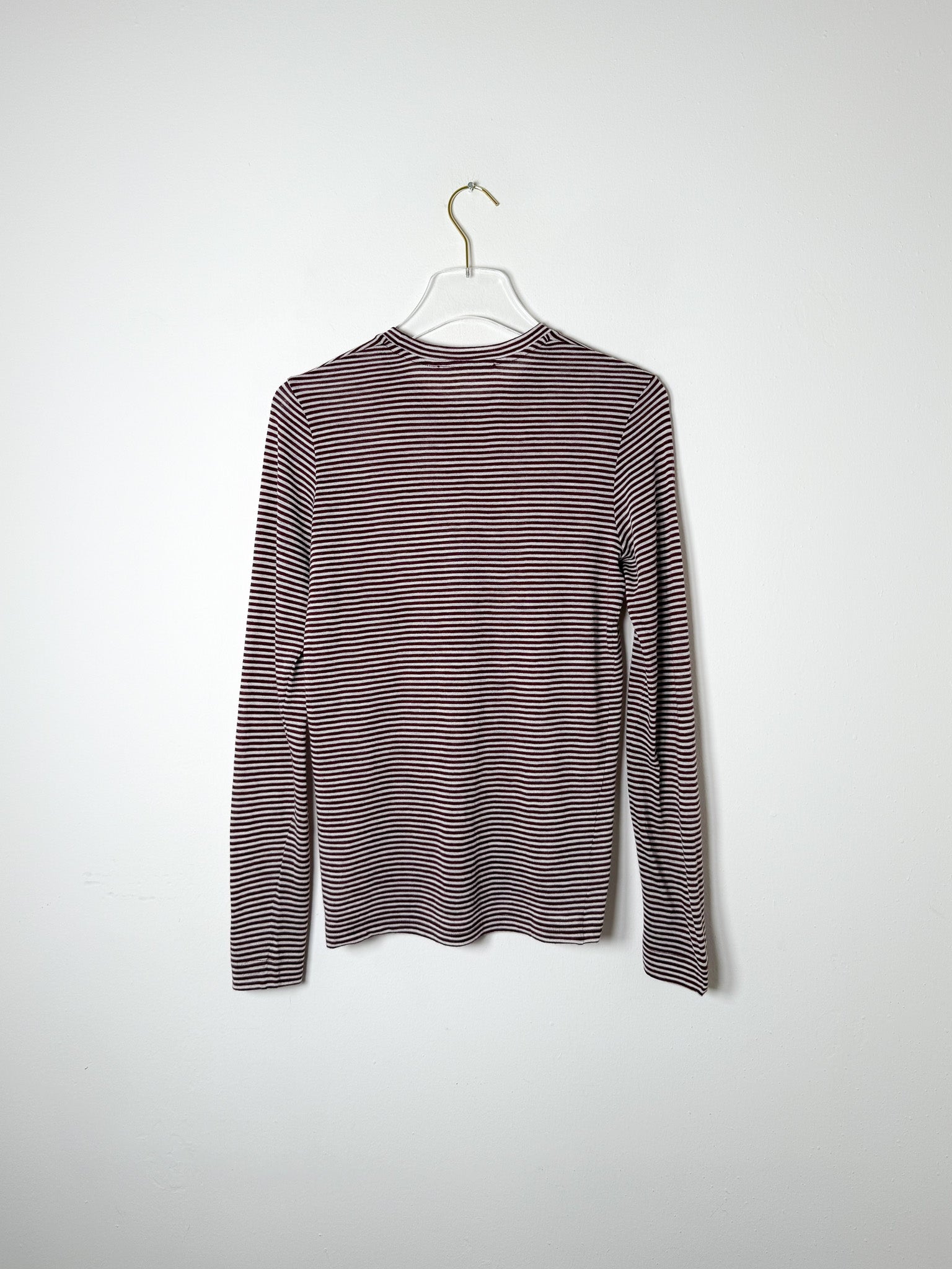 This plum-hued wool tee features subtle stripes and a crewneck design, offering a timeless fit for everyday wear.
