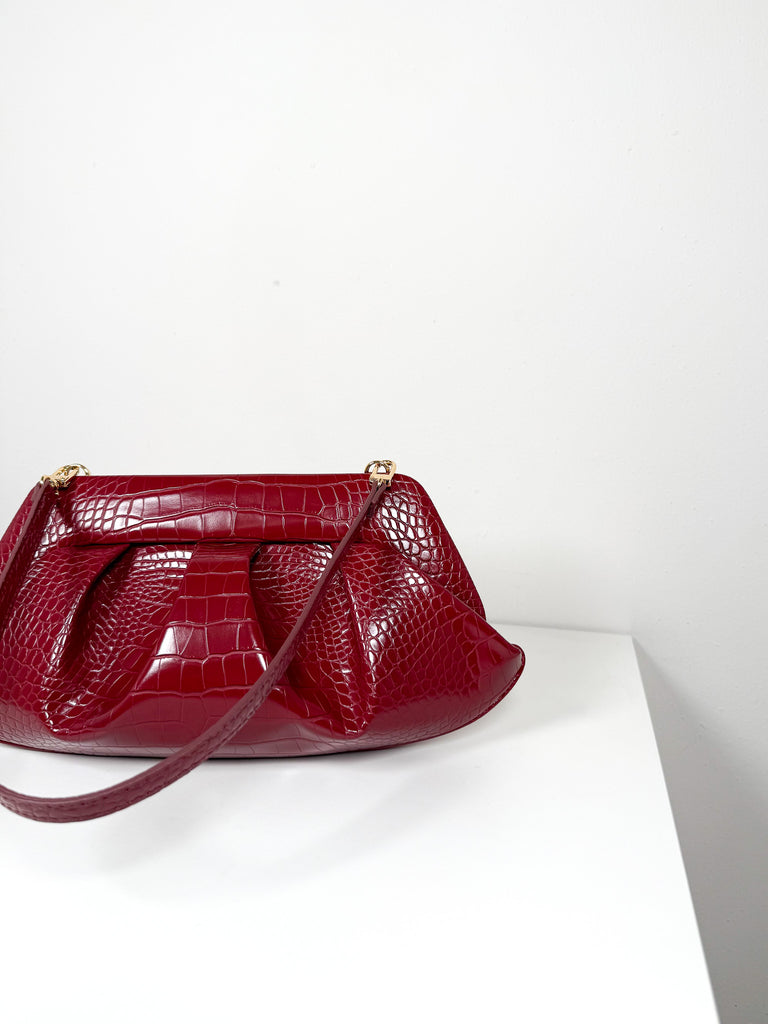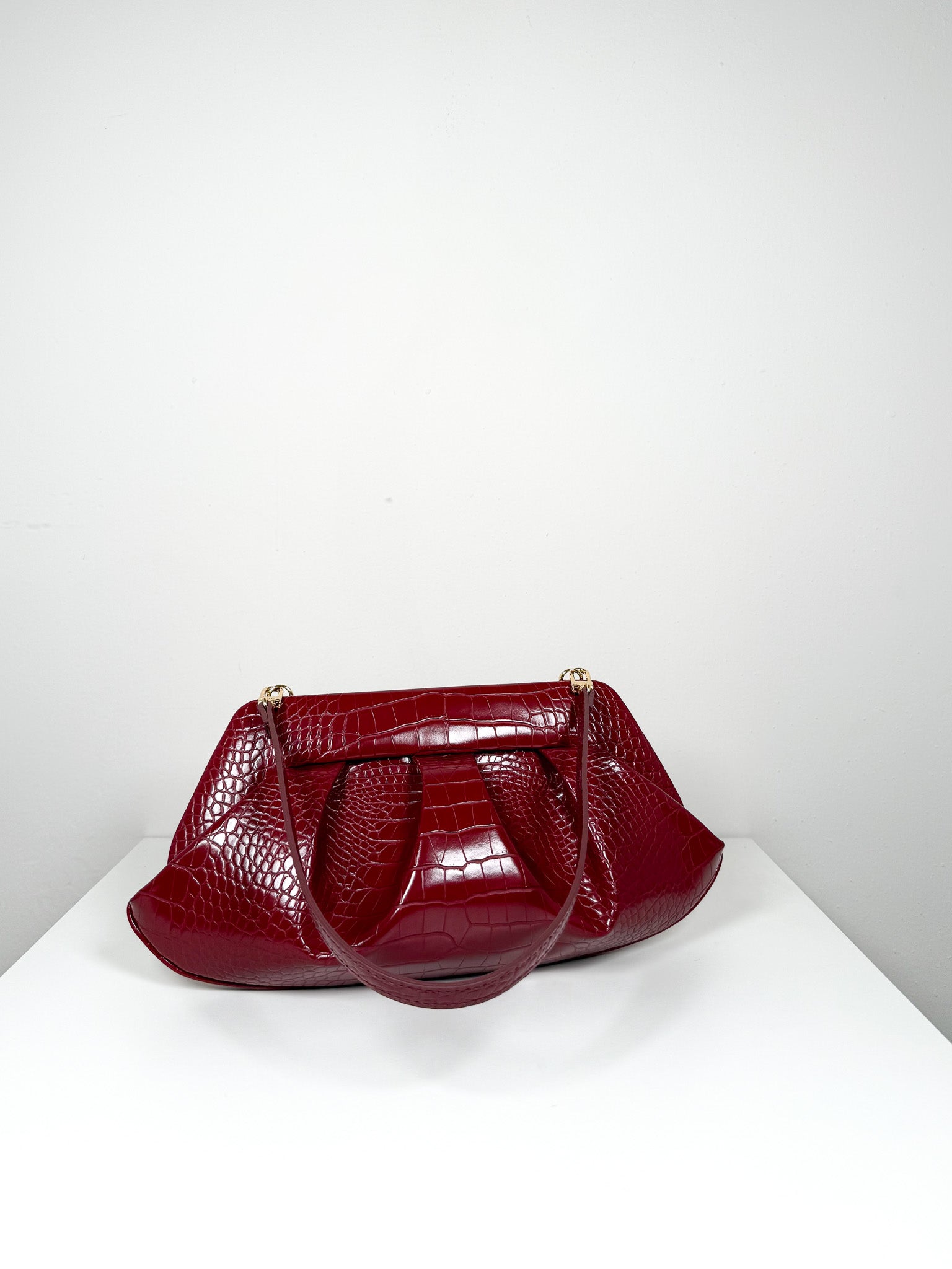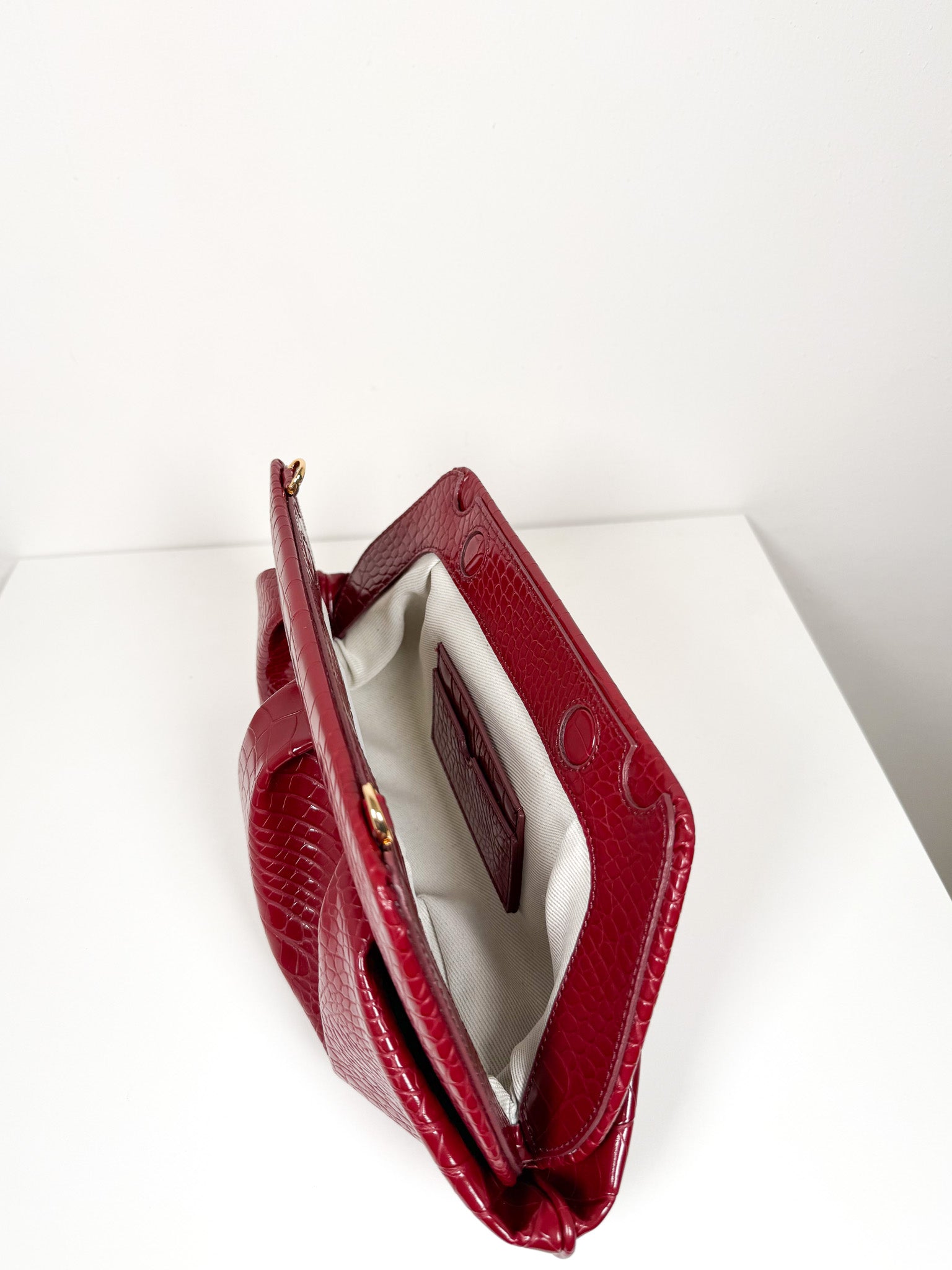 Structured with crocodile embossing and finished with a magnetic clasp, this versatile piece transitions seamlessly from clutch to shoulder bag via its removable strap.