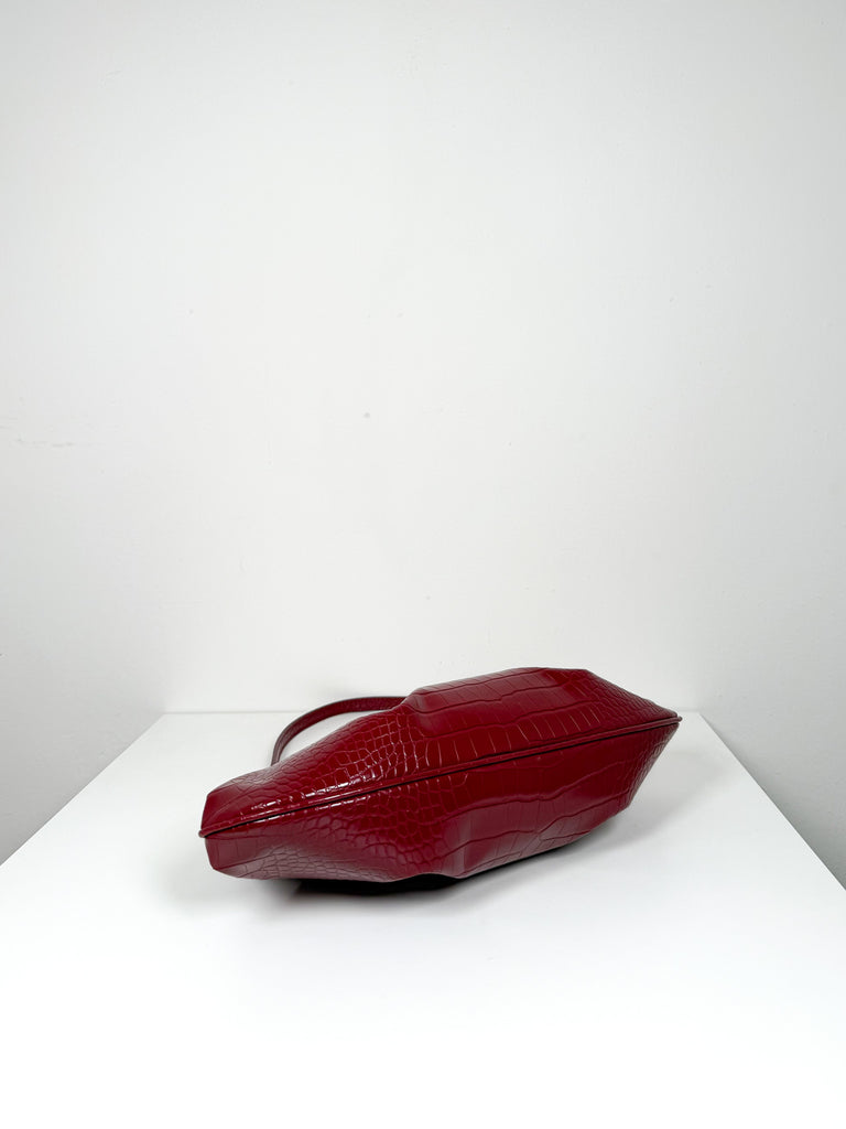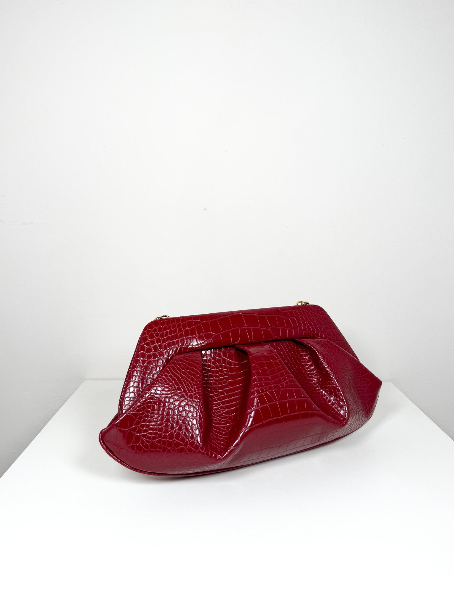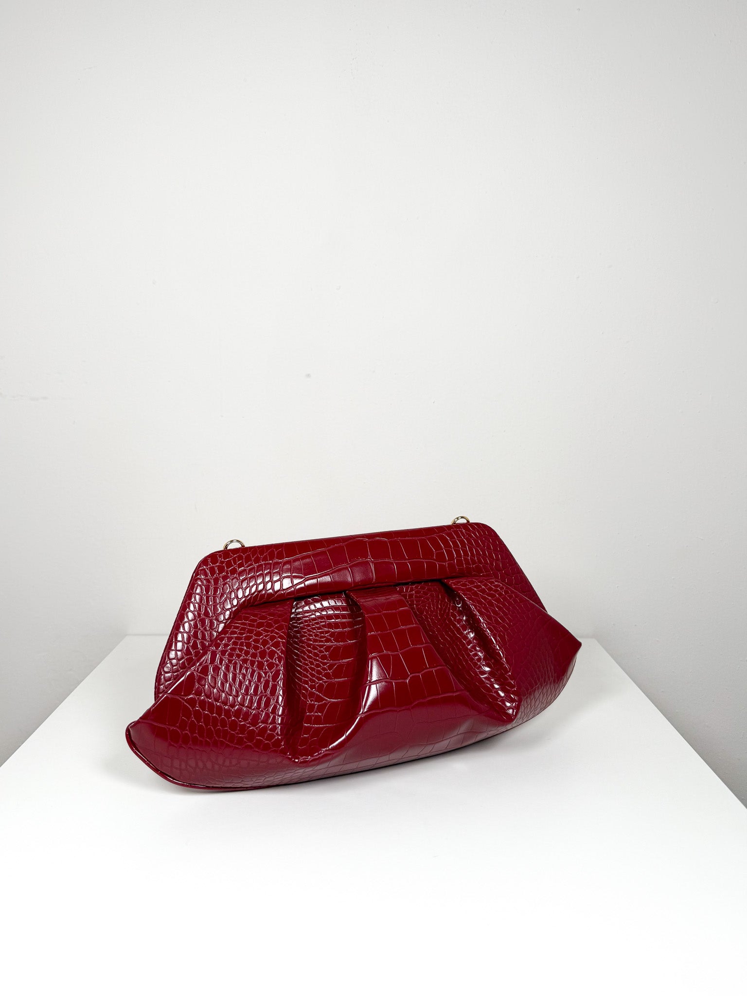 Structured with crocodile embossing and finished with a magnetic clasp, this versatile piece transitions seamlessly from clutch to shoulder bag via its removable strap.