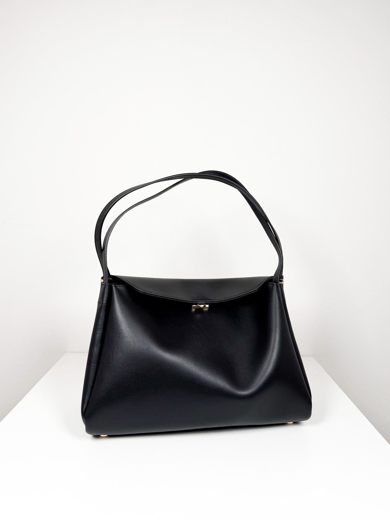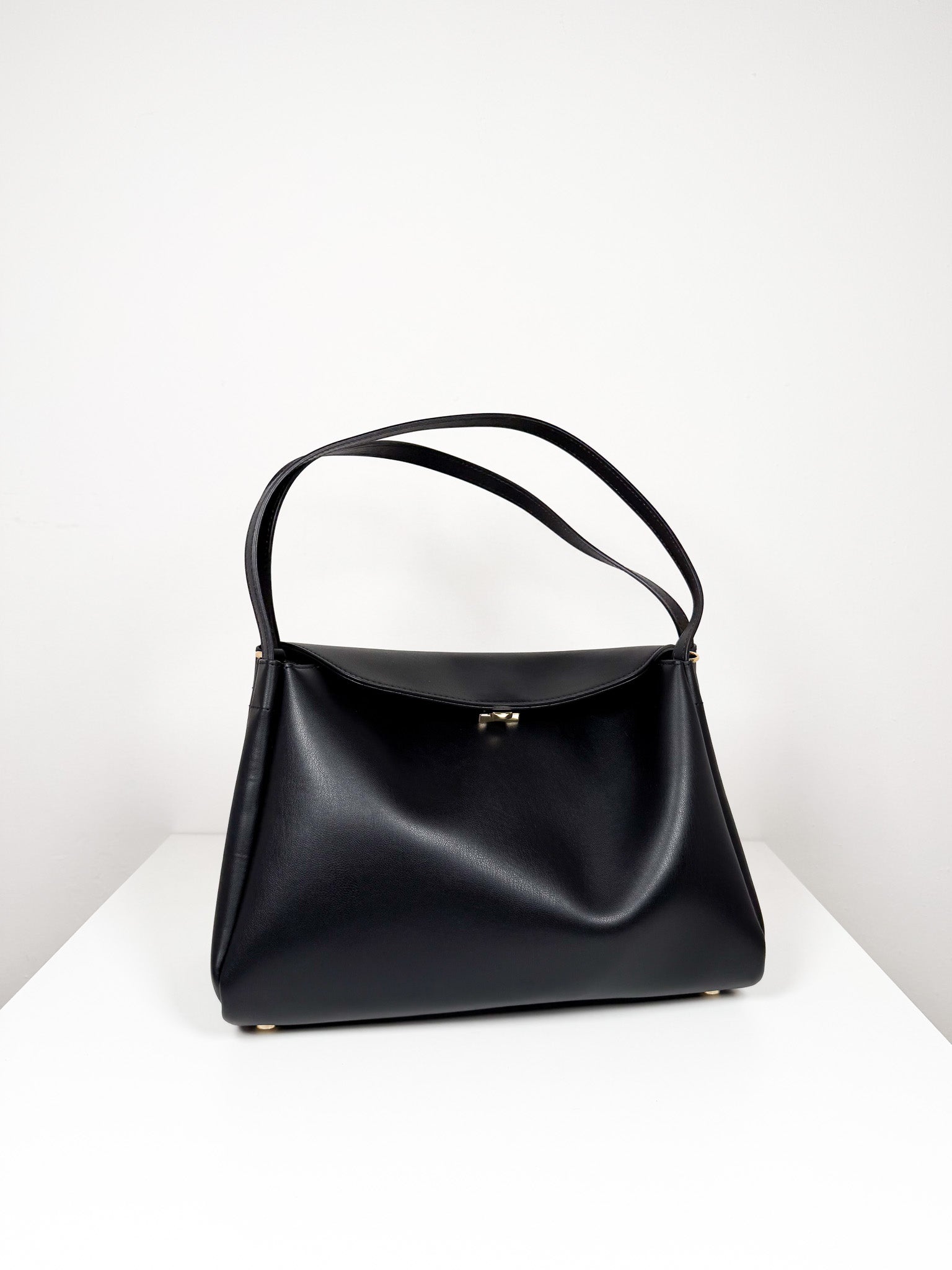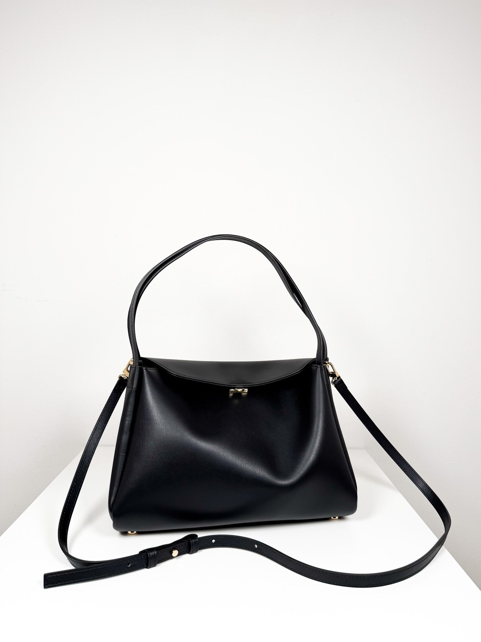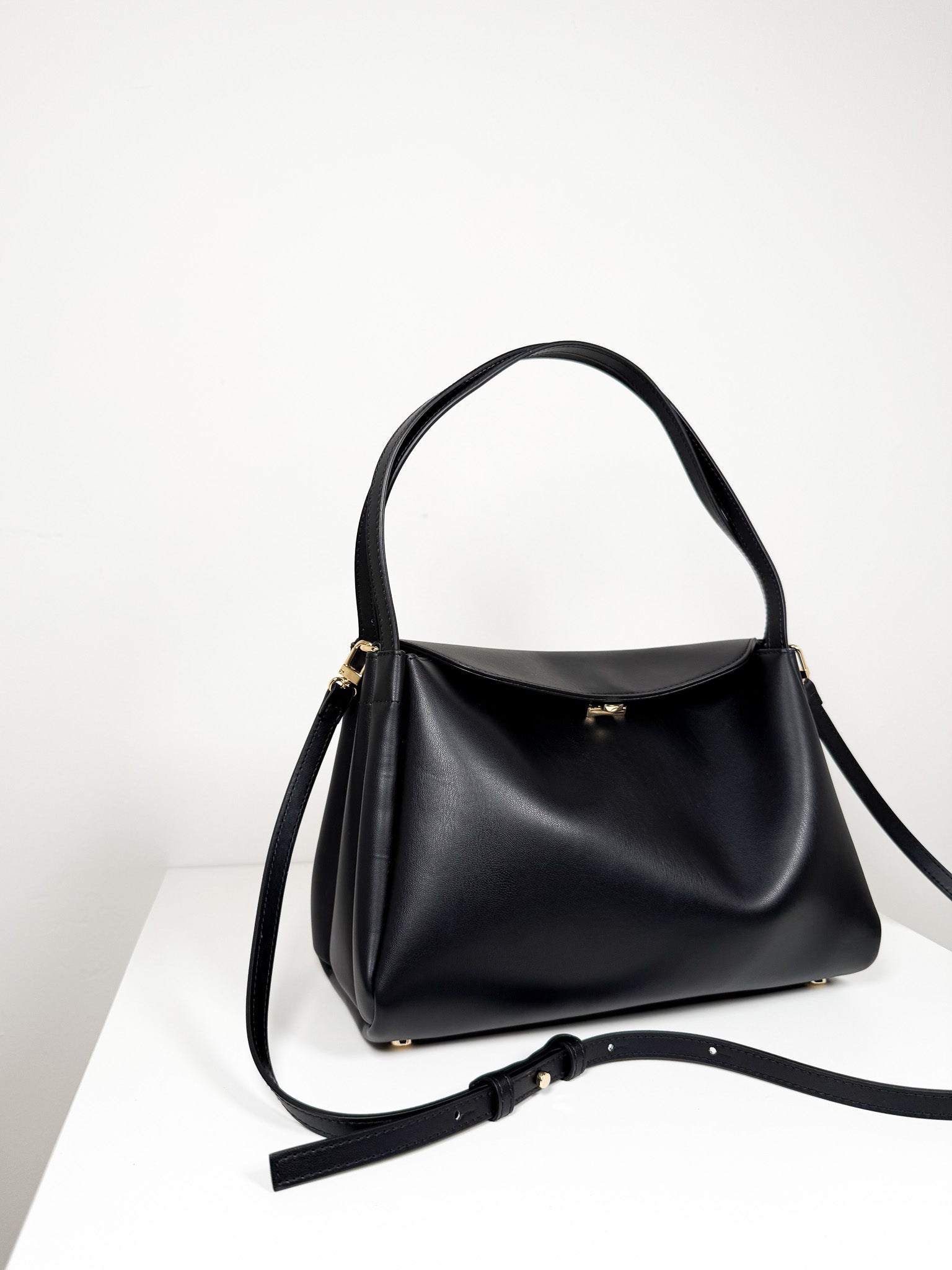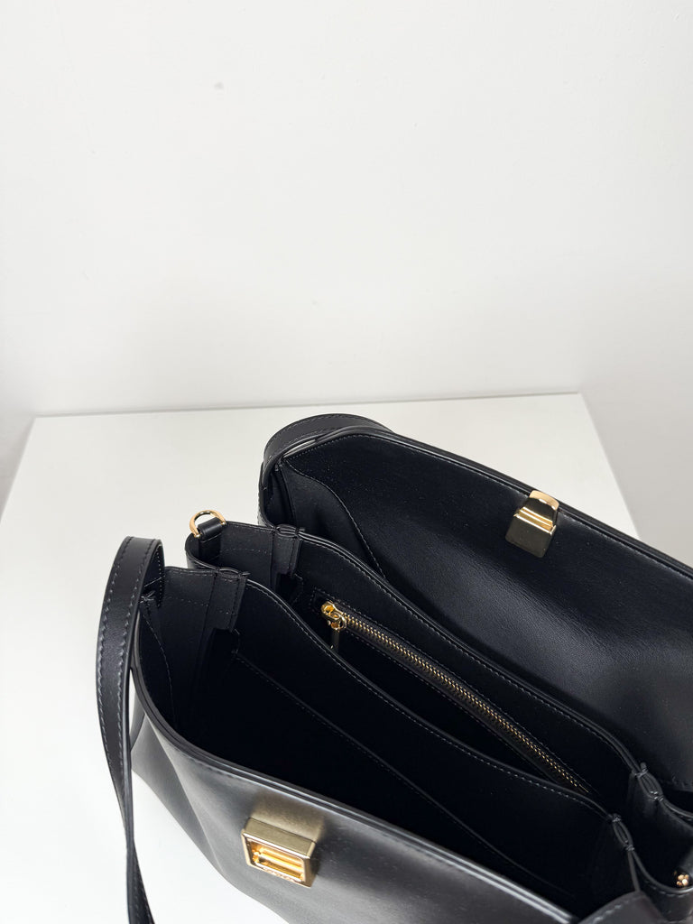 Timeless black shoulder bag with an adjustable, detachable crossbody strap for flexible carrying options. Magnetic fastening ensures security, while multiple interior sections keep belongings organized and accessible.