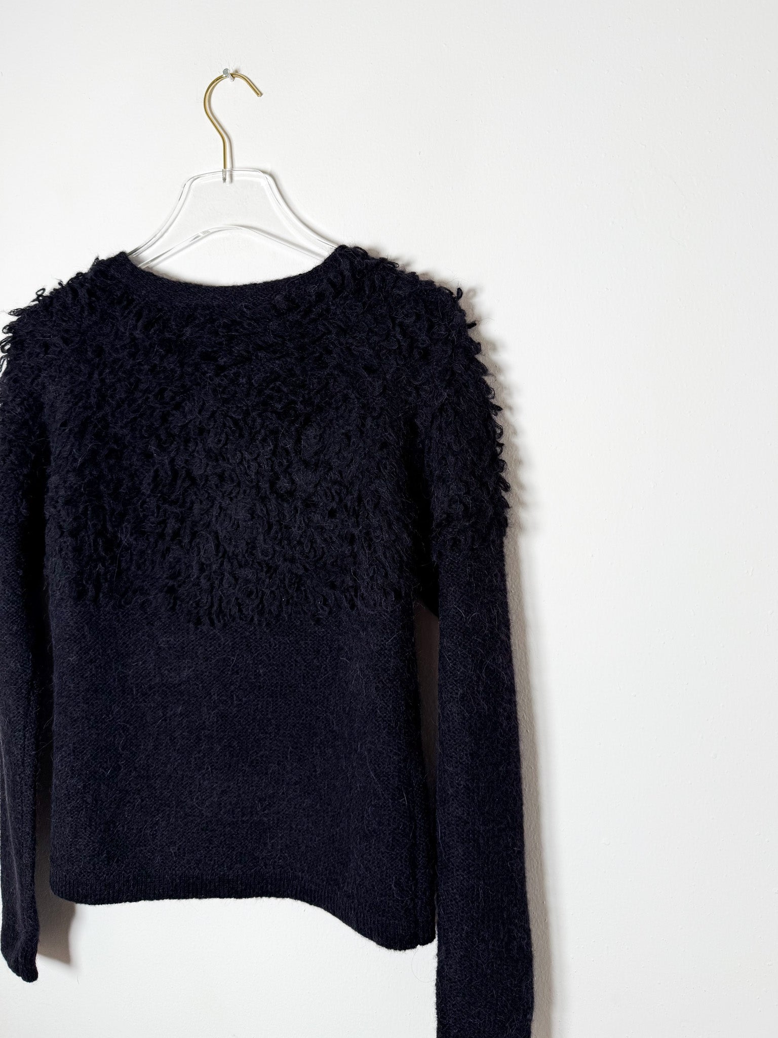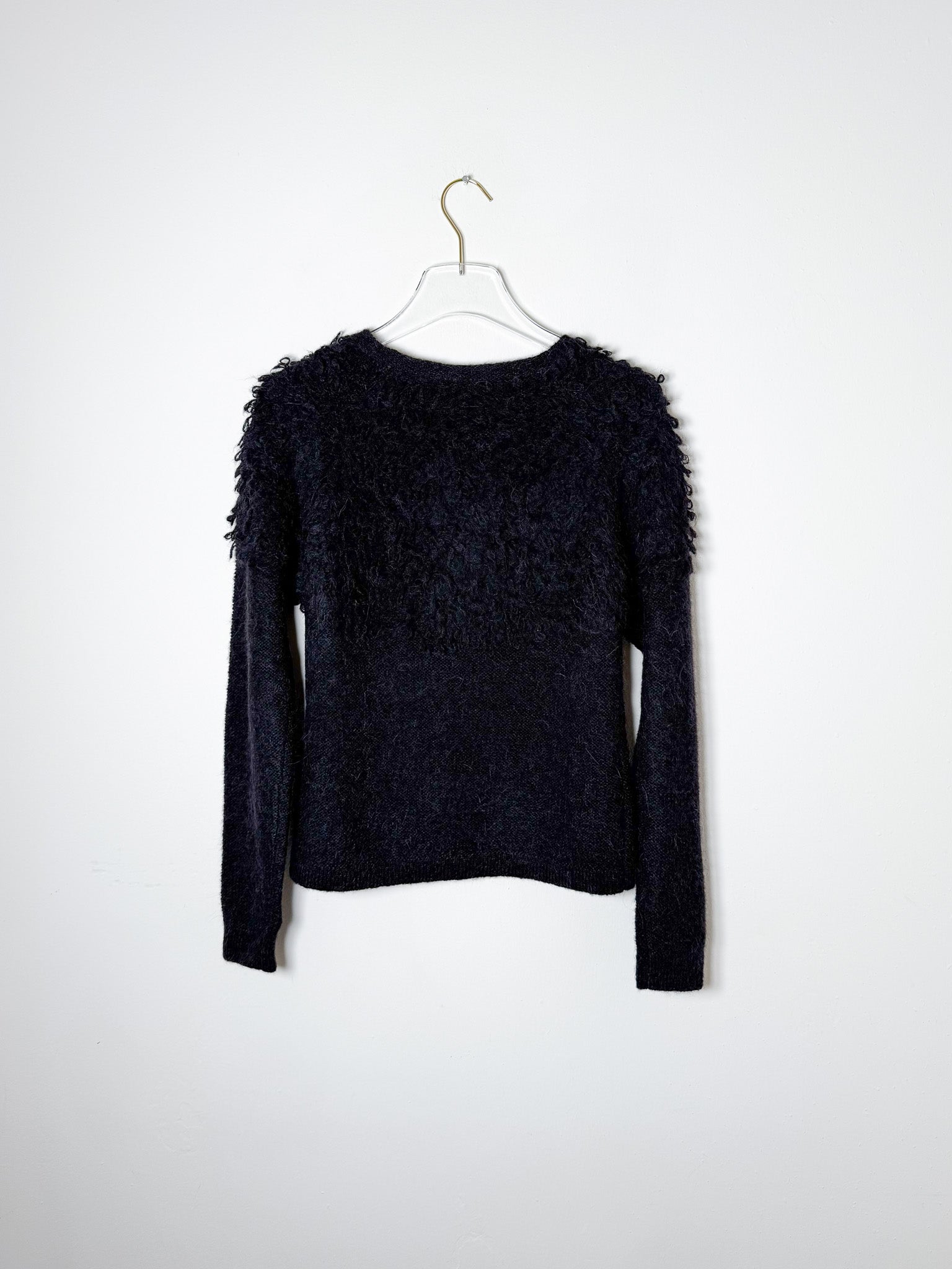 Black sweater with fringe detail on the top half of the garment.