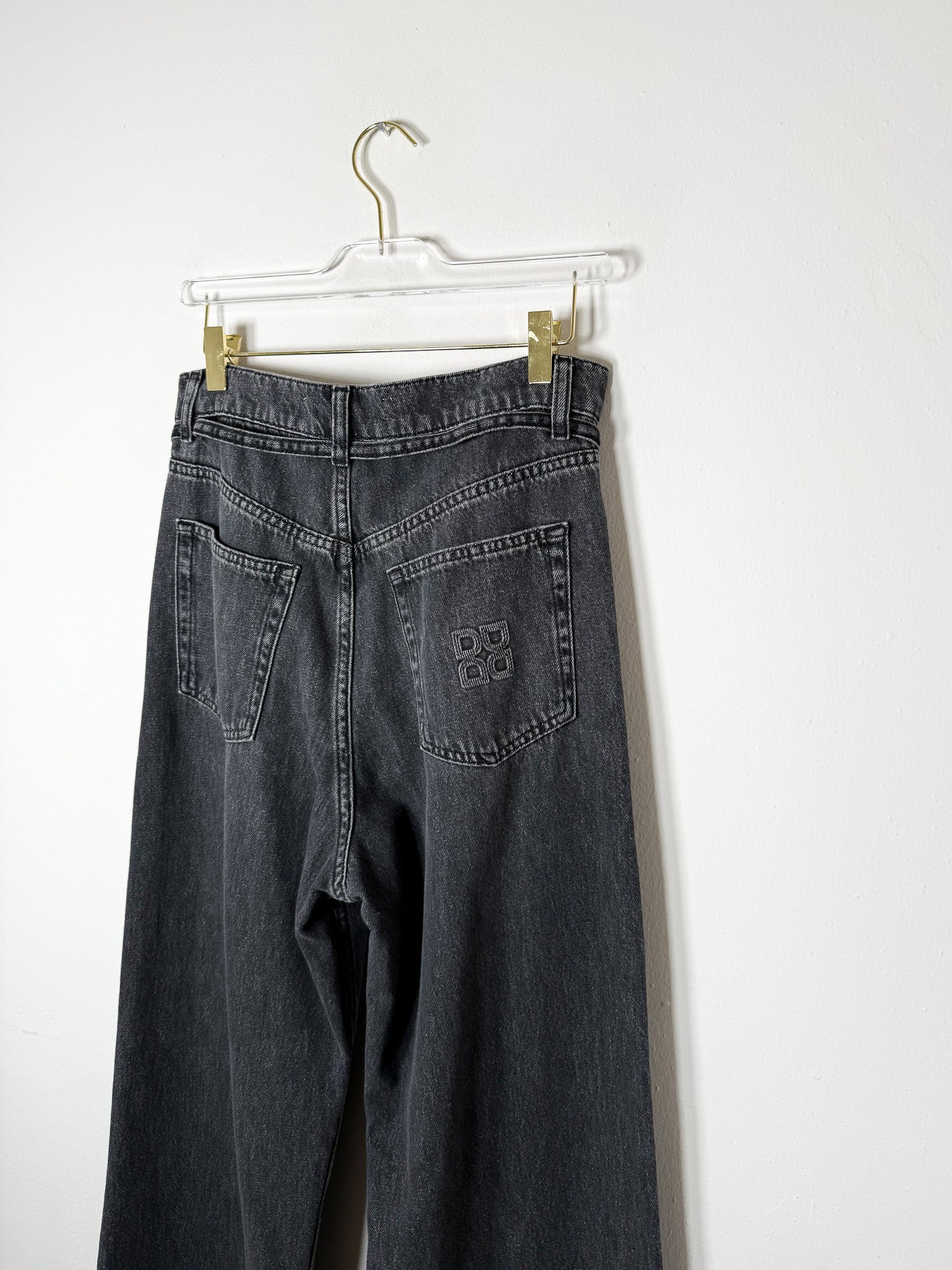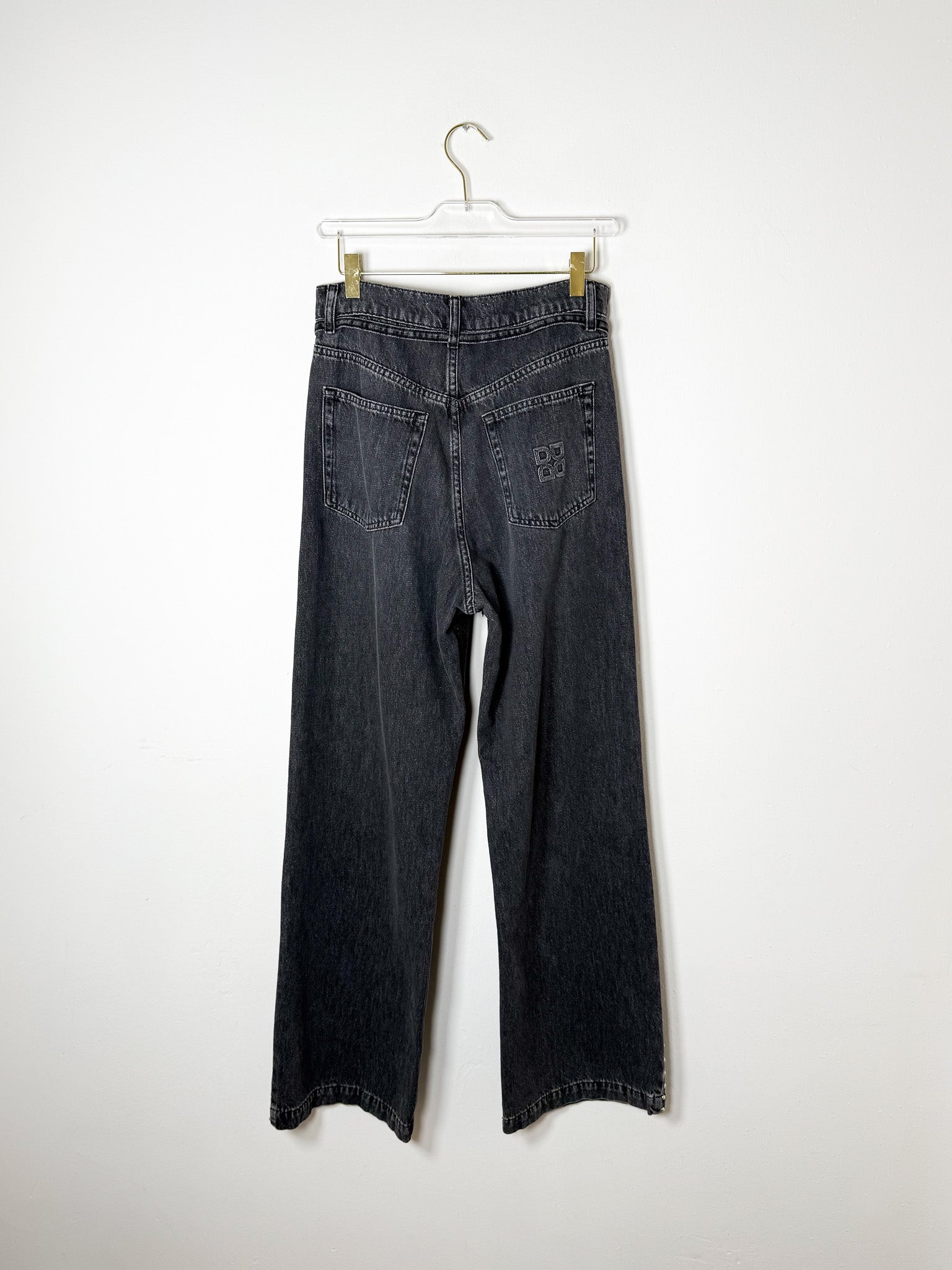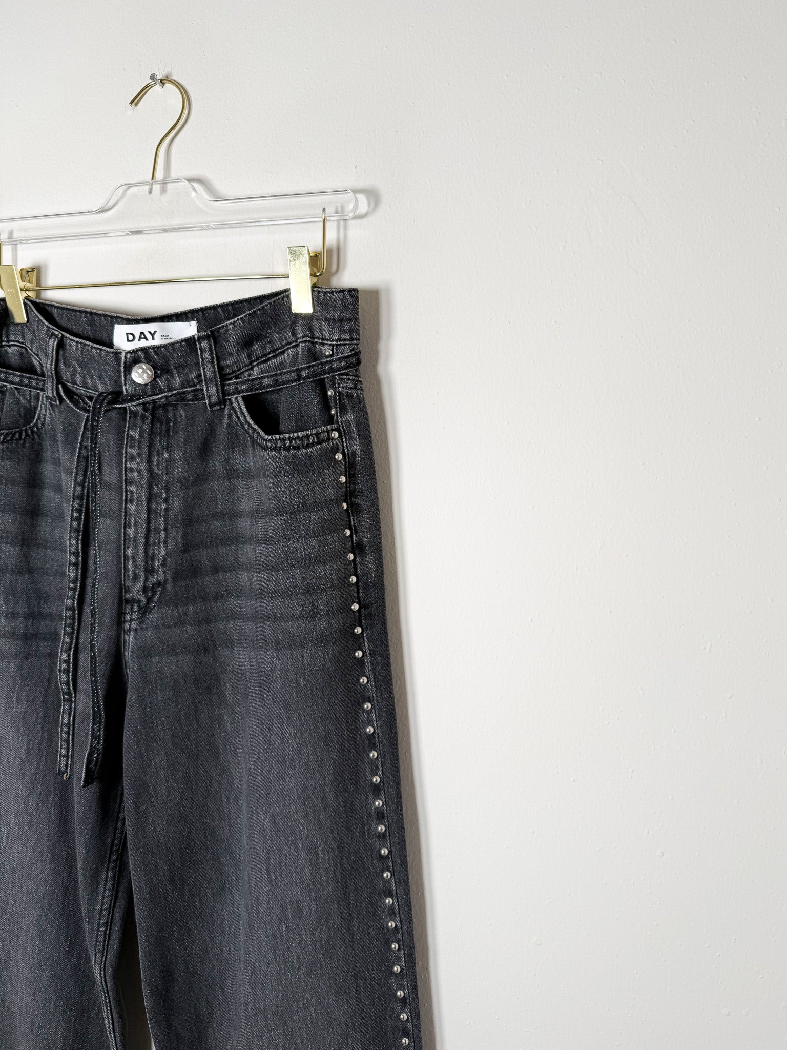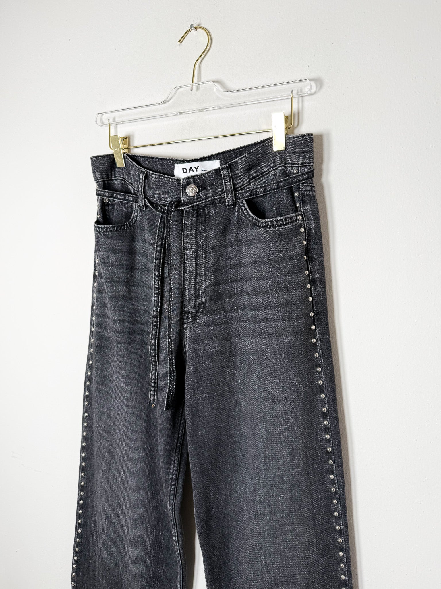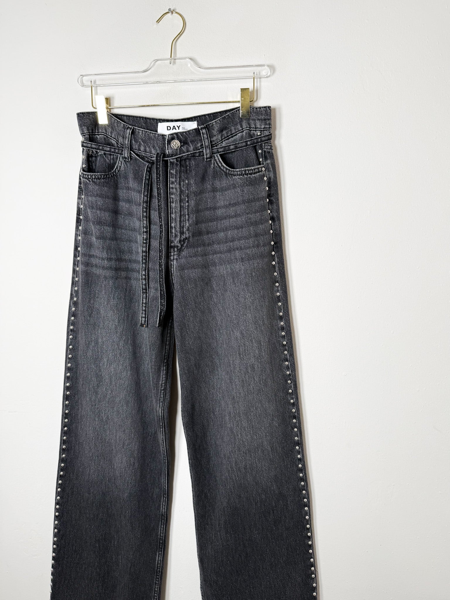 Effortless straight-leg silhouette with a relaxed fit that sits low on the hips. Studded side seams add subtle detail to this versatile black denim.