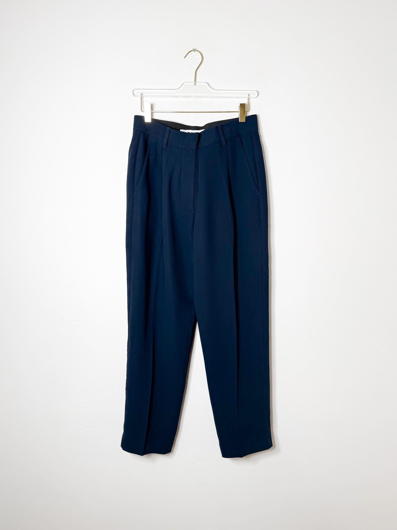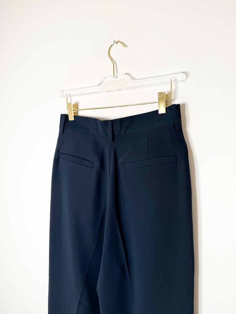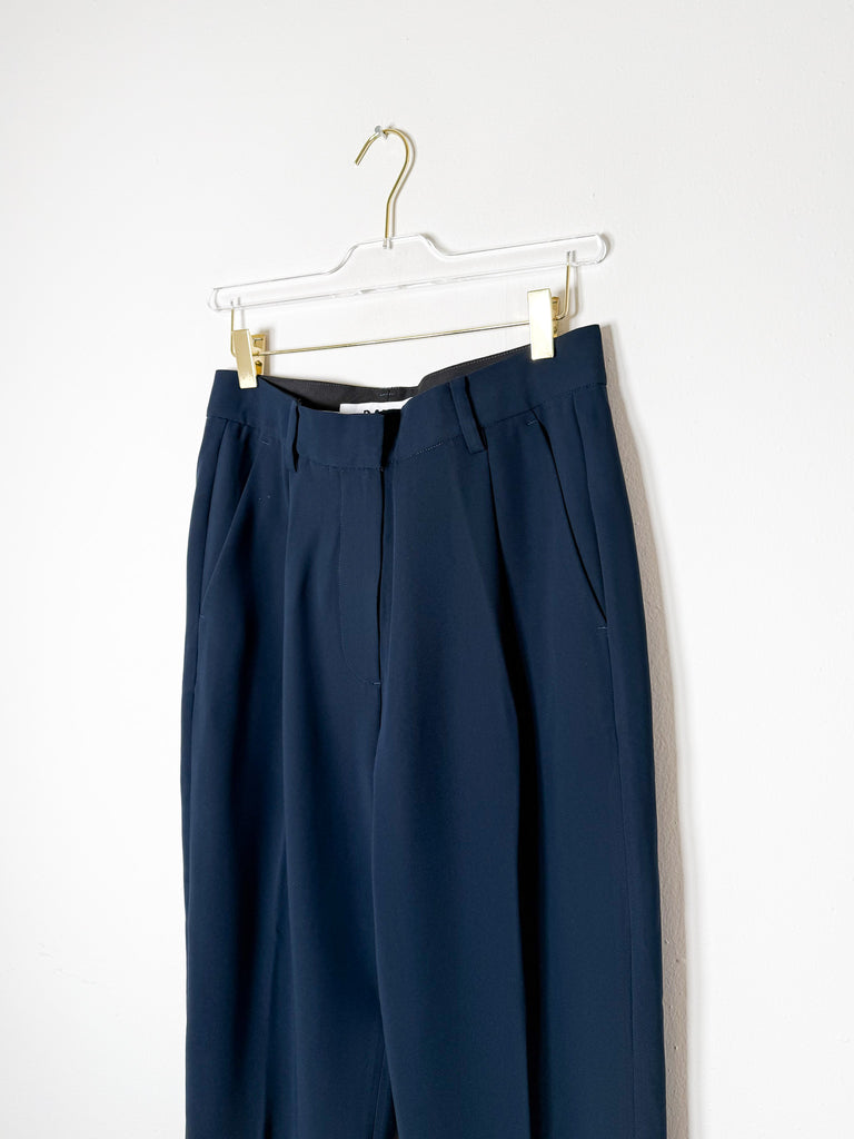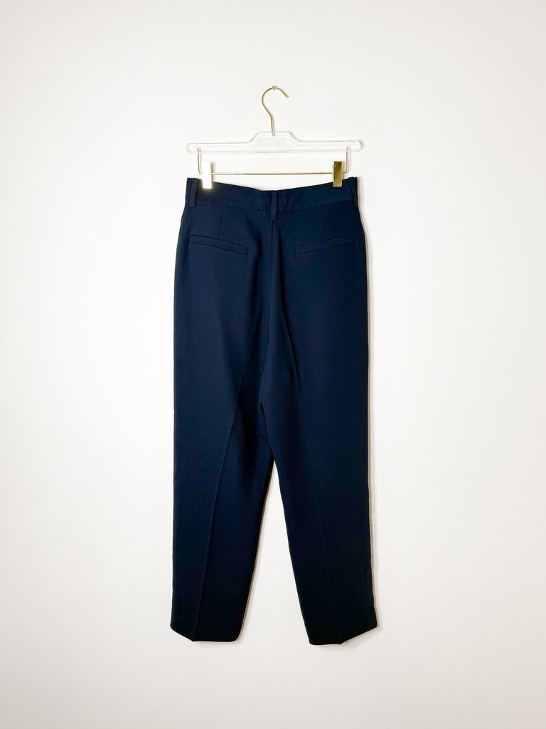 These mid-rise trousers feature classic pleats and a tapered silhouette, crafted in a dark navy shade. Made from lightweight, flowing fabric for a polished yet comfortable look.