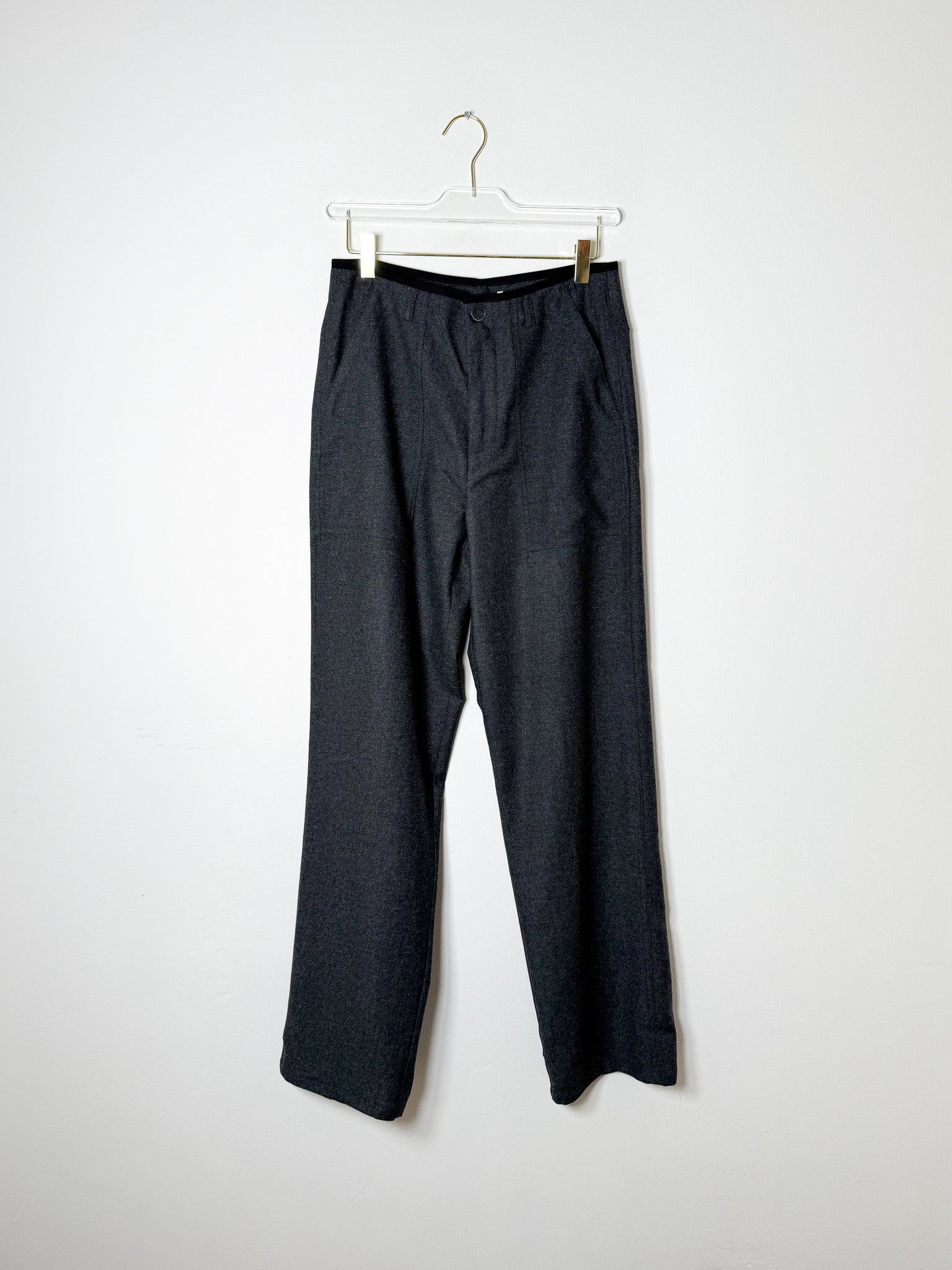 These mid-rise wool trousers feature a contrasting stitch detail on the waistband, offering a refined touch. Designed with a slim fit through the hips and a straight leg cut.