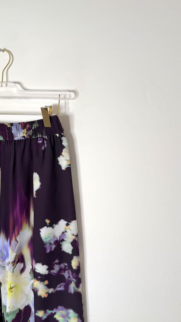 These lightweight pants feature a wide leg with a gentle flare, an elastic waistband, and side slit pockets. The fabric showcases a rich floral print in deep hues. Stylish and versatile, they easily transition from casual to more polished looks.