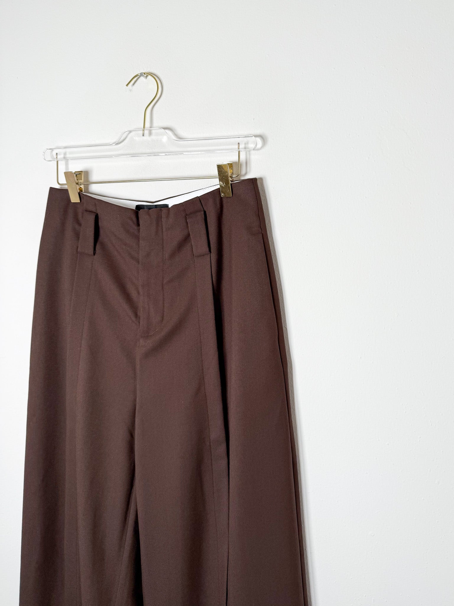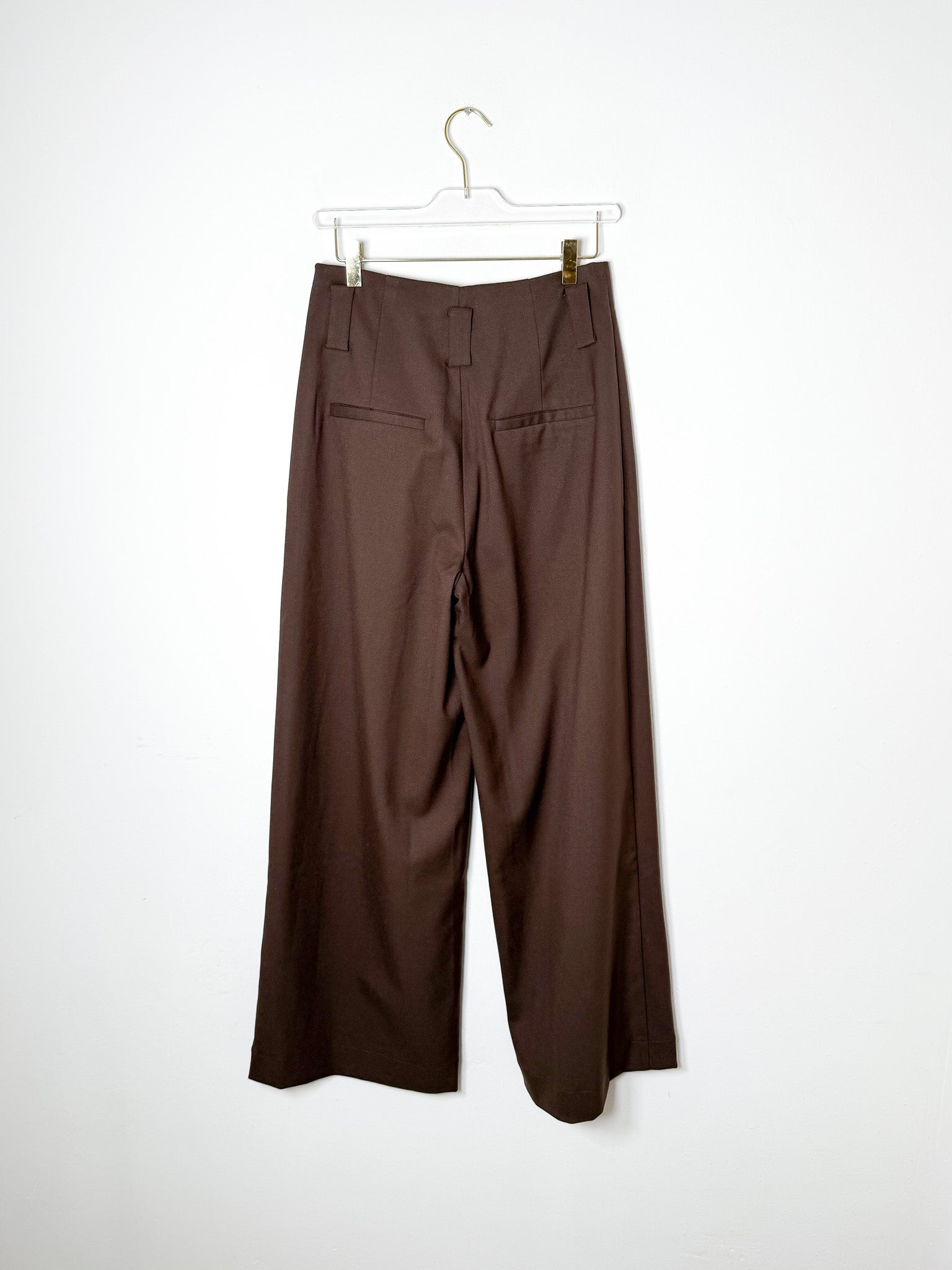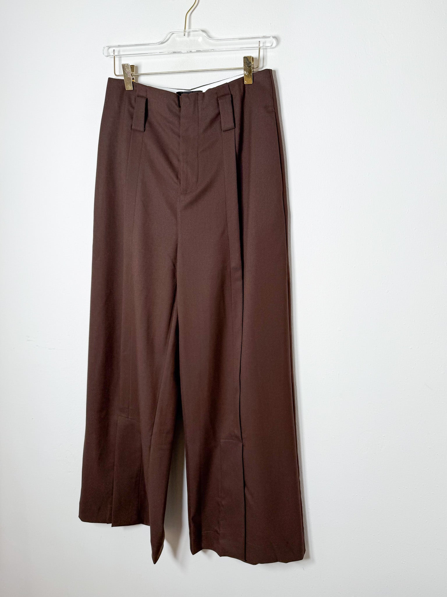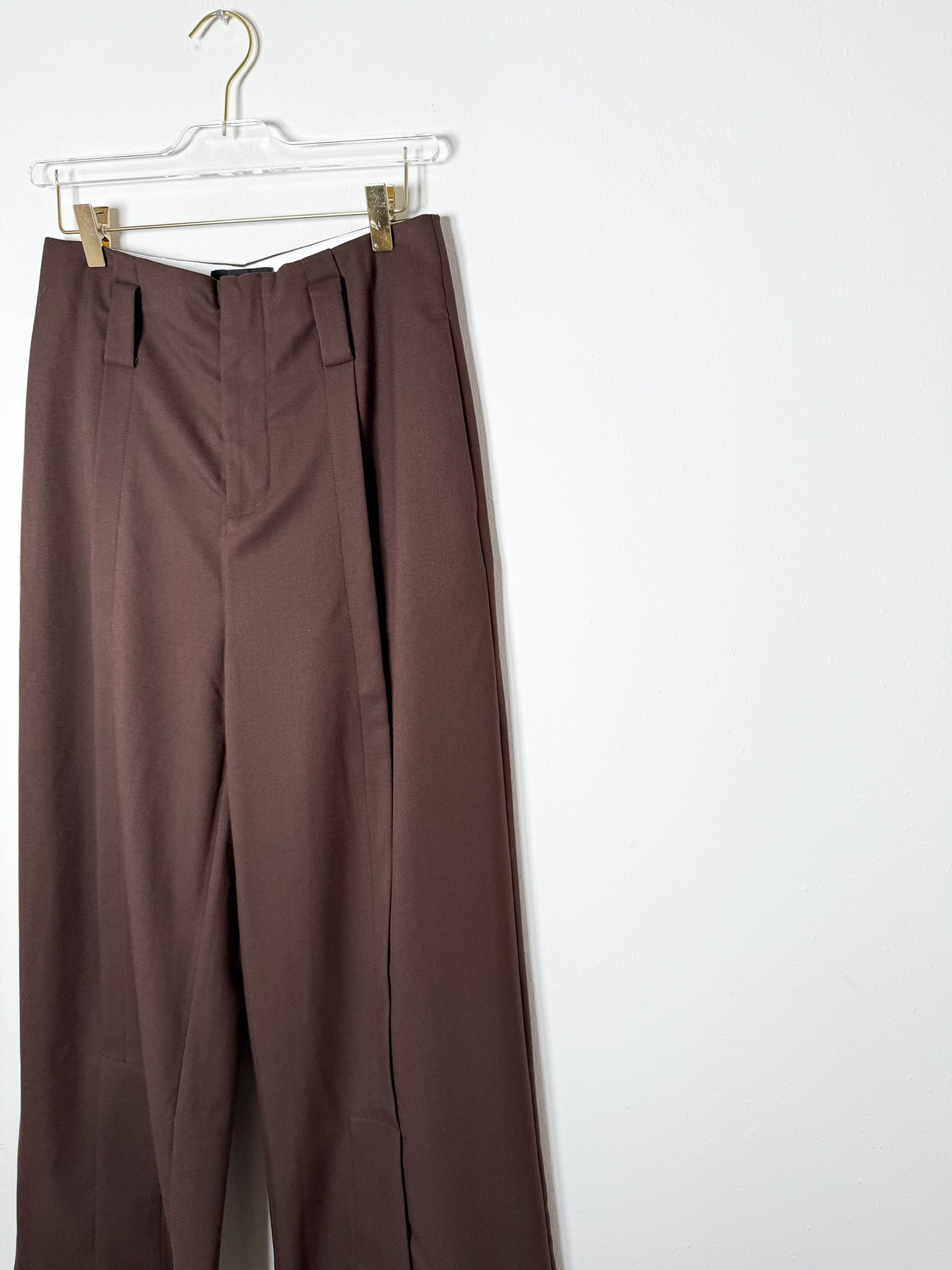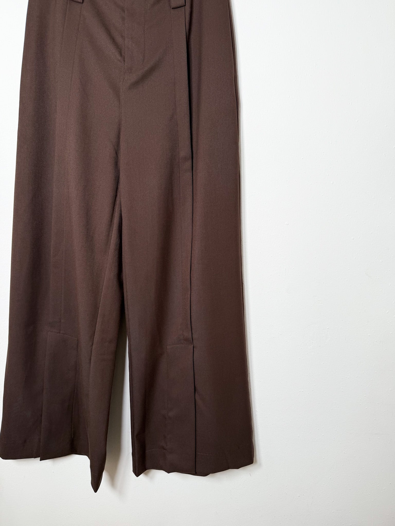 High waisted trousers with pleats going down the front. Front slits for added detail.