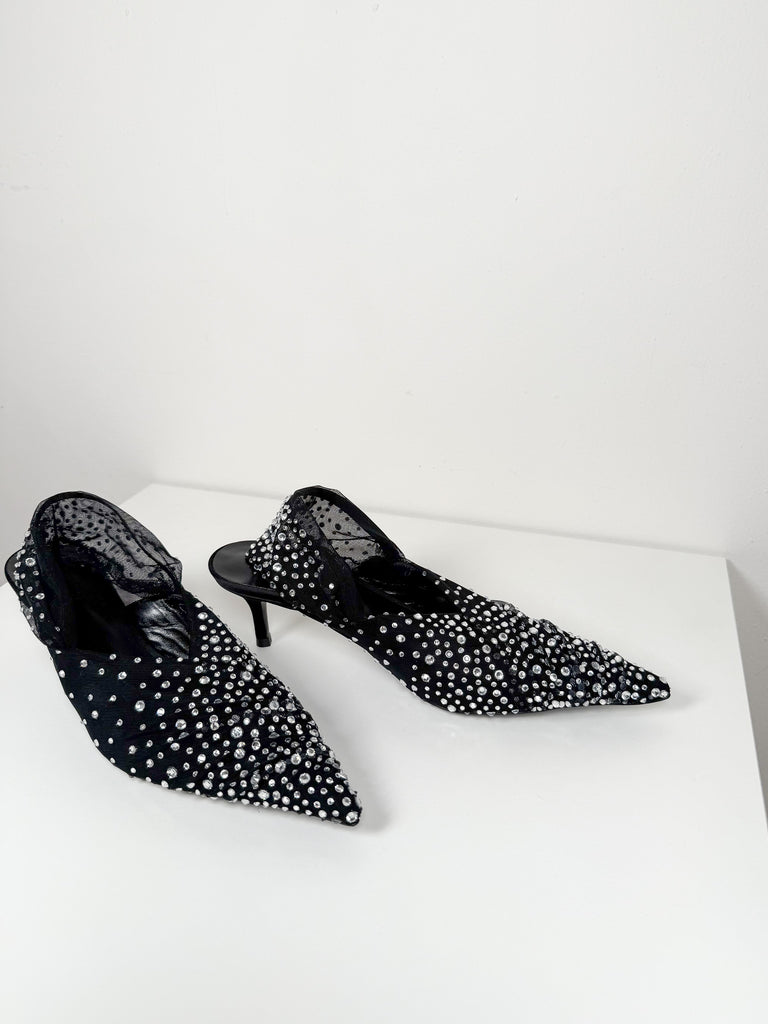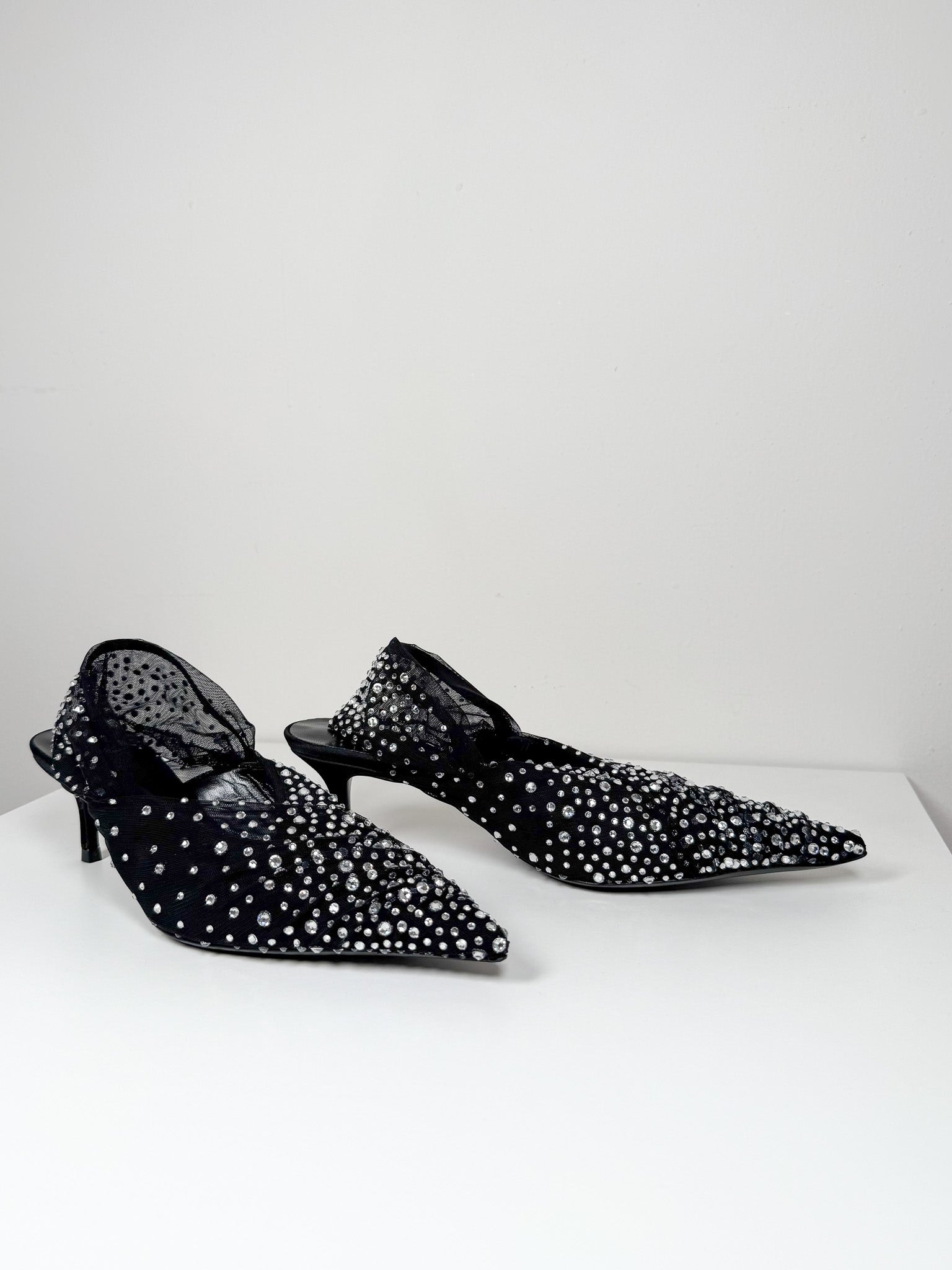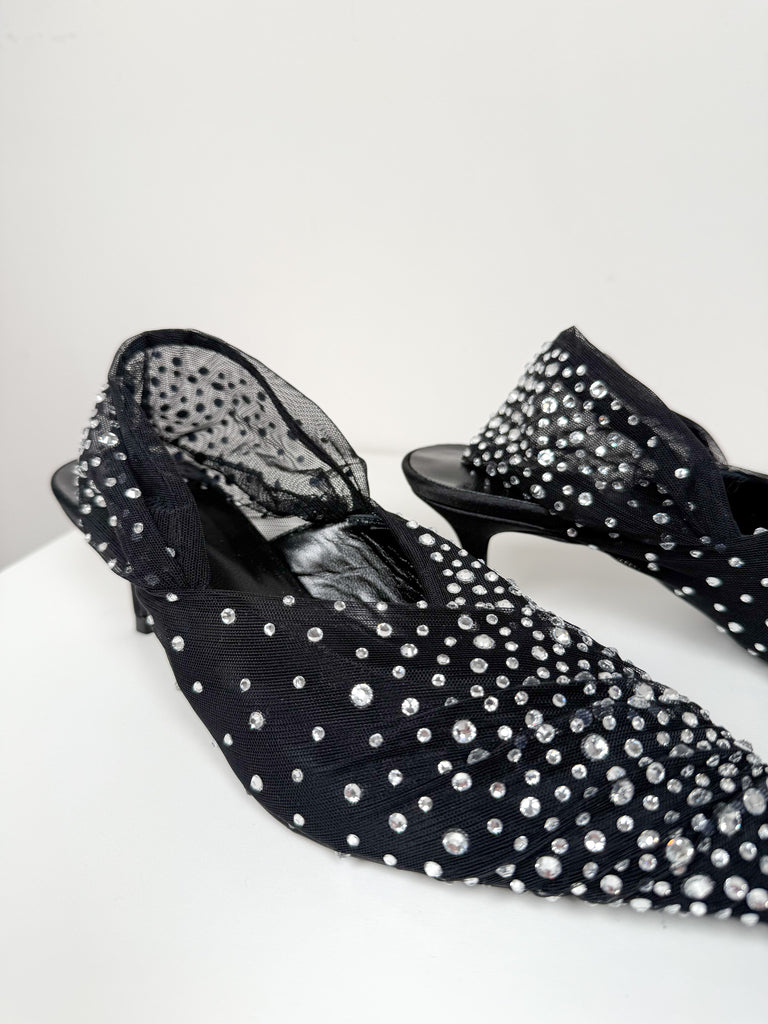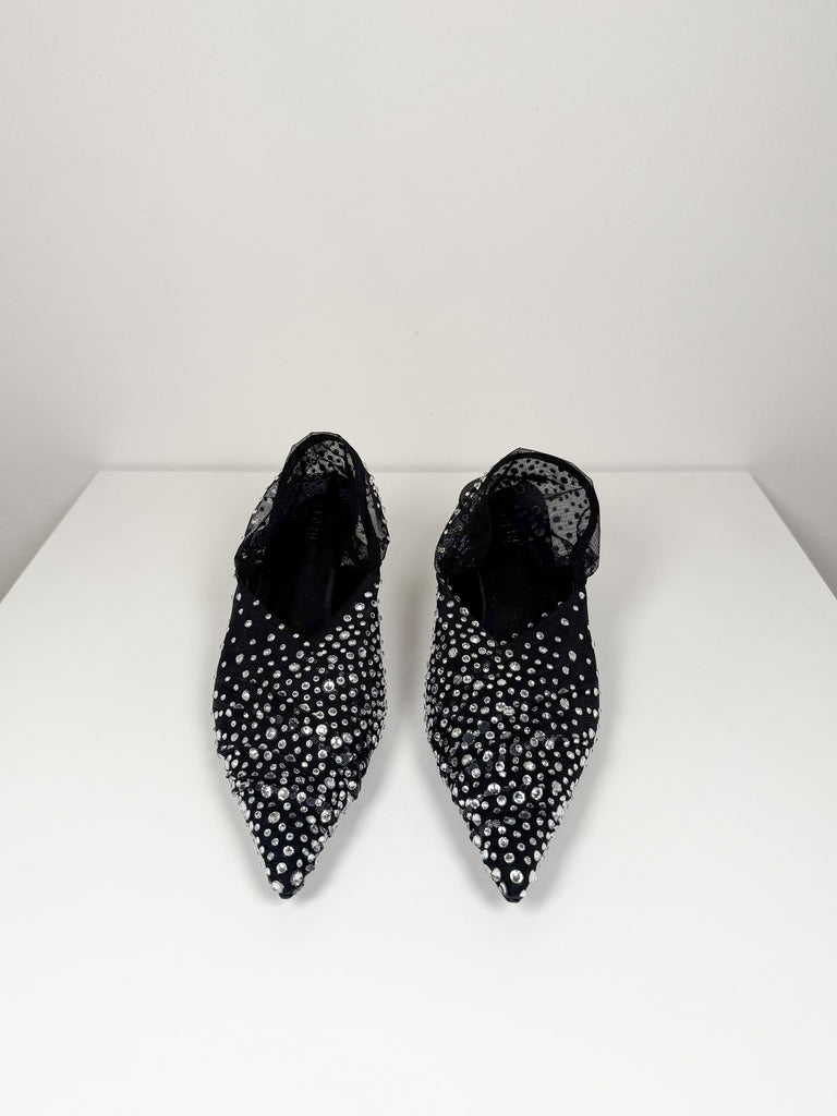 These pointed heels are crafted from tulle & embellished crystals and feature an elasticized strap at the back for a secure fit. The leather-lined interior of the toebox provides added comfort.