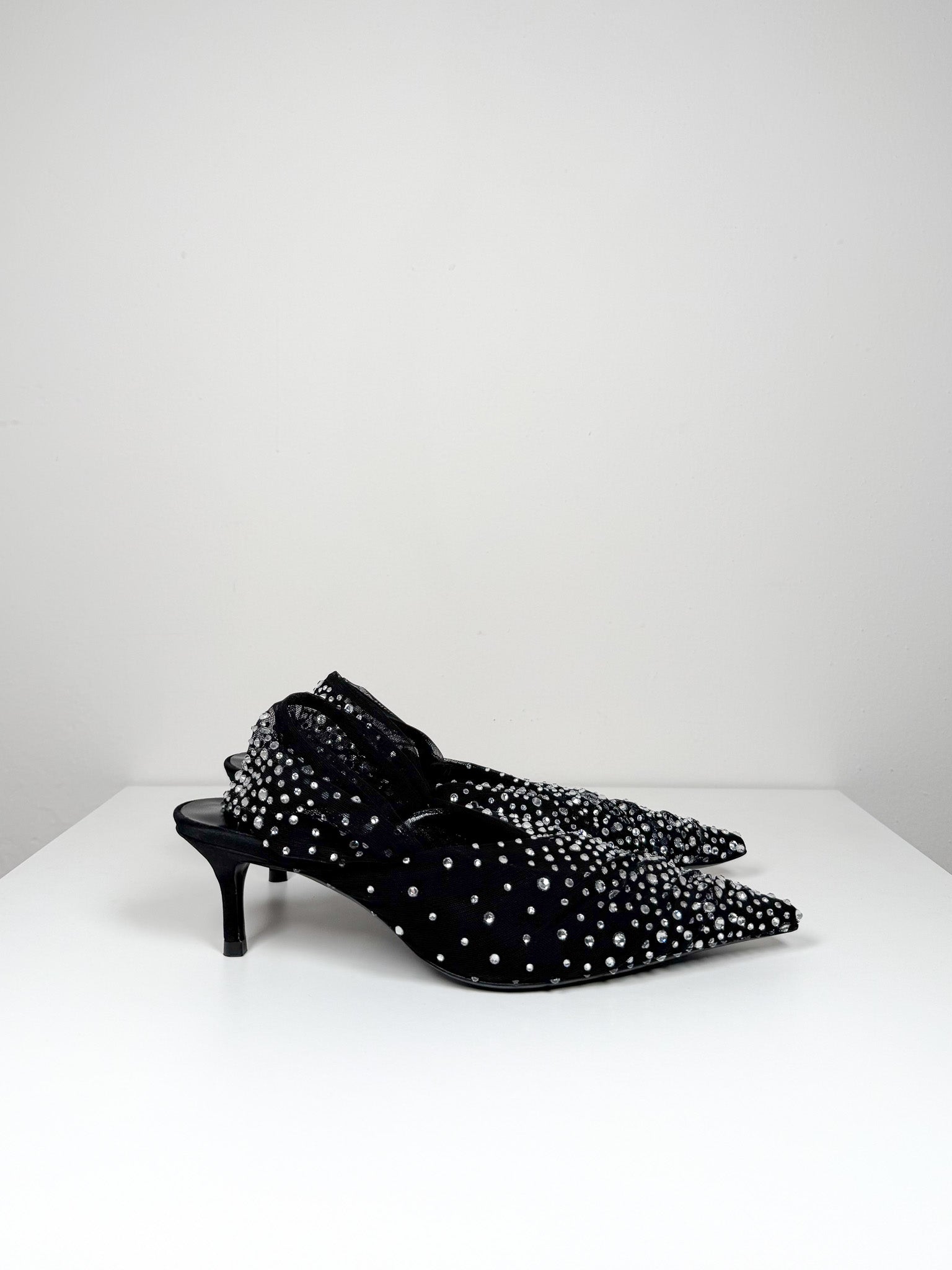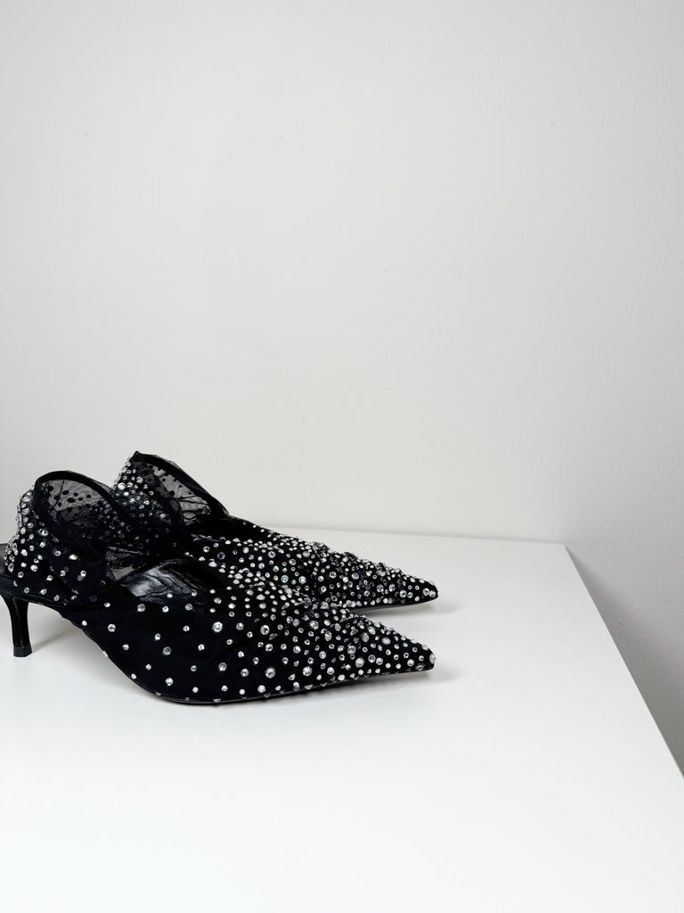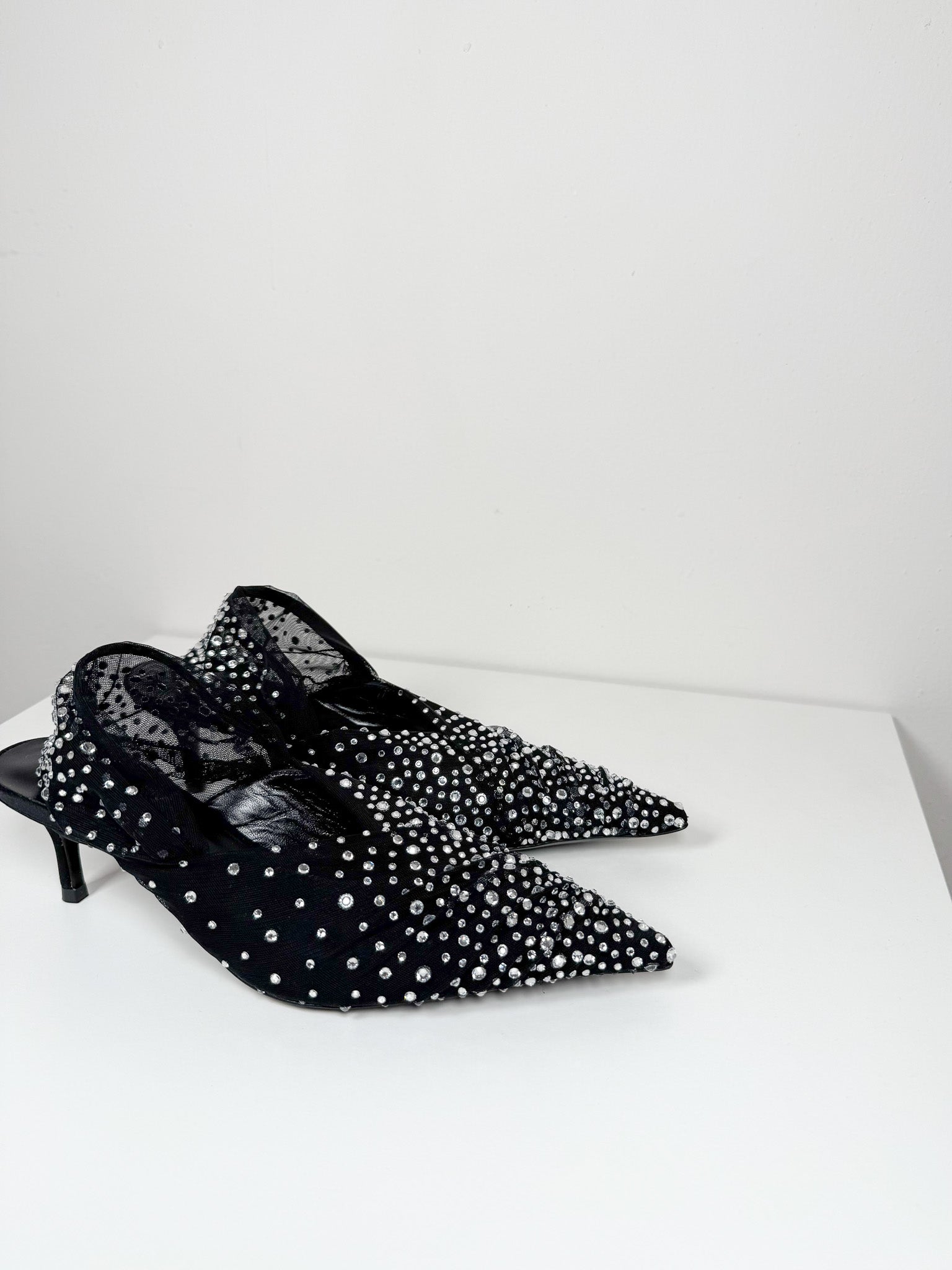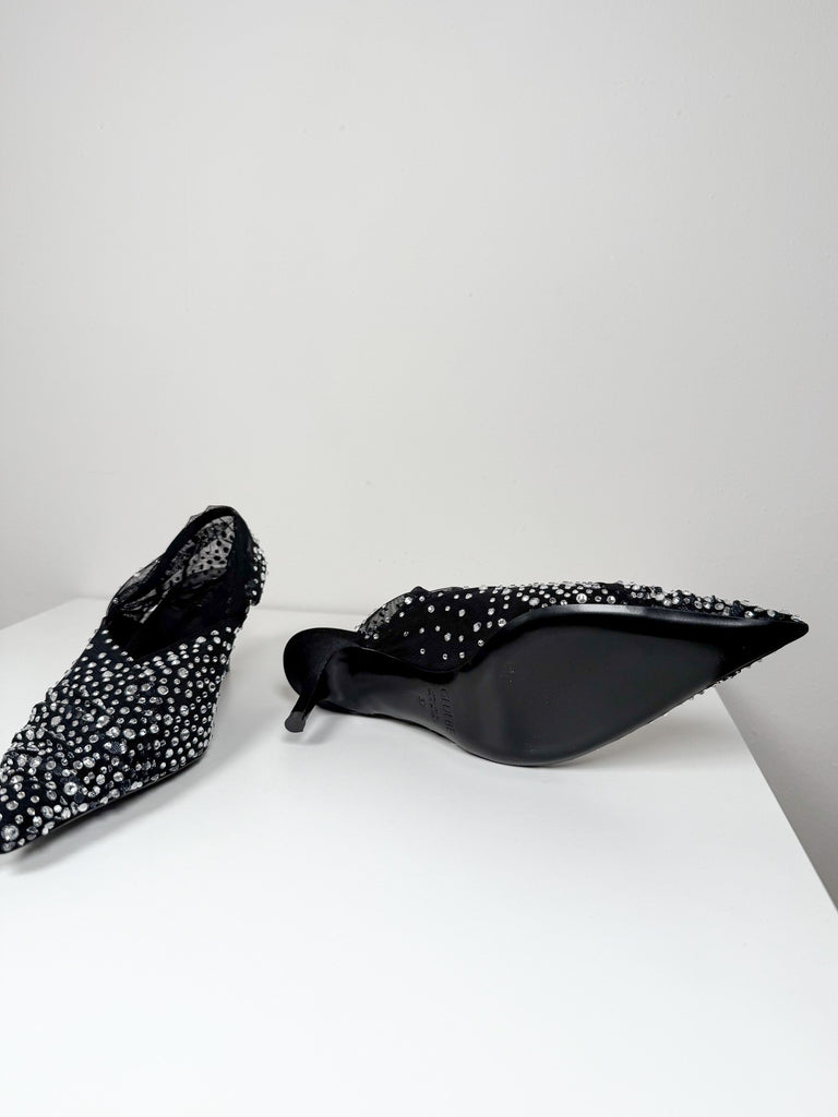 These pointed heels are crafted from tulle & embellished crystals and feature an elasticized strap at the back for a secure fit. The leather-lined interior of the toebox provides added comfort.