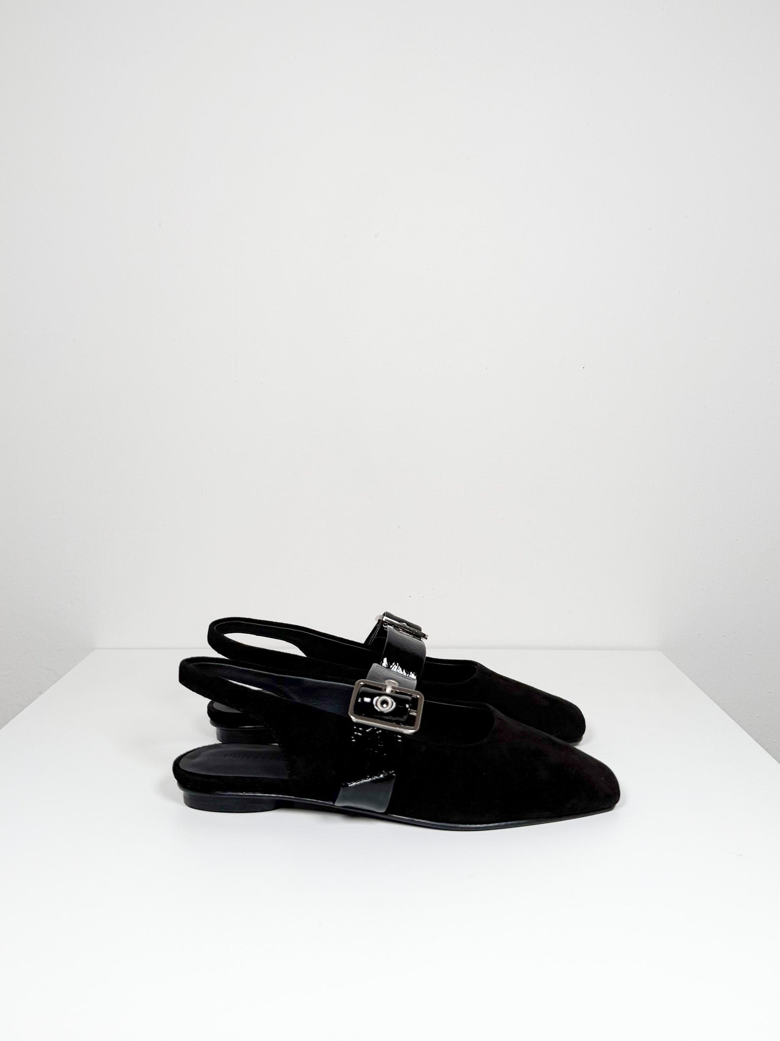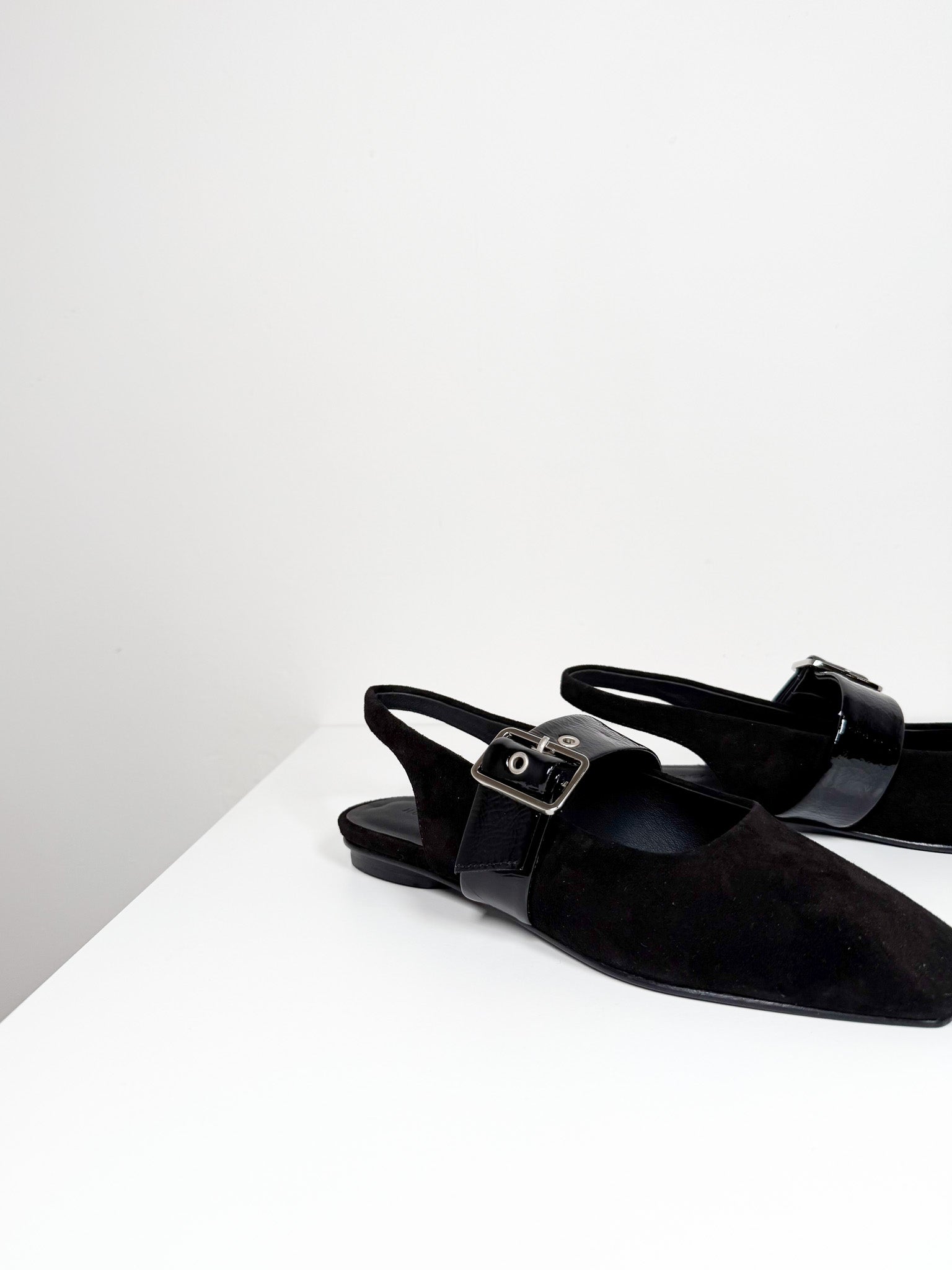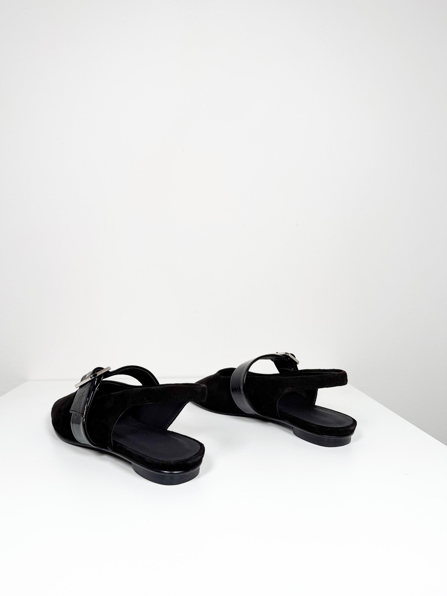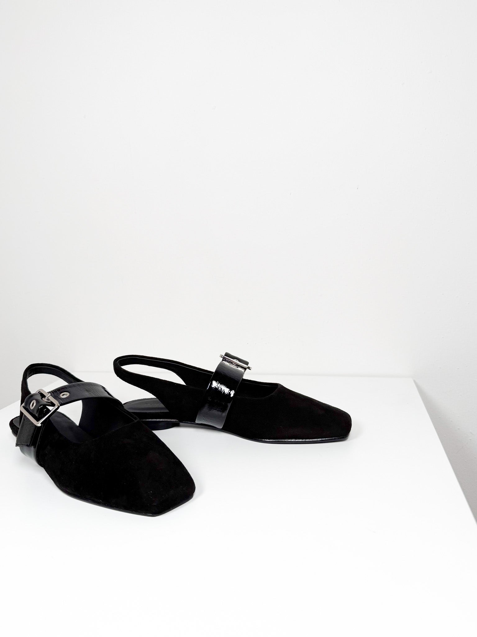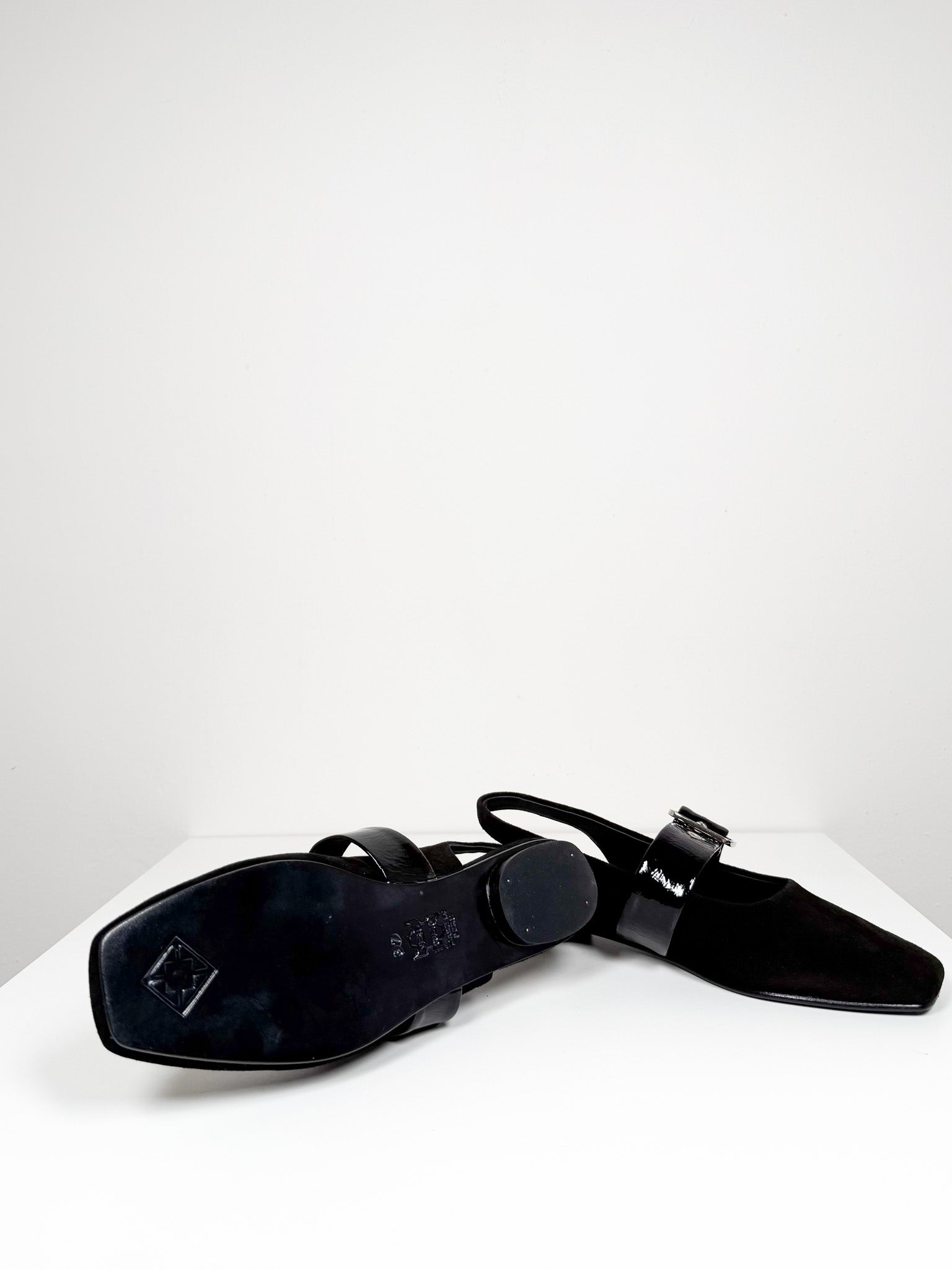 Flat slingback shoes in coal suede with an adjustable patent leather strap that goes across the top of the foot.