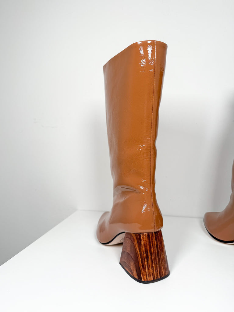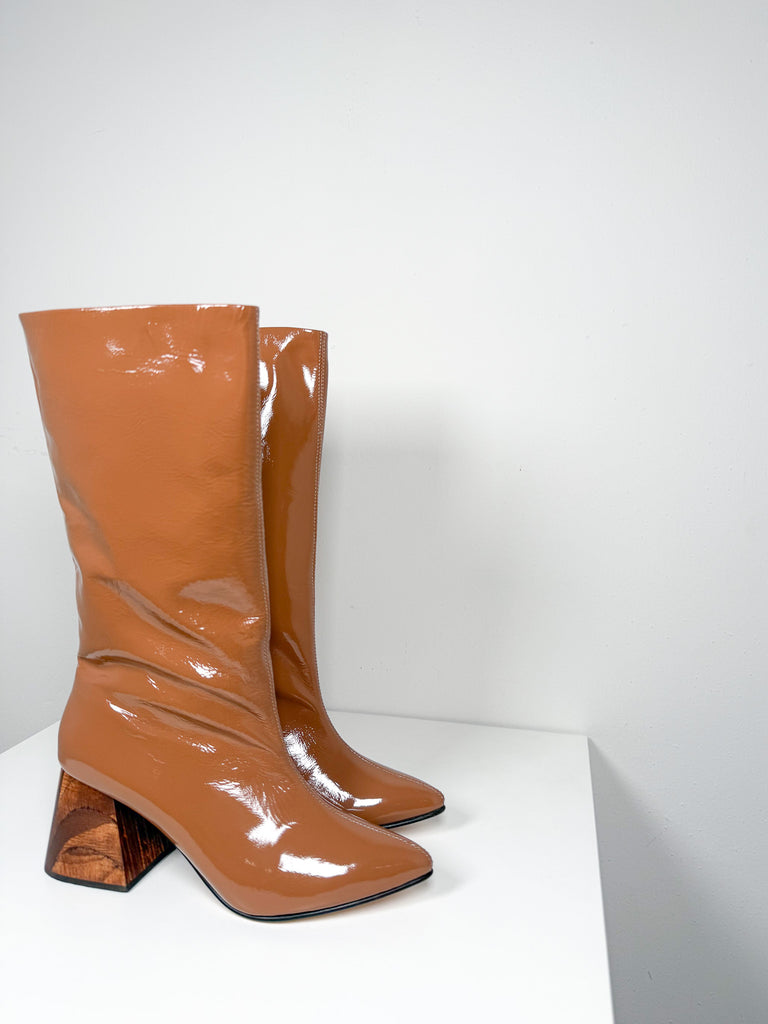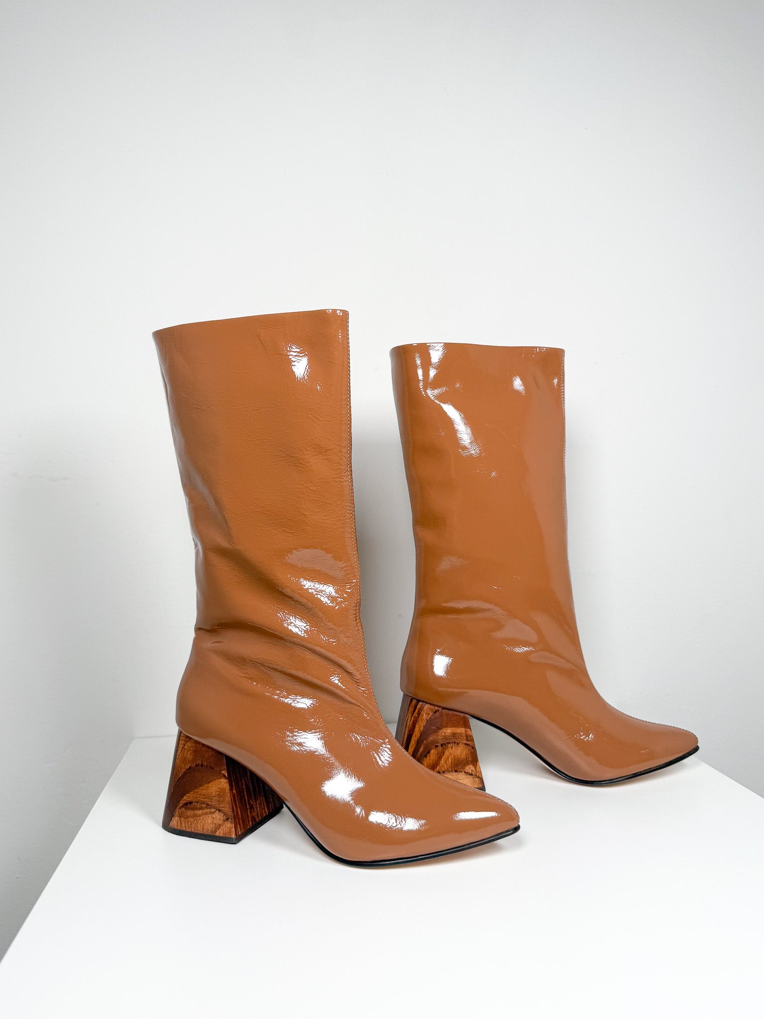 The Talulah boot features a mid-calf silhouette with pull-on construction, wooden block heel, and pointed almond toe in a latte color. A neutral staple designed for versatile styling.