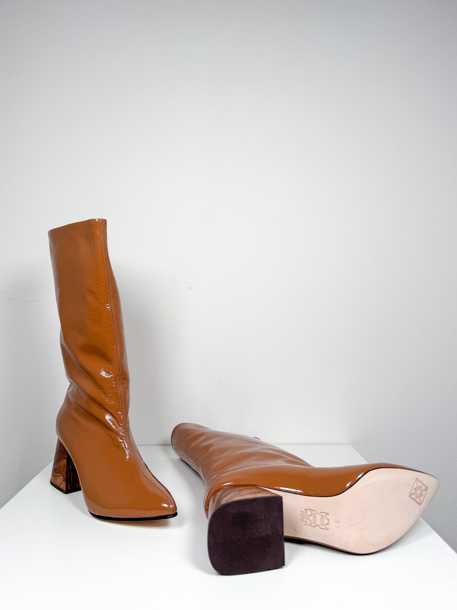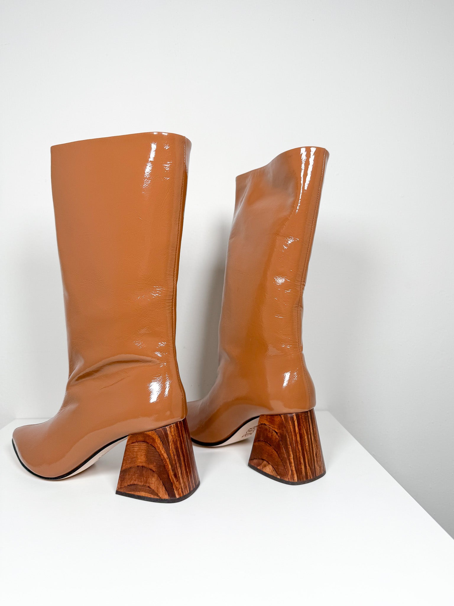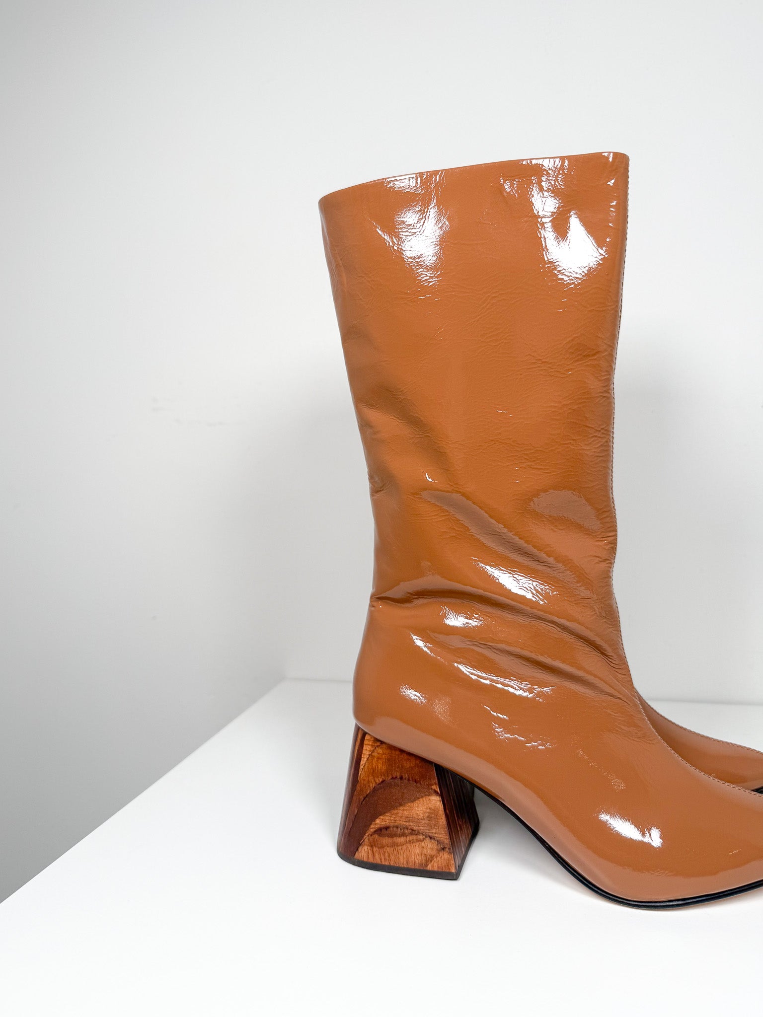 The Talulah boot features a mid-calf silhouette with pull-on construction, wooden block heel, and pointed almond toe in a latte color. A neutral staple designed for versatile styling.