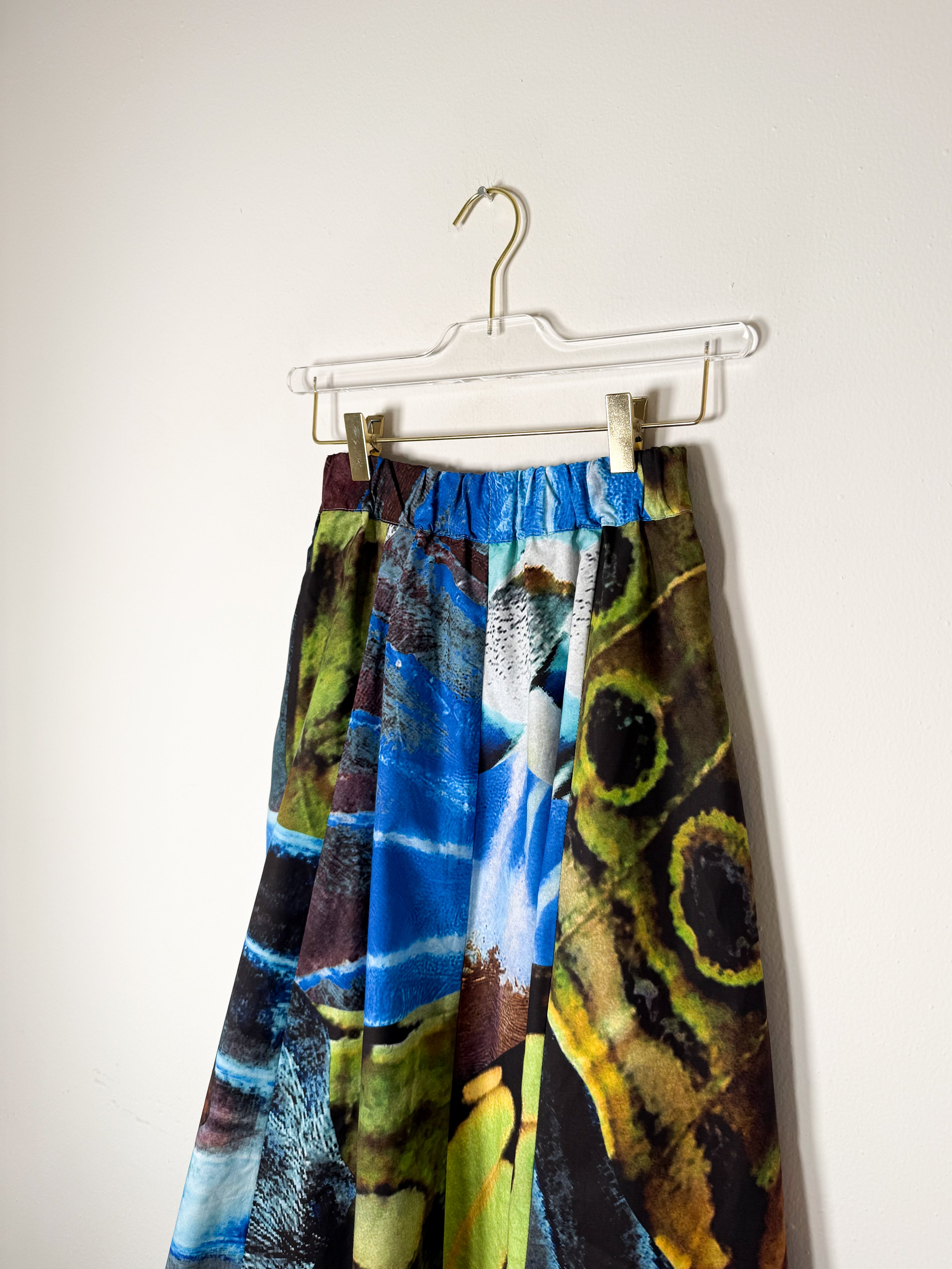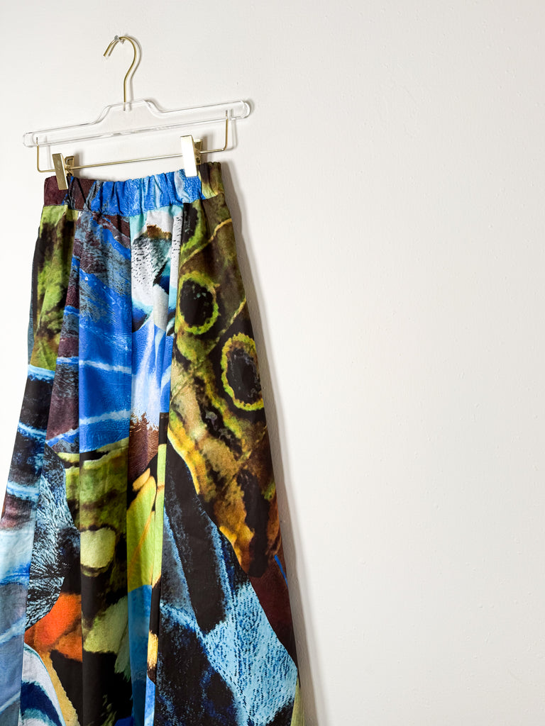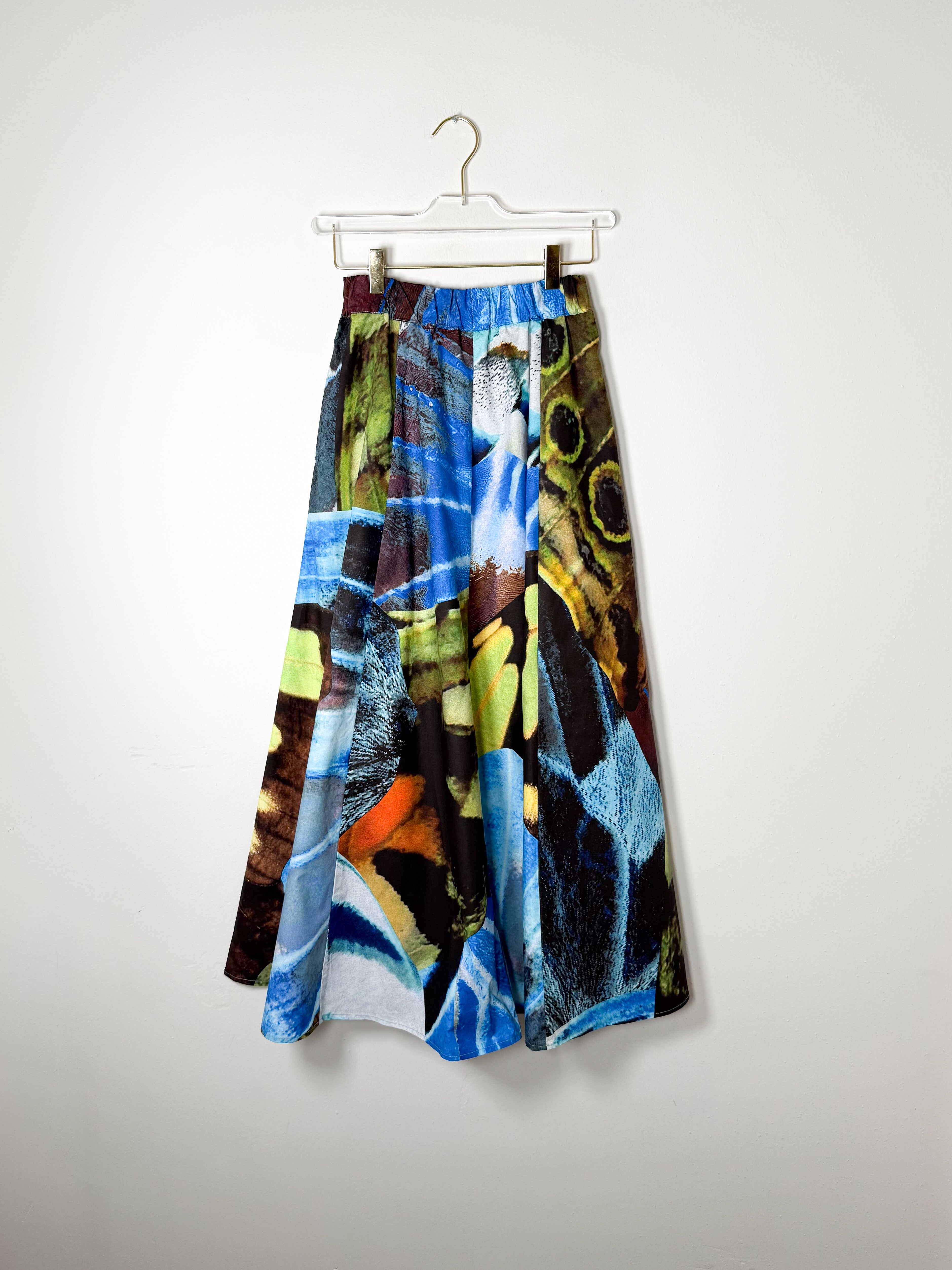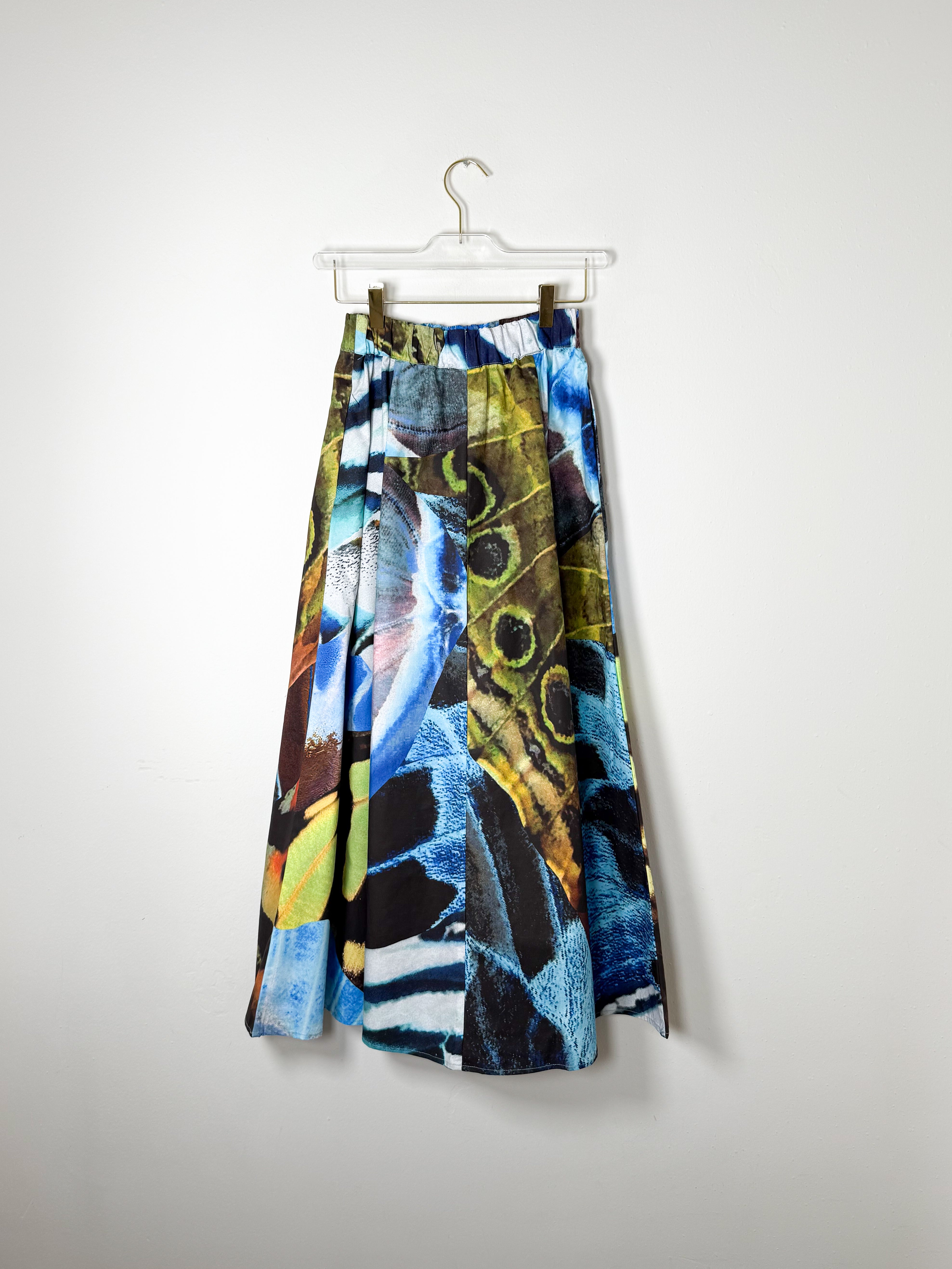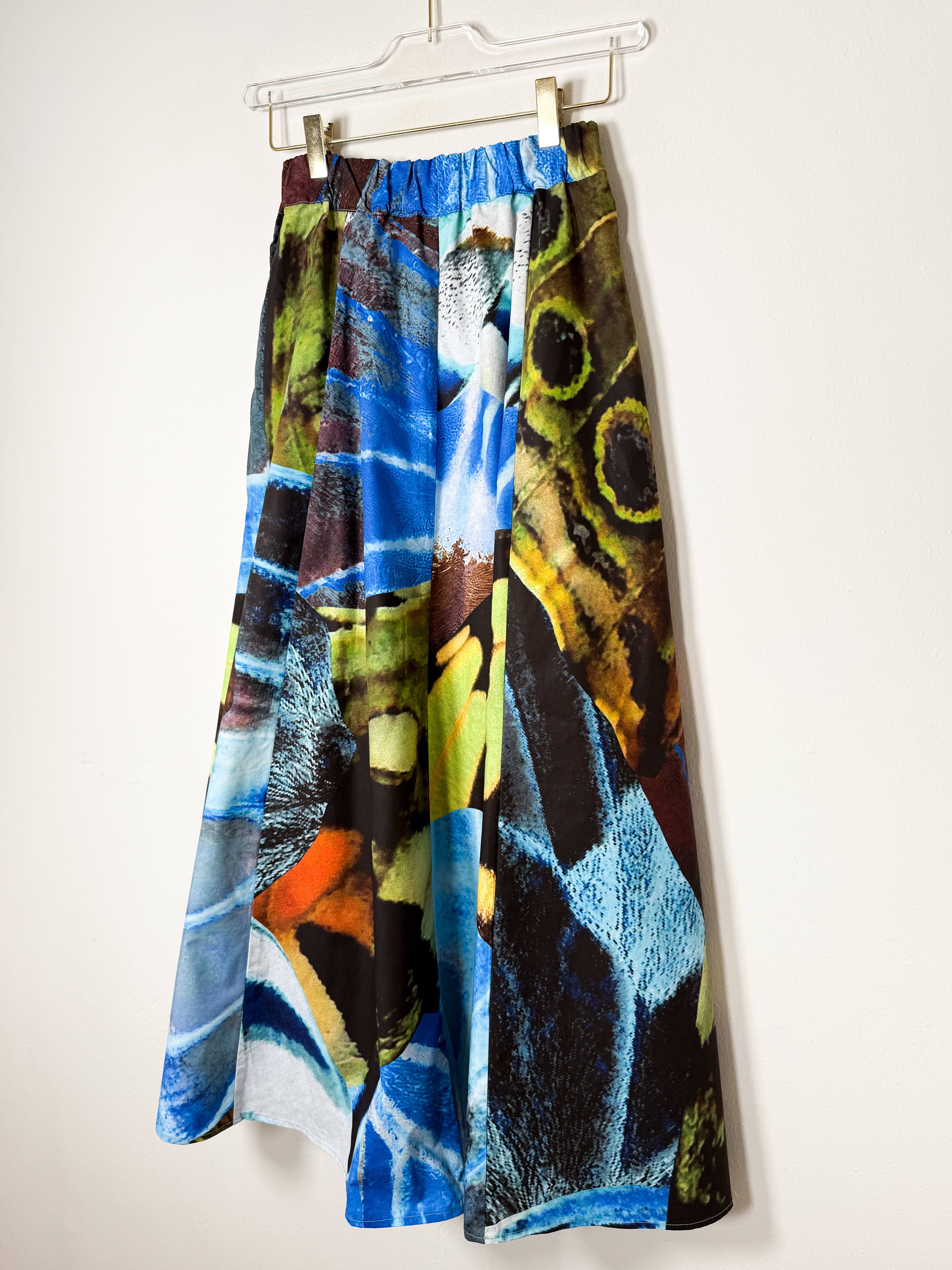 Pull-on elastic waistband skit, A-line silhouette, side pockets for essentials, and a striking monarch print.  The print varies from garment to garment - please contact us for placement on a specific size.