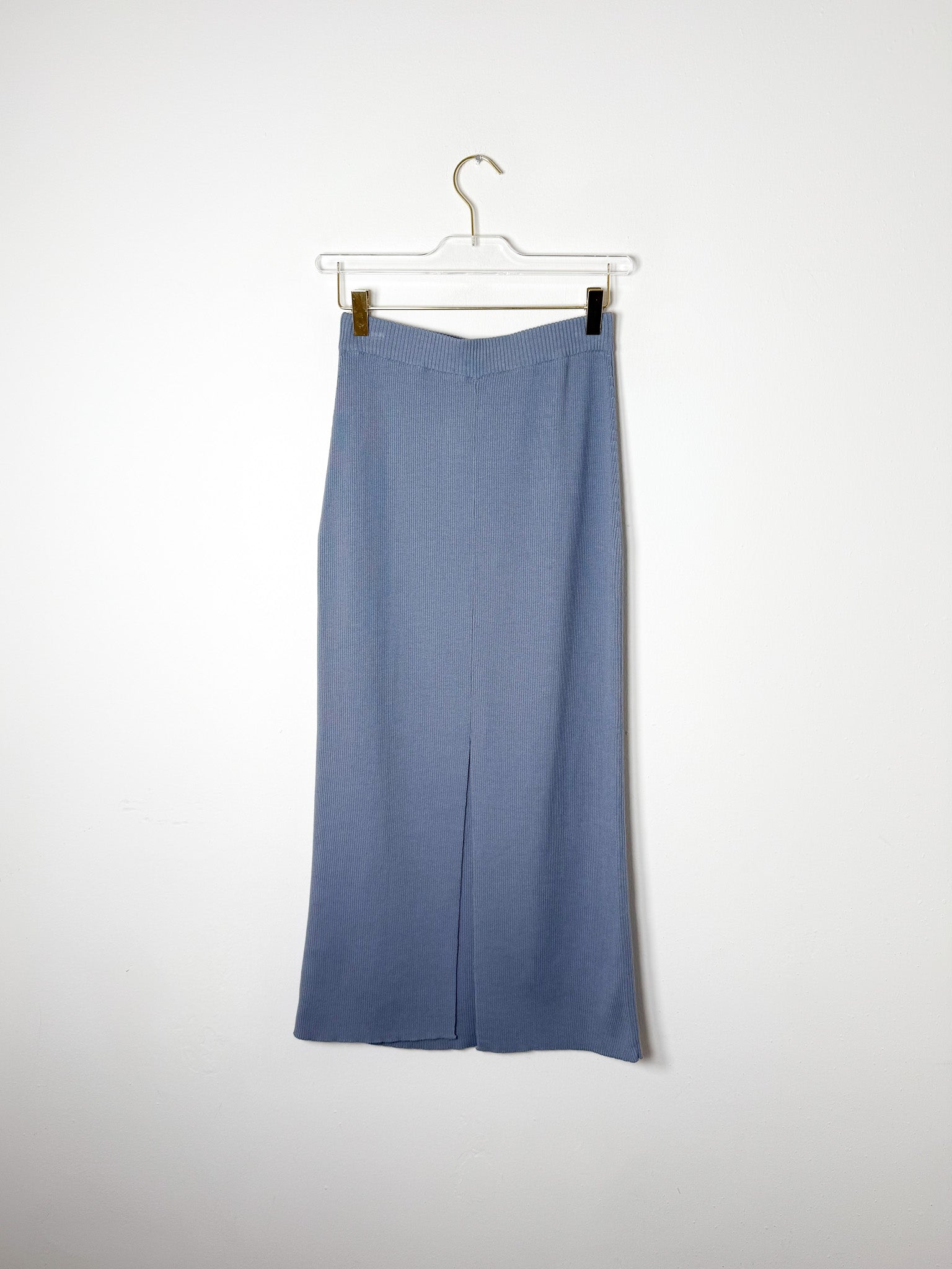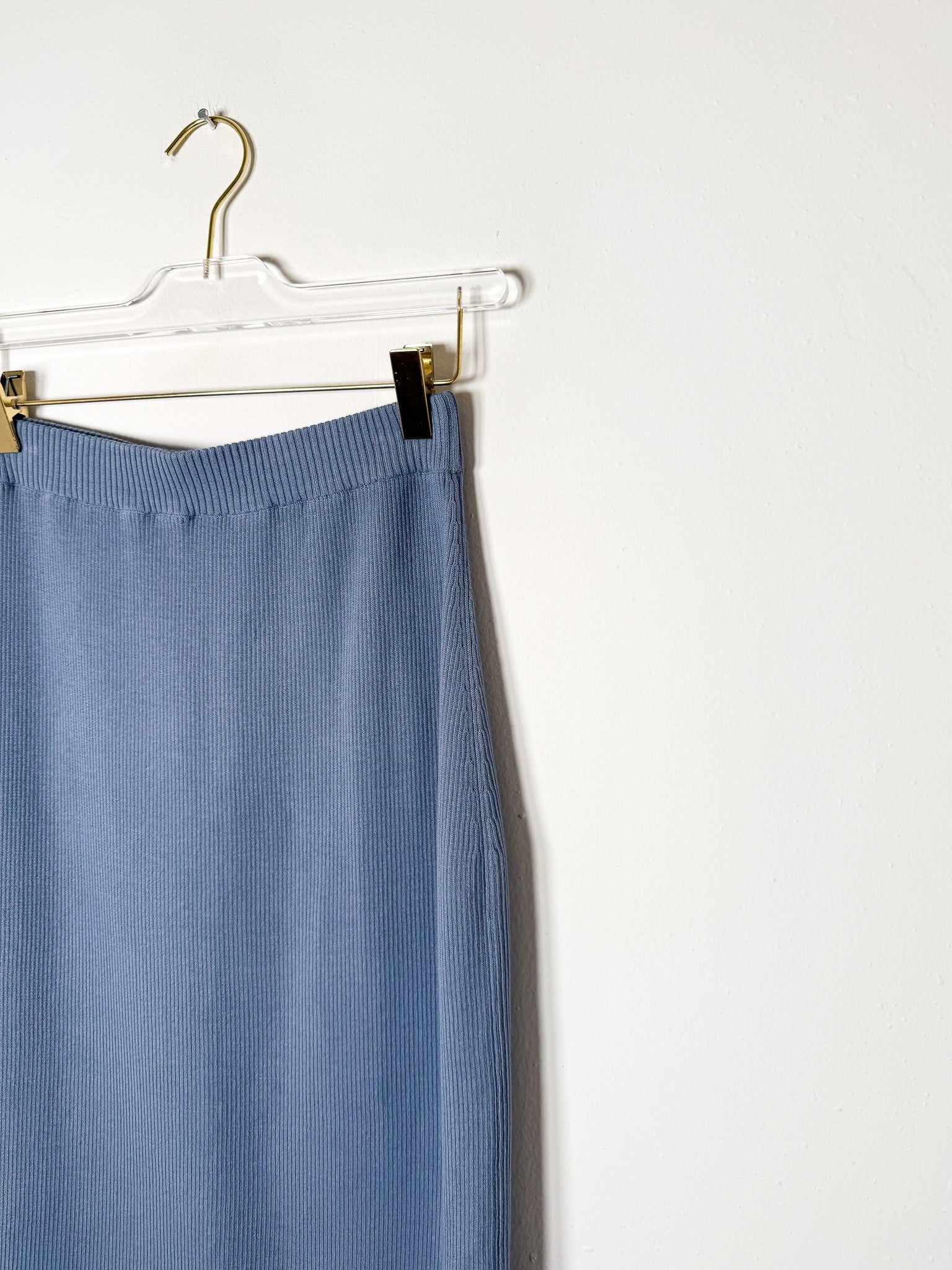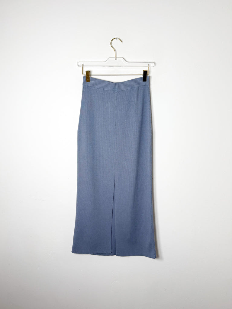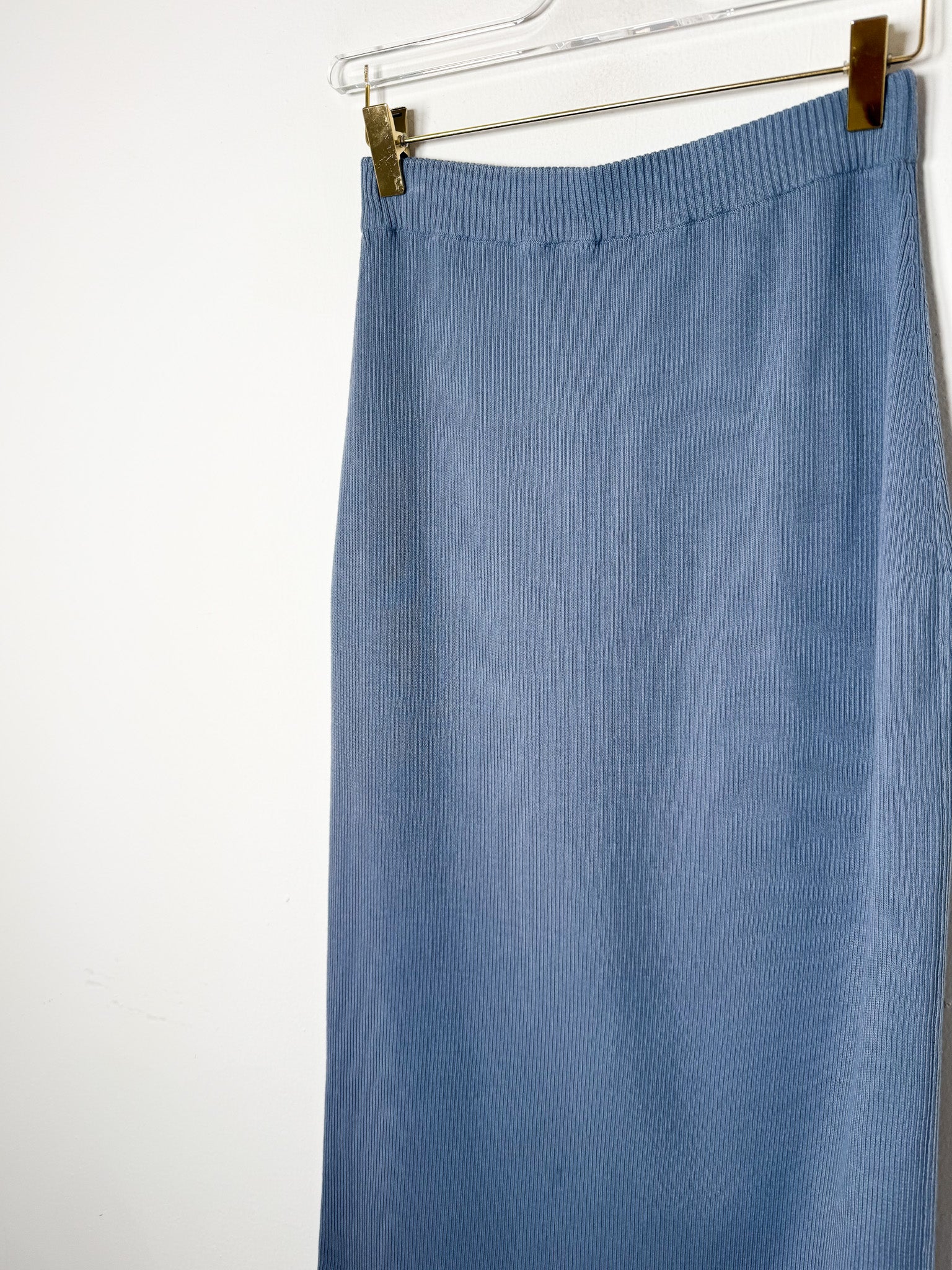 Pull-on midi skirt in ribbed fabric with an elastic waistband and back slit. Designed for comfort and ease of movement.