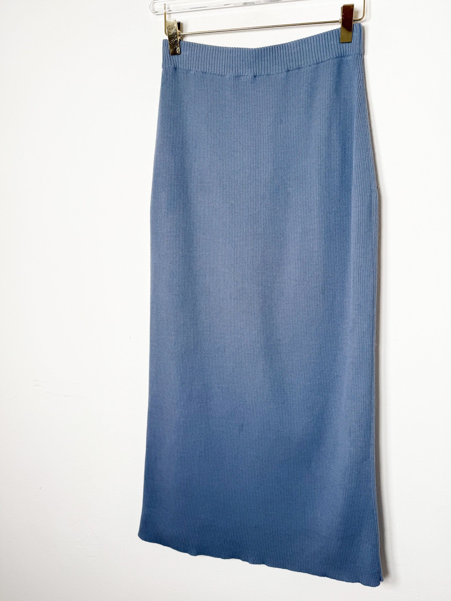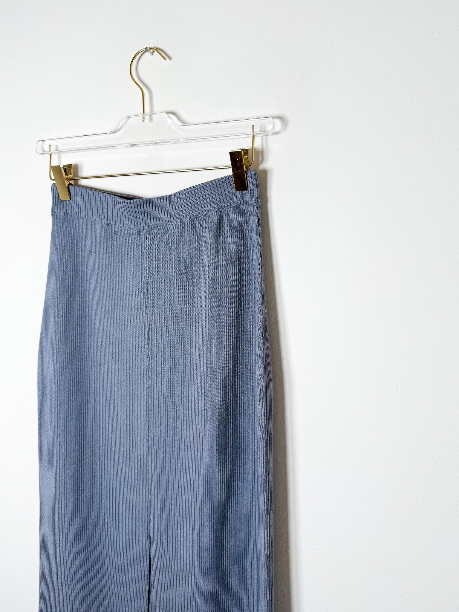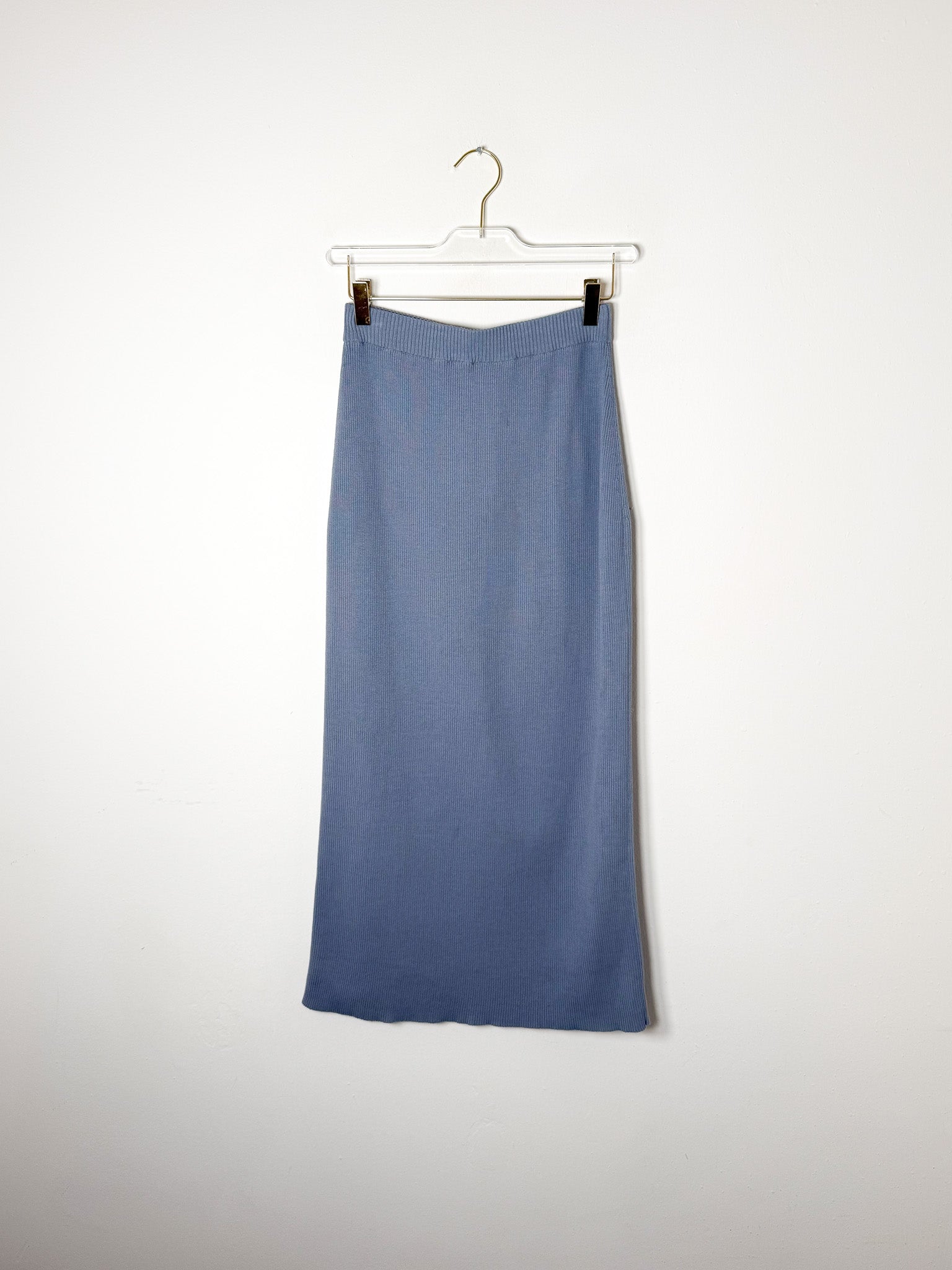 Pull-on midi skirt in ribbed fabric with an elastic waistband and back slit. Designed for comfort and ease of movement.