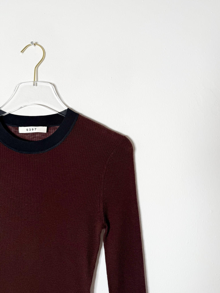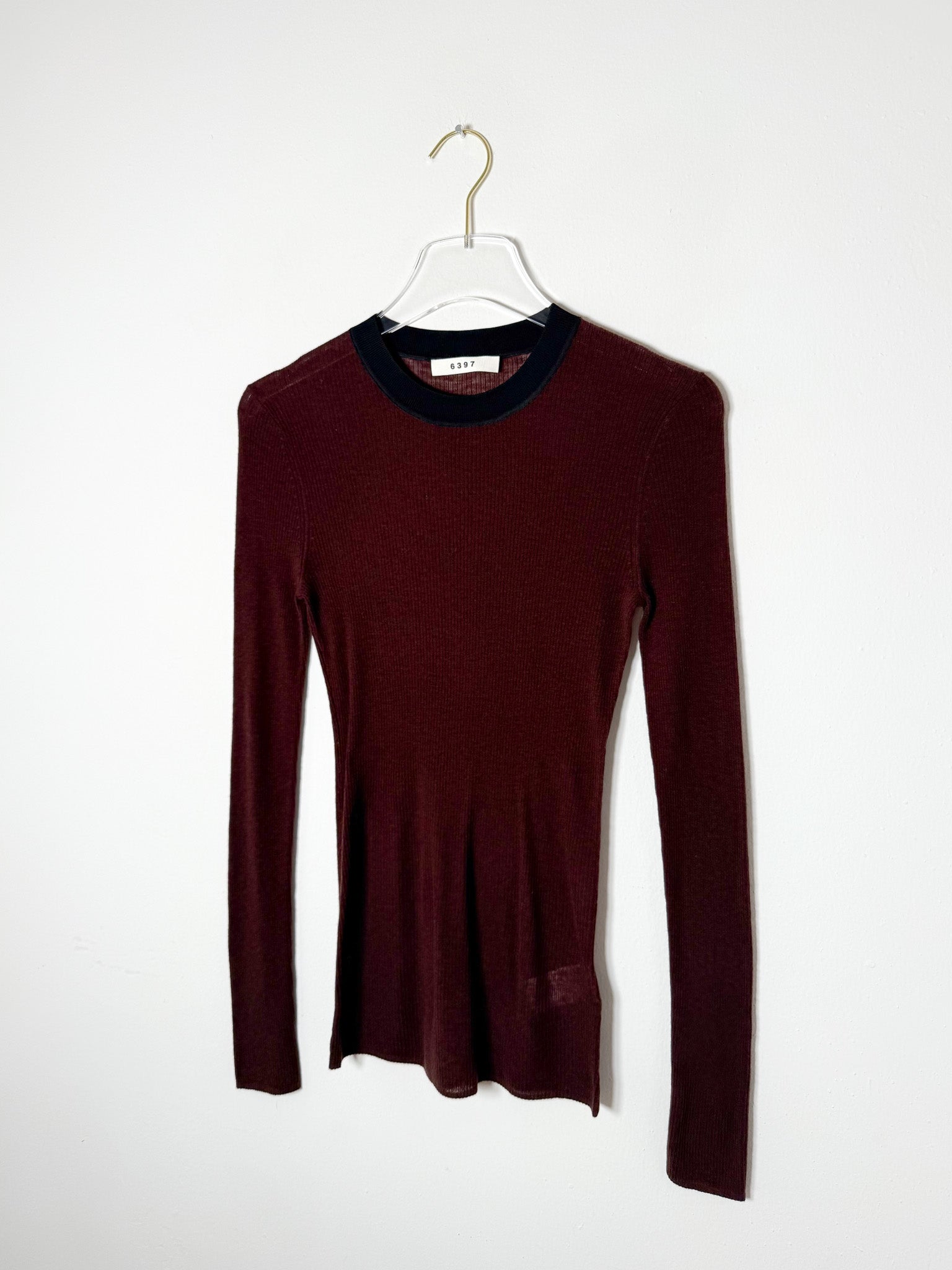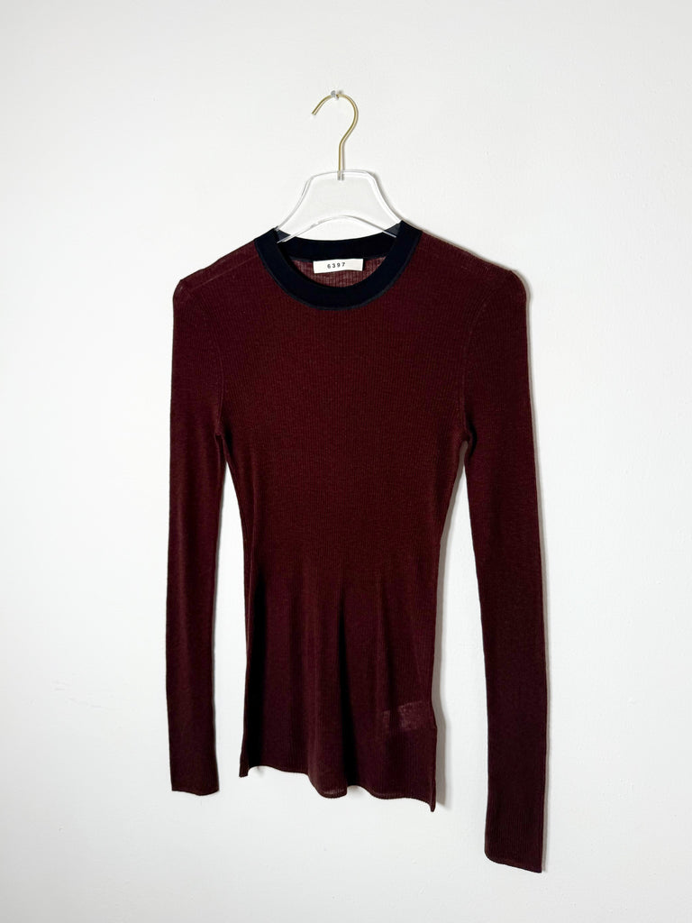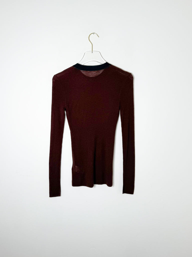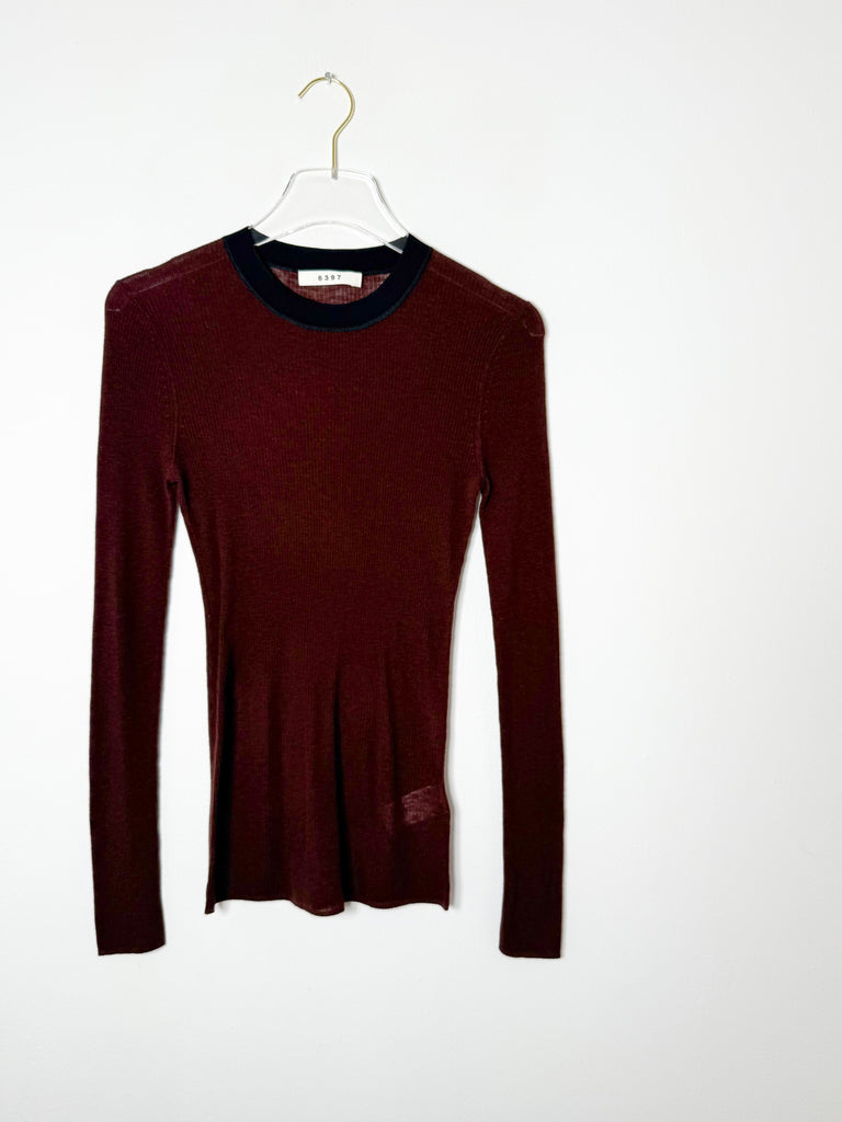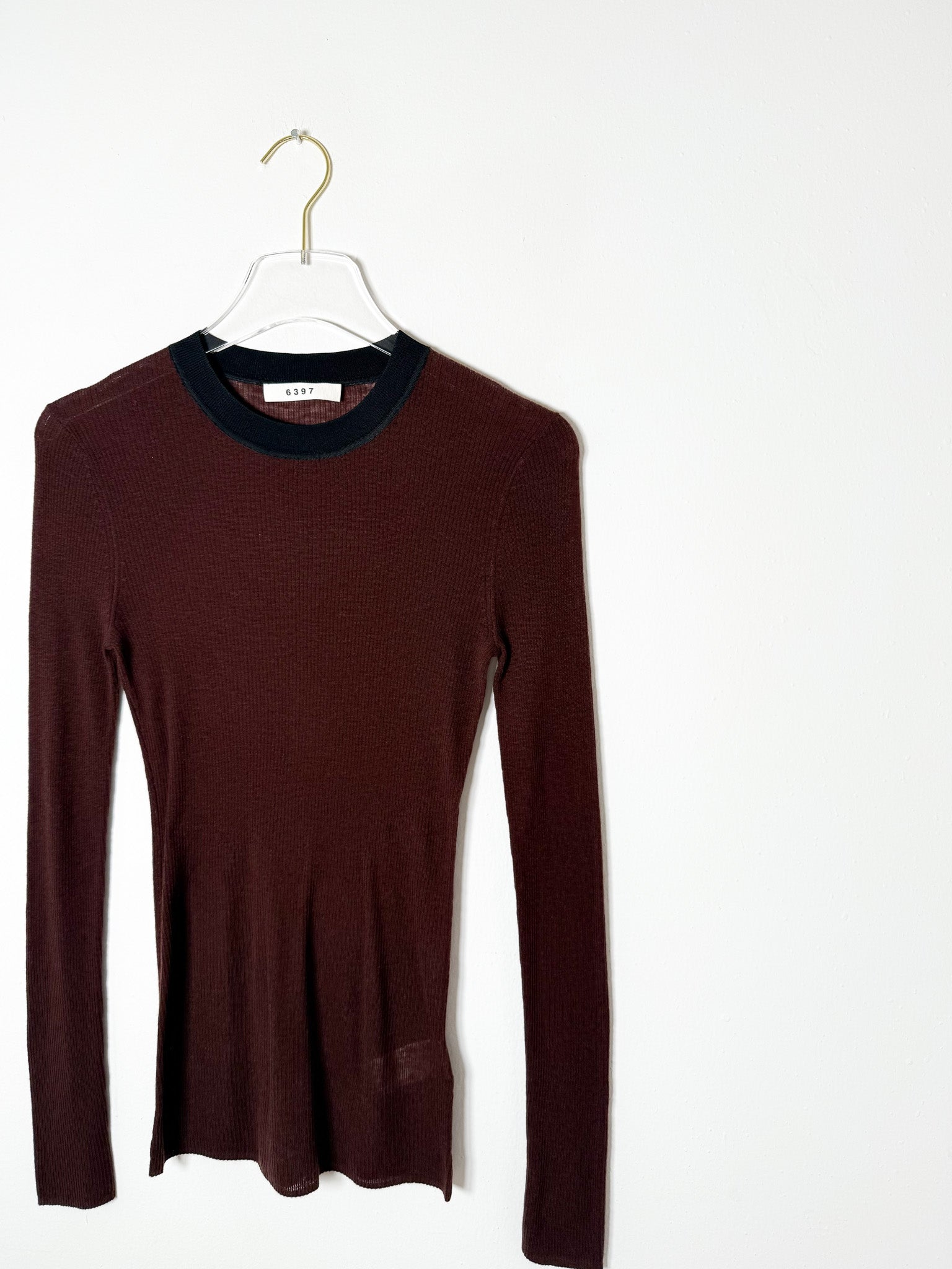 This fitted rib-knit sweater features a contrasting black collar and a subtly sheer finish, offering a refined yet effortless look.