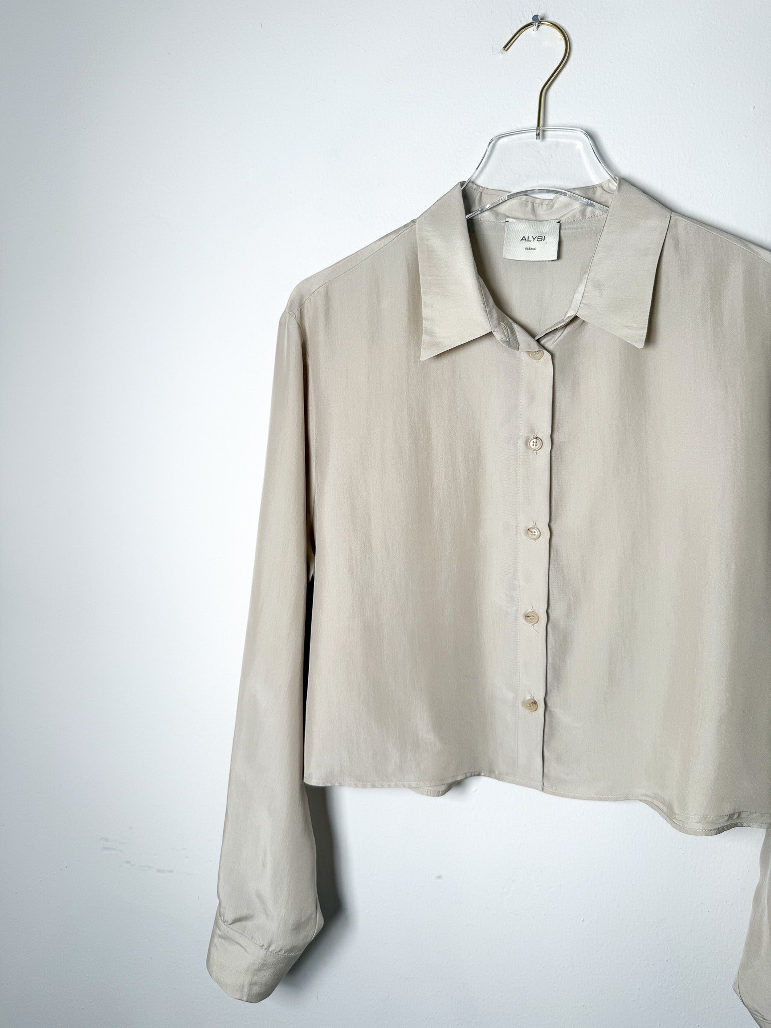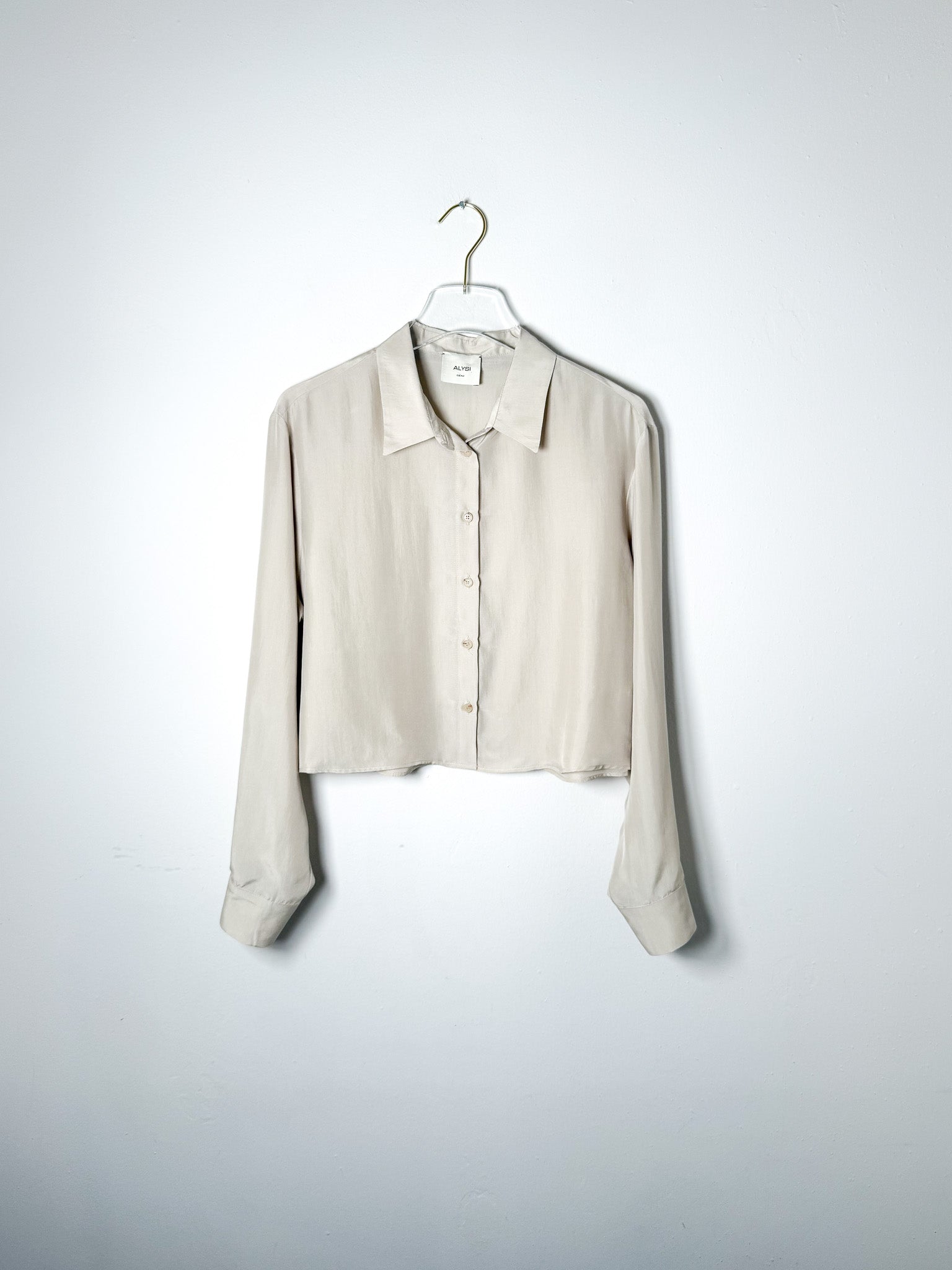 Button-front silk blouse with a shortened hemline. Designed in premium silk for a clean, minimalist silhouette.