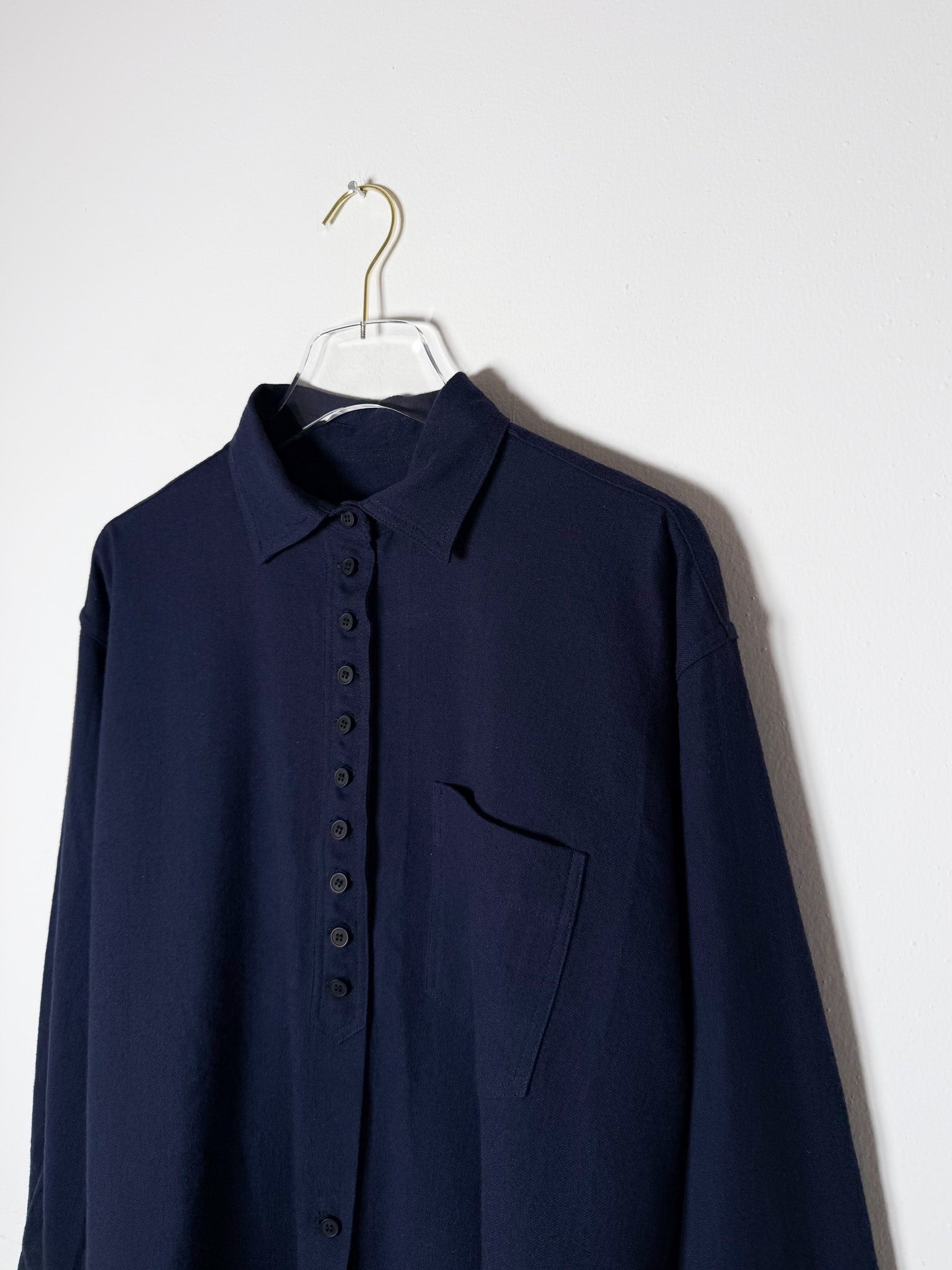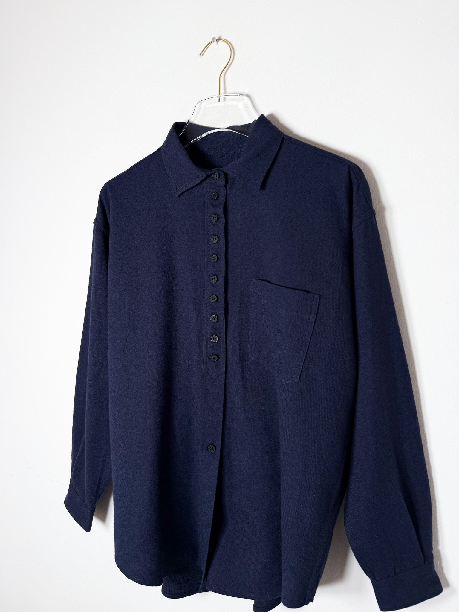 Constructed in Japanese brushed flannel, this oversized shirt combines a soft, touchable surface with an easy, unconfined silhouette. Long button closure and chest pocket deliver quiet, purposeful details.