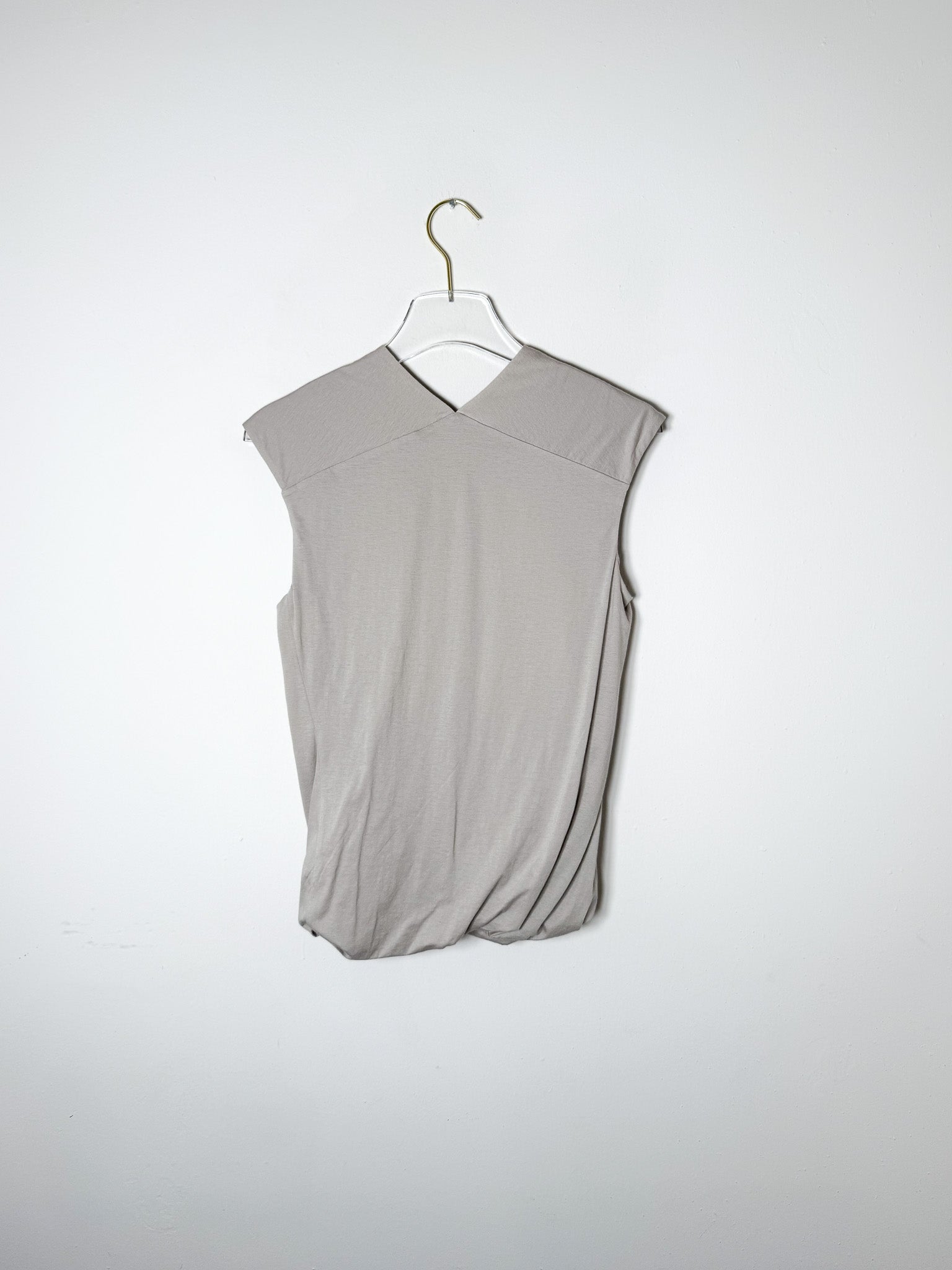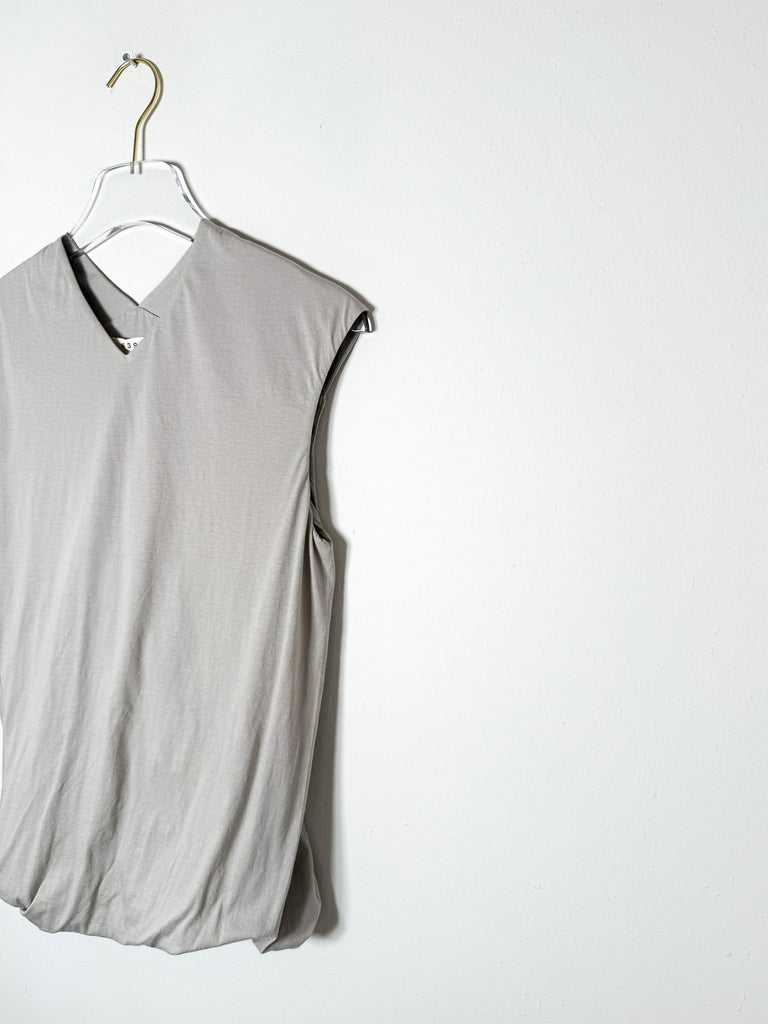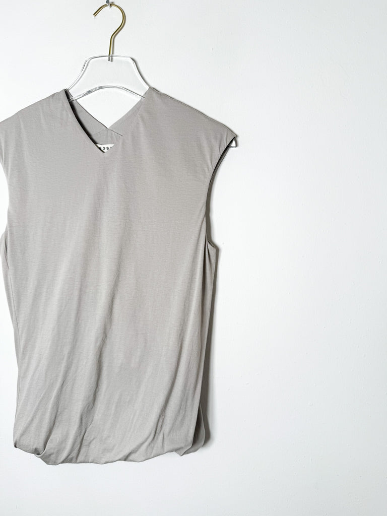 This sleeveless v-neck top features a soft cotton knit fabric and a double-layered design with a twisted hem. Versatile enough to dress up or down, it offers a fresh twist on a timeless look.