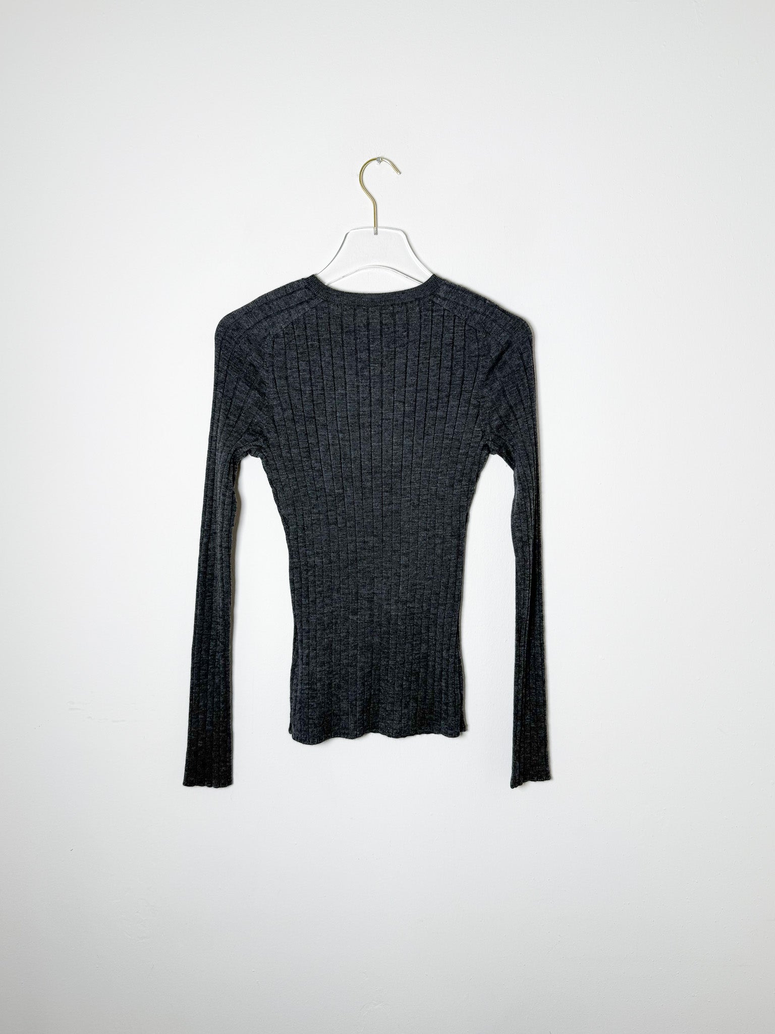 Fitted ribbed sweater with a high-v neckline.
