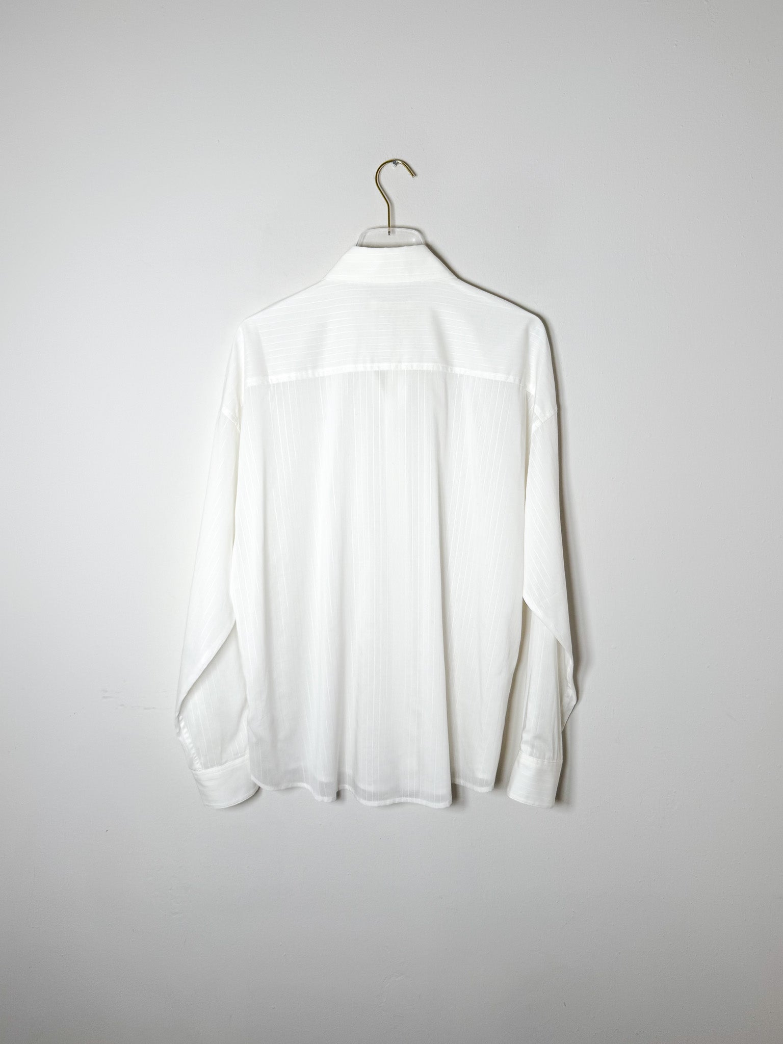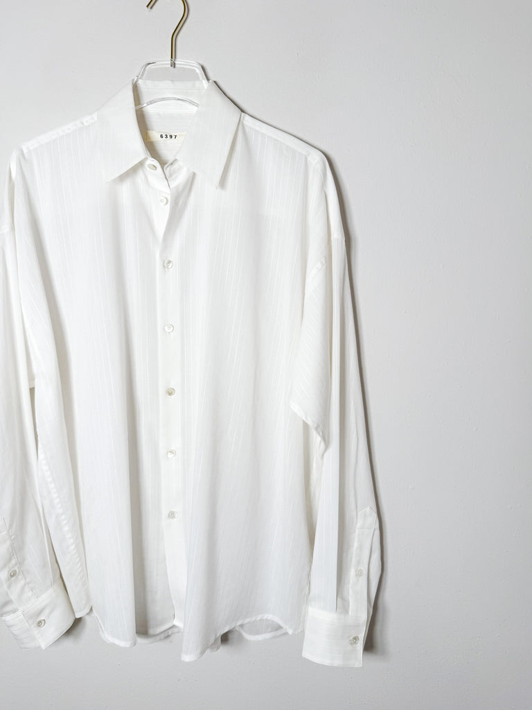 This oversized button-down blouse offers a relaxed fit, crafted from lightweight fabric with a delicate sheer pinstripe pattern.