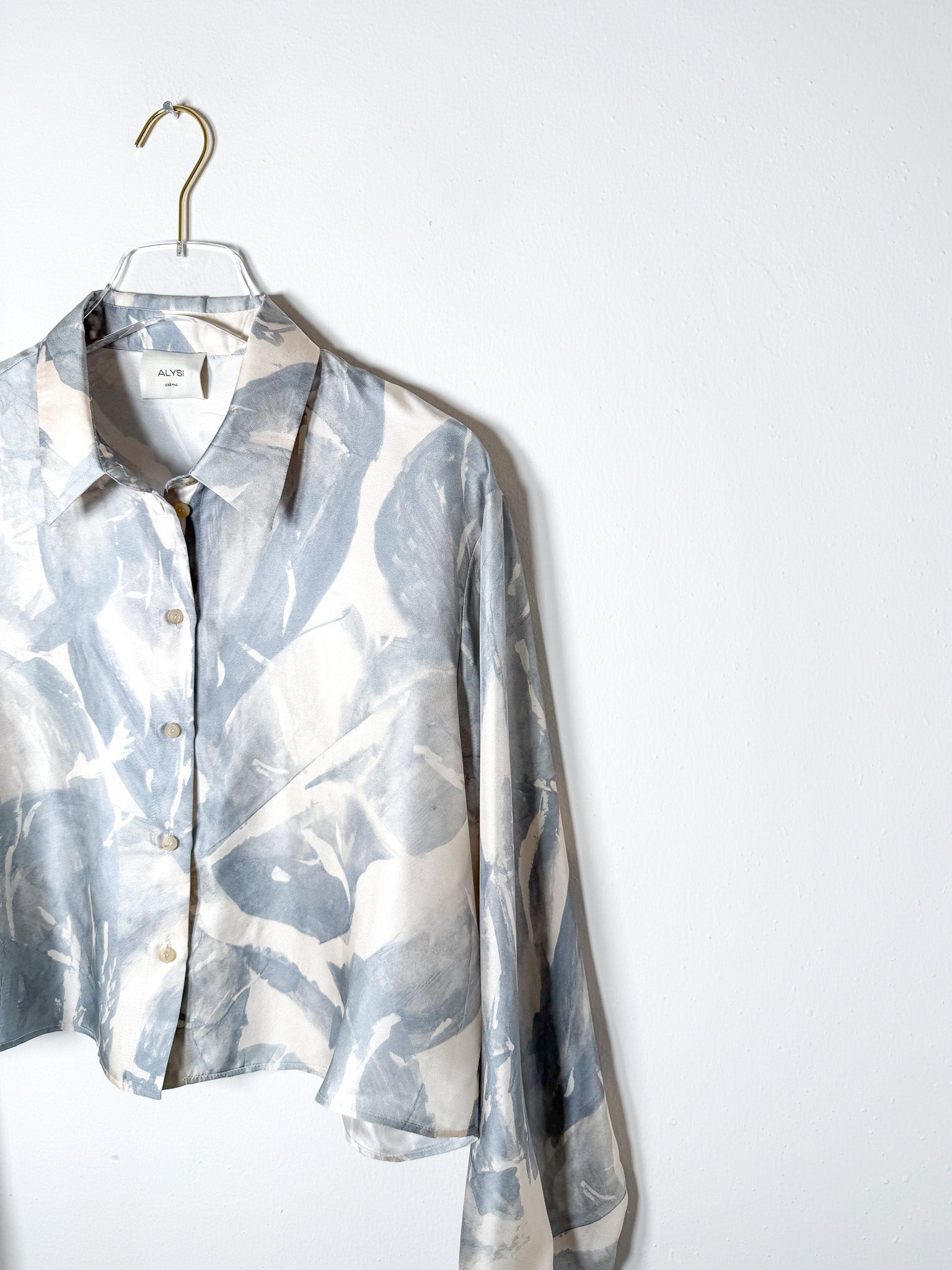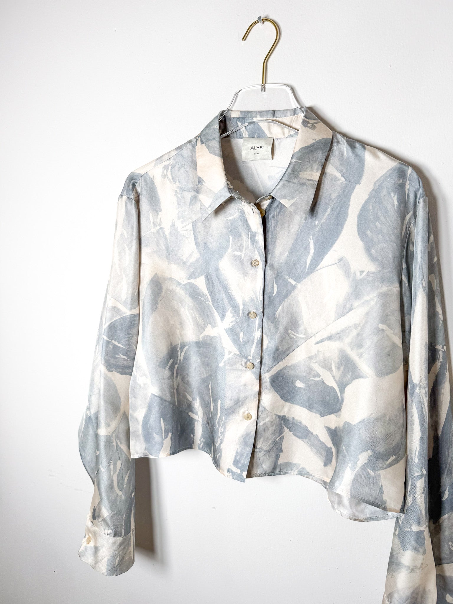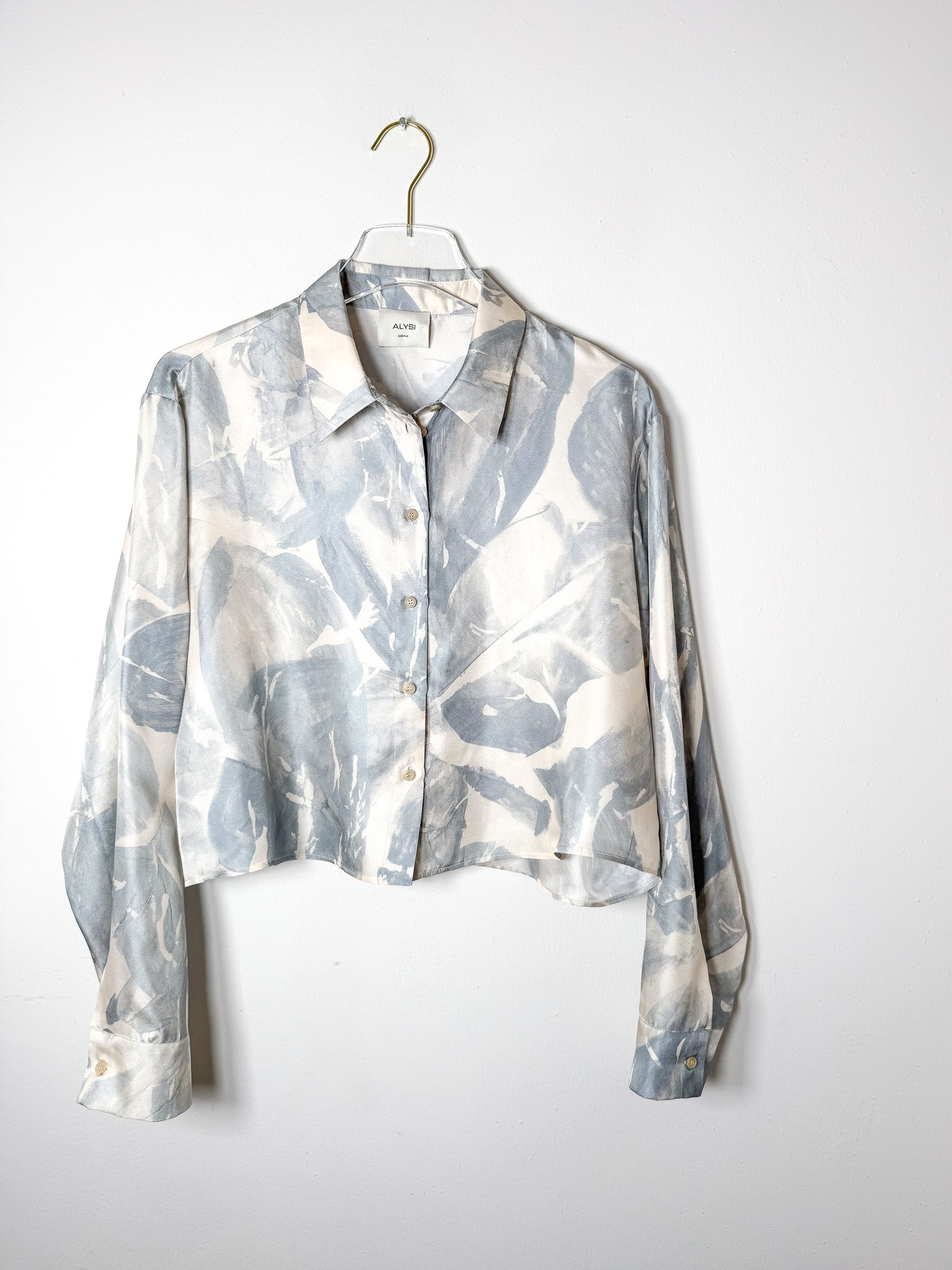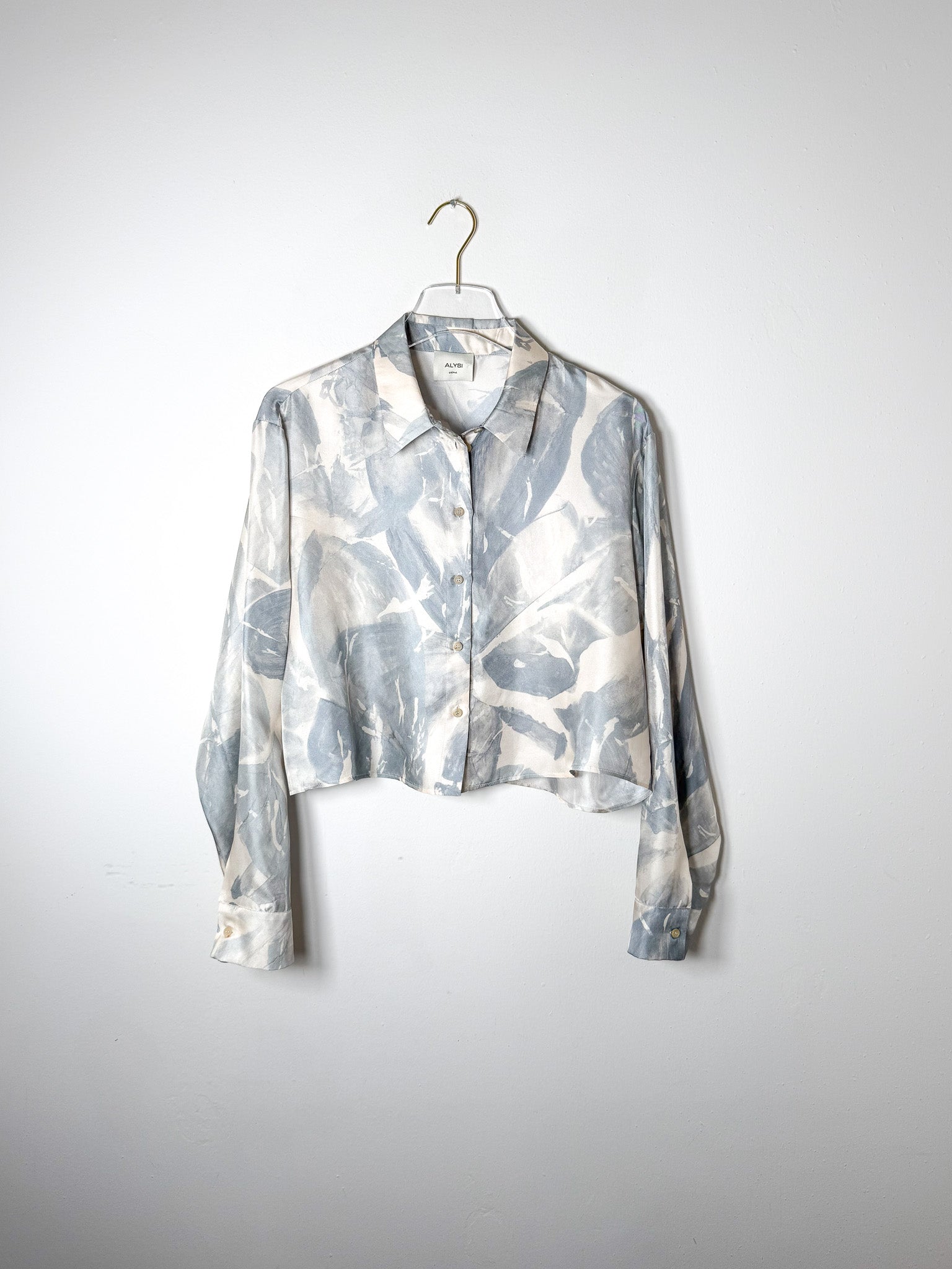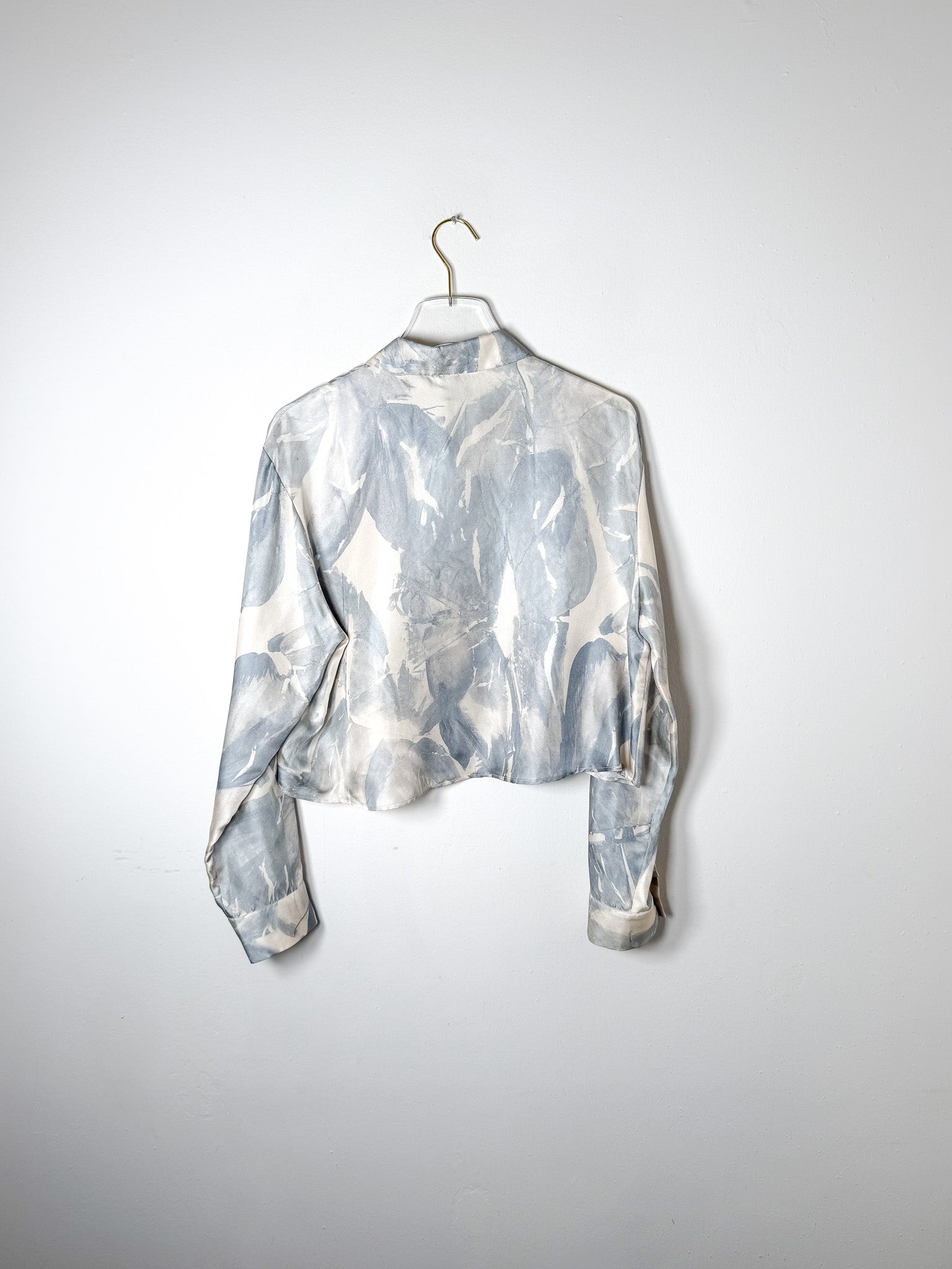 Cropped silk blouse with a delicate printed pattern.