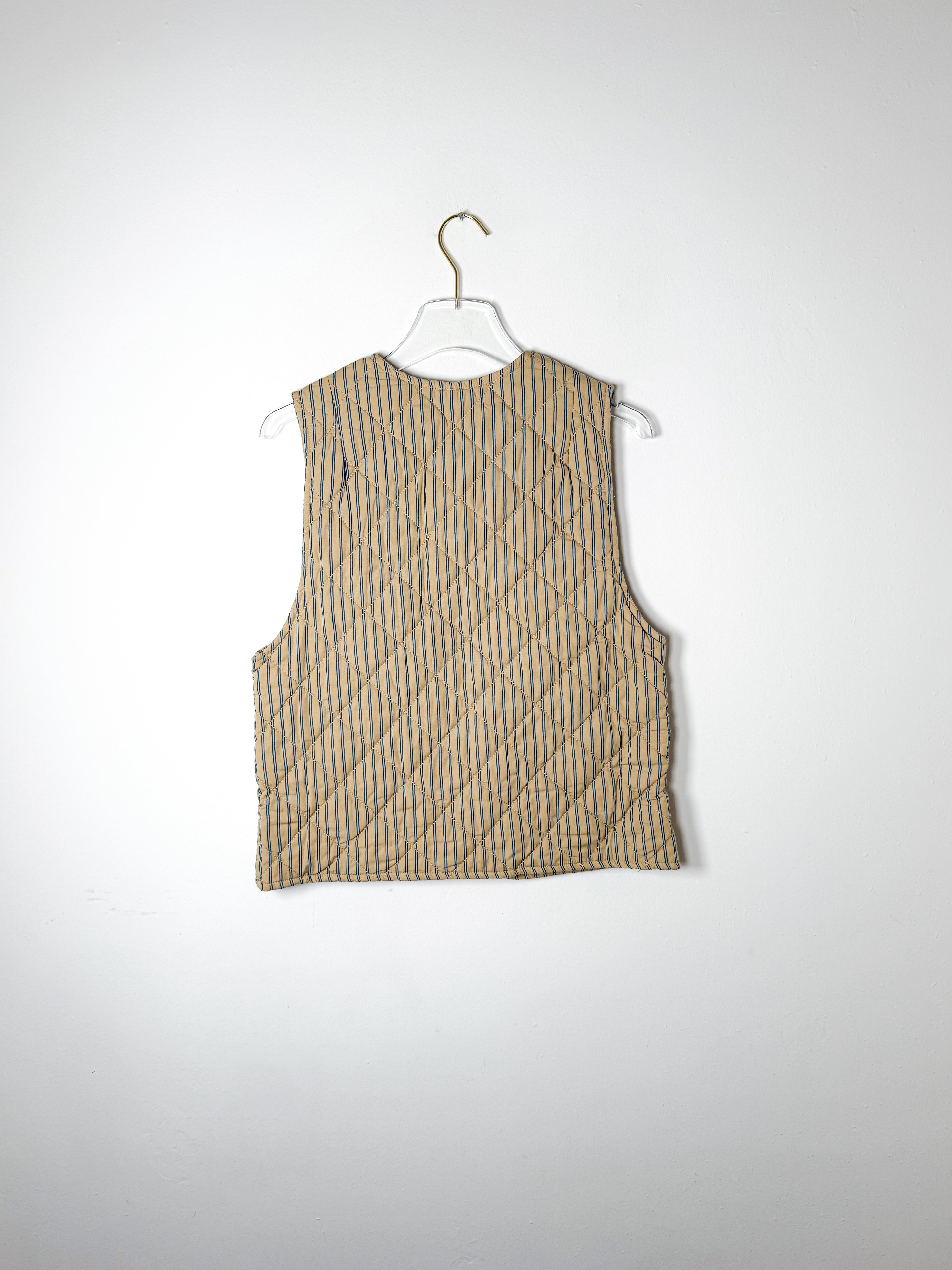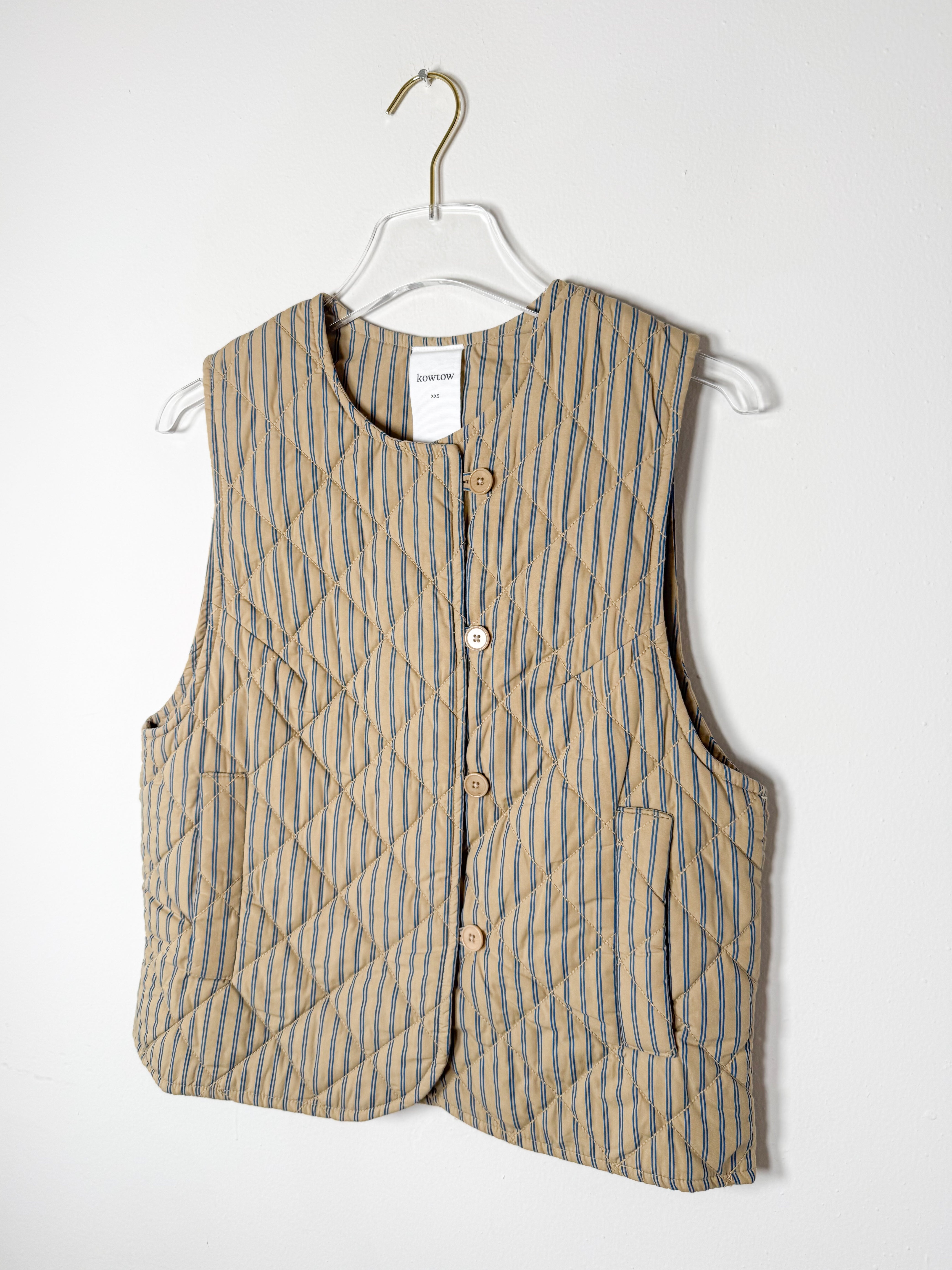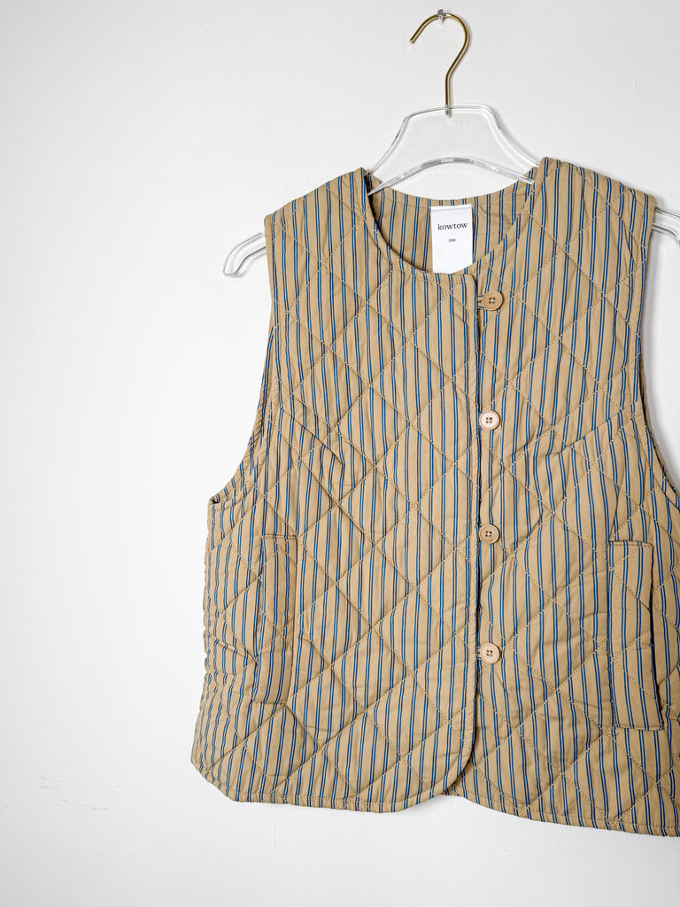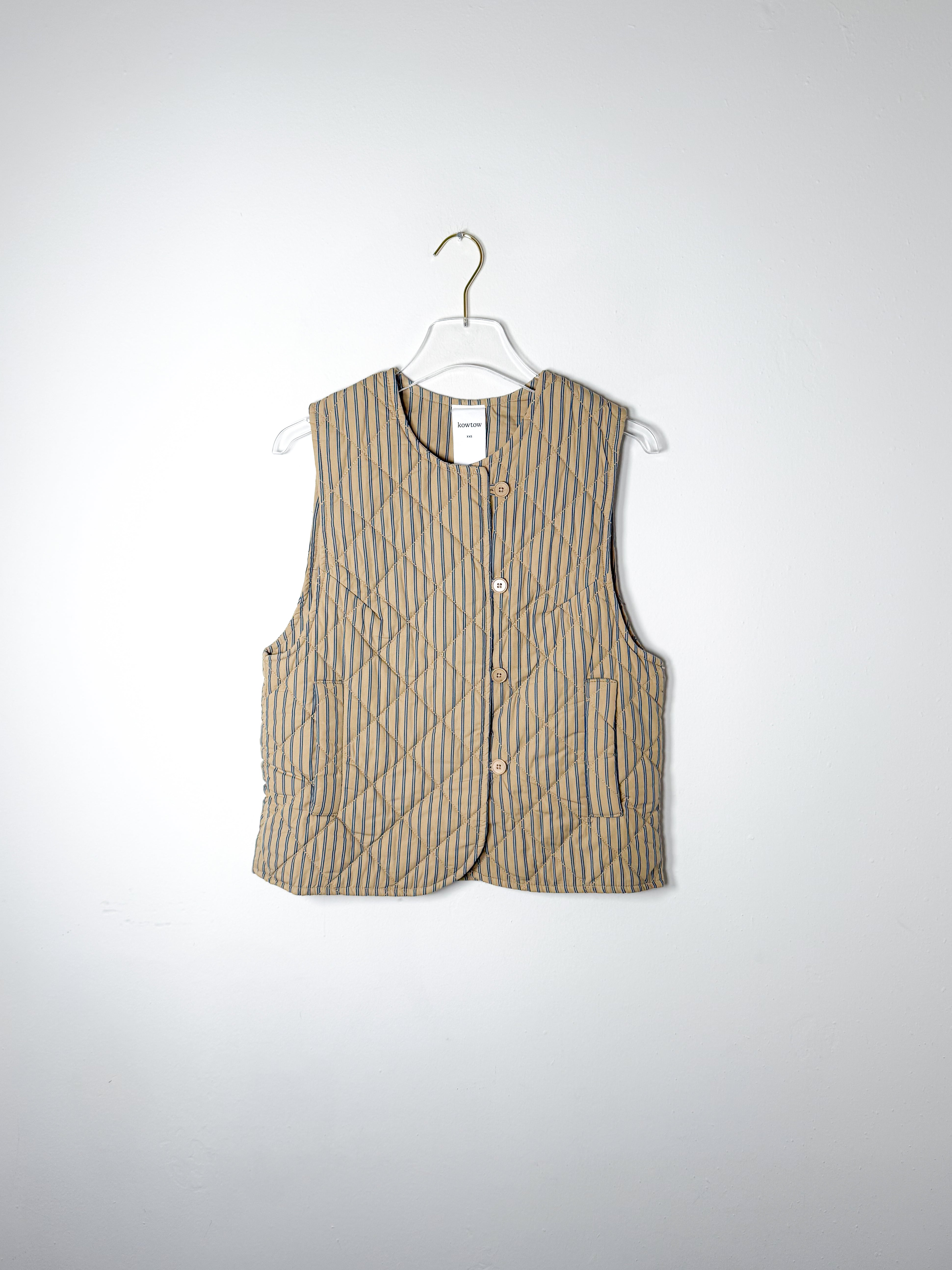A quilted vest cut with an easy, oversized shape and finished in a crisp double pinstripe. The crewneck sits comfortably layered or worn alone, while front buttons and pockets add practical detail to this versatile piece.