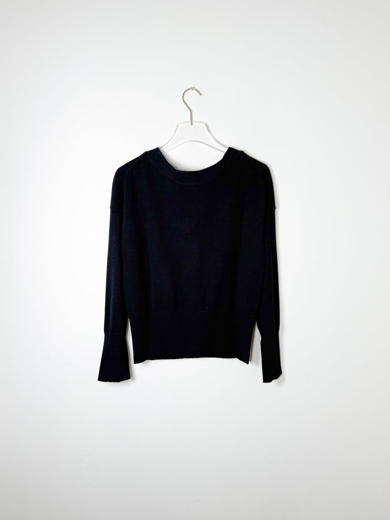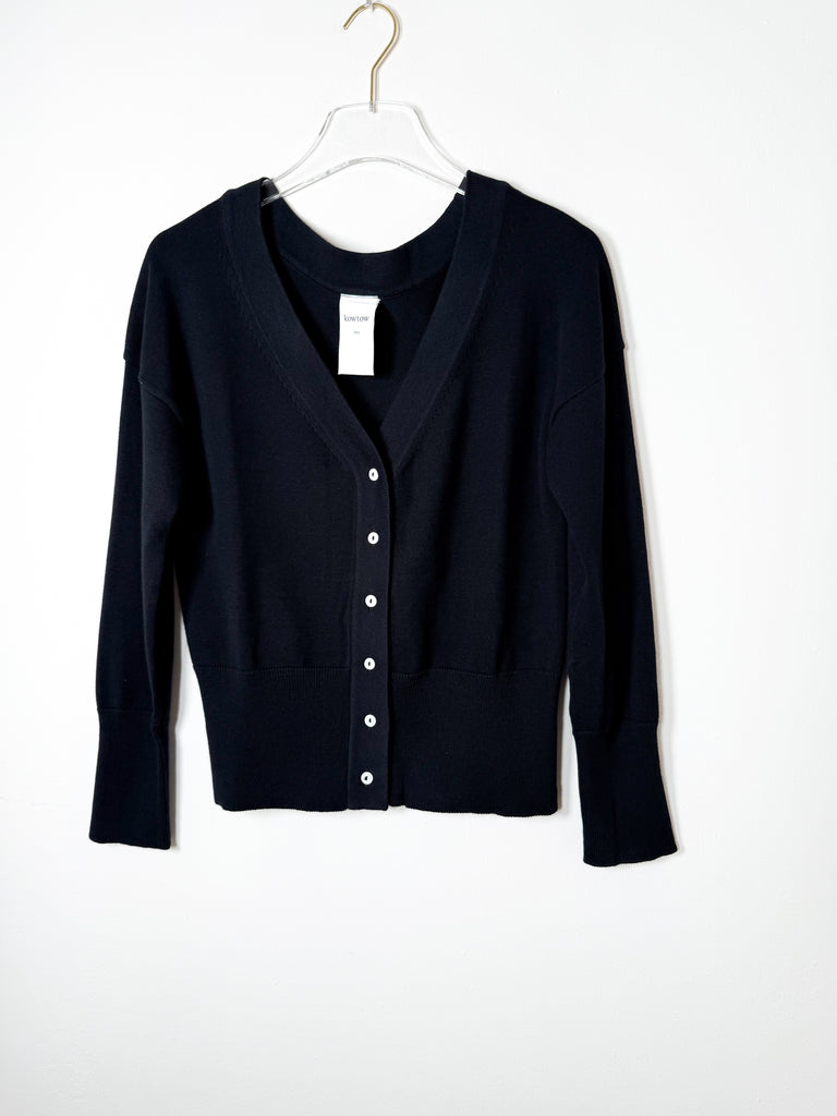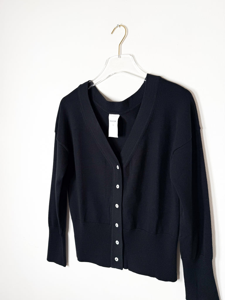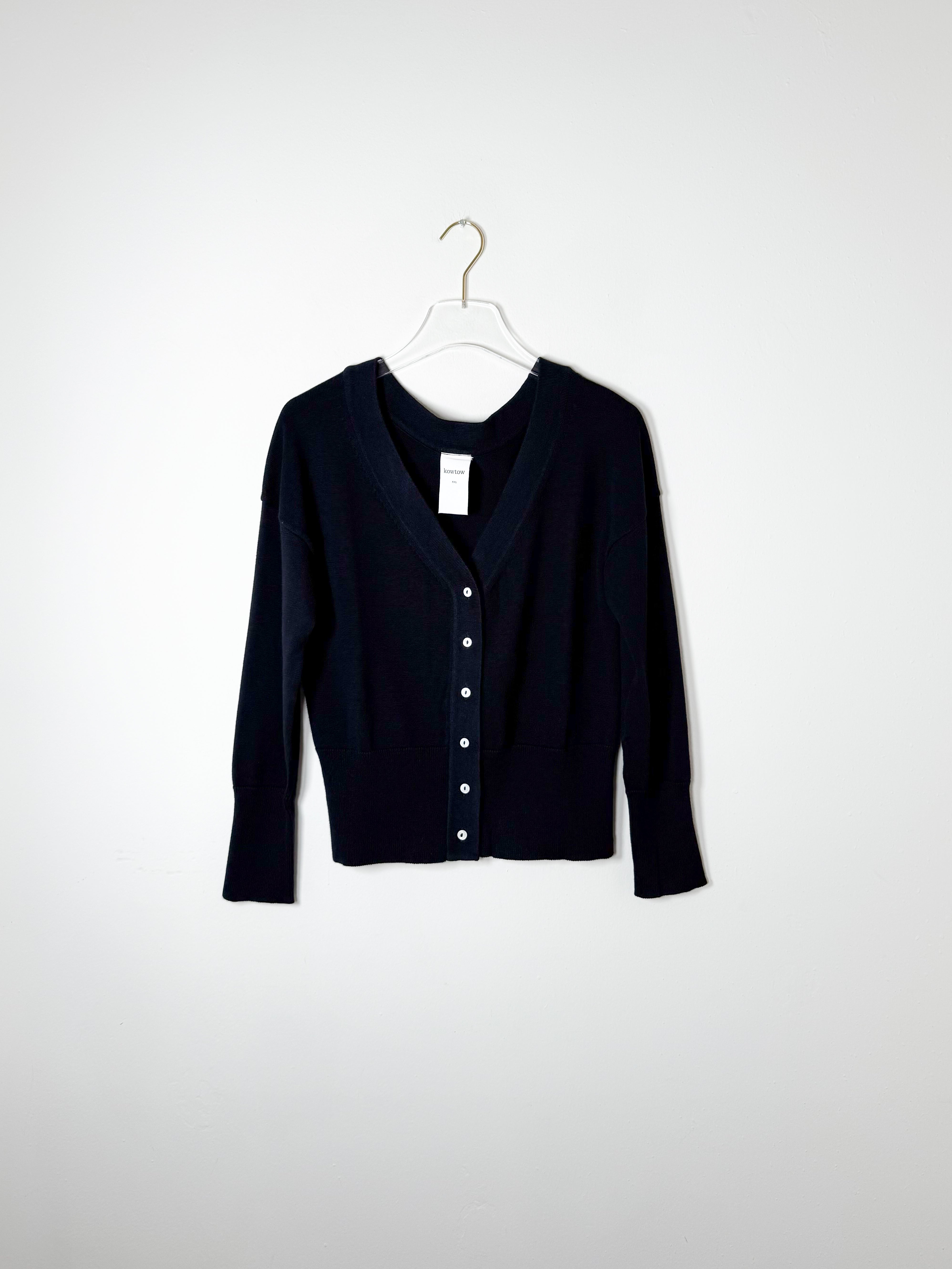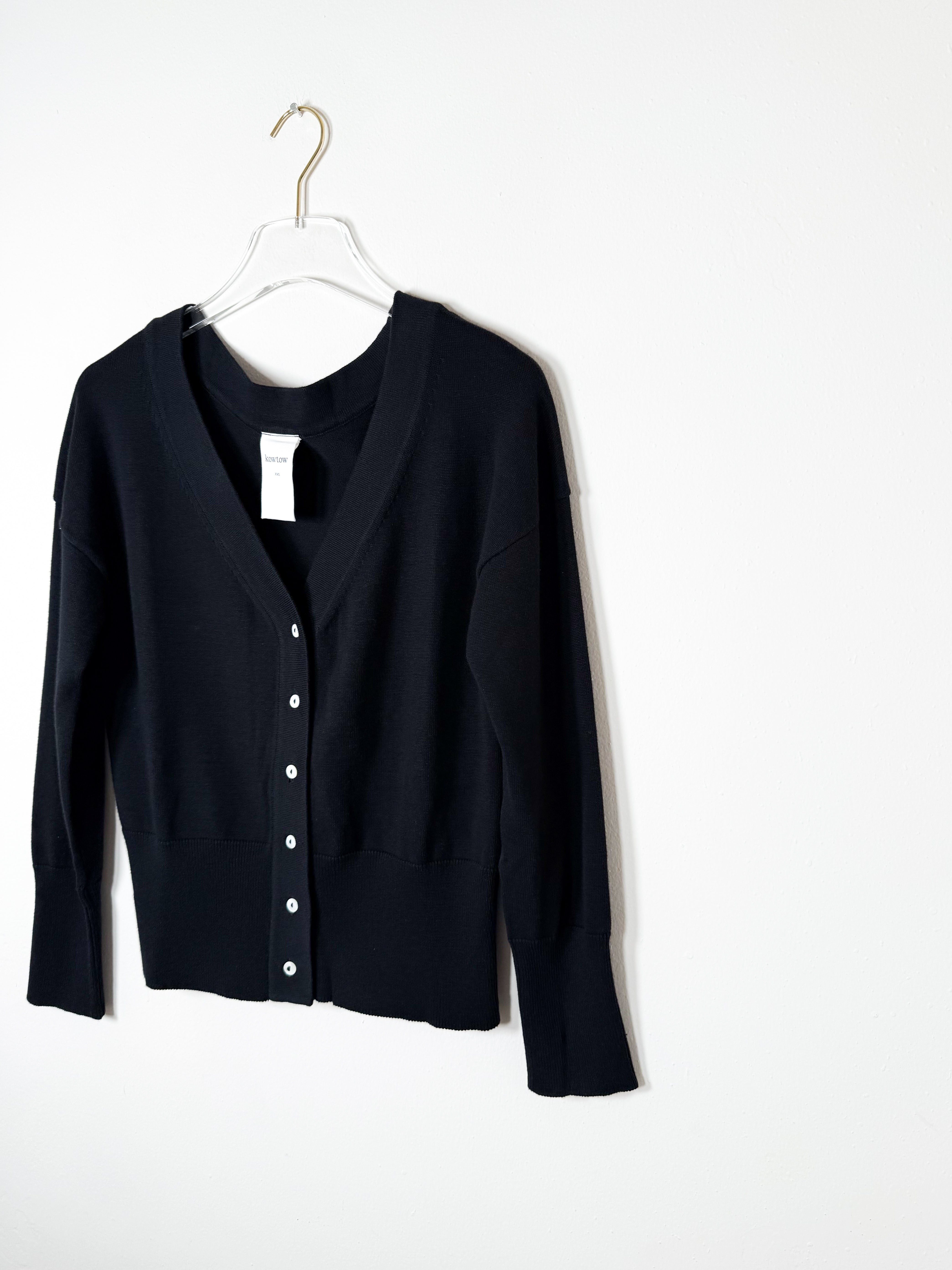 Relaxed cotton cardigan with a v-neckline and fitted waistband for gentle shaping. Bold ribbed cuffs and contrasting buttons add texture and visual weight to an understated layer that transitions seamlessly through seasons.