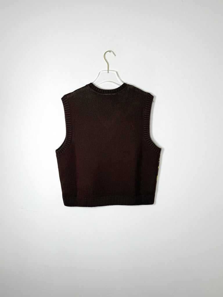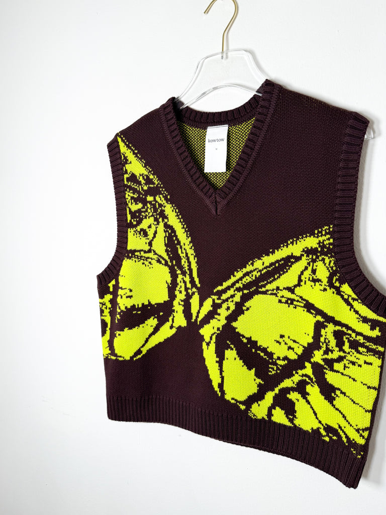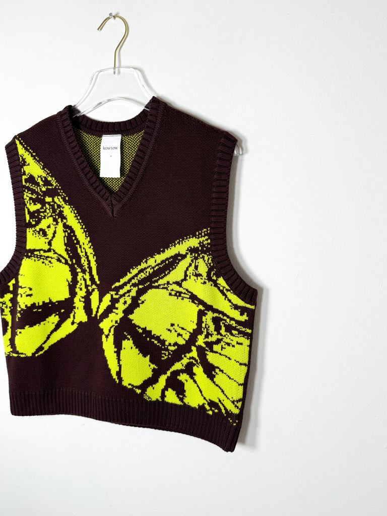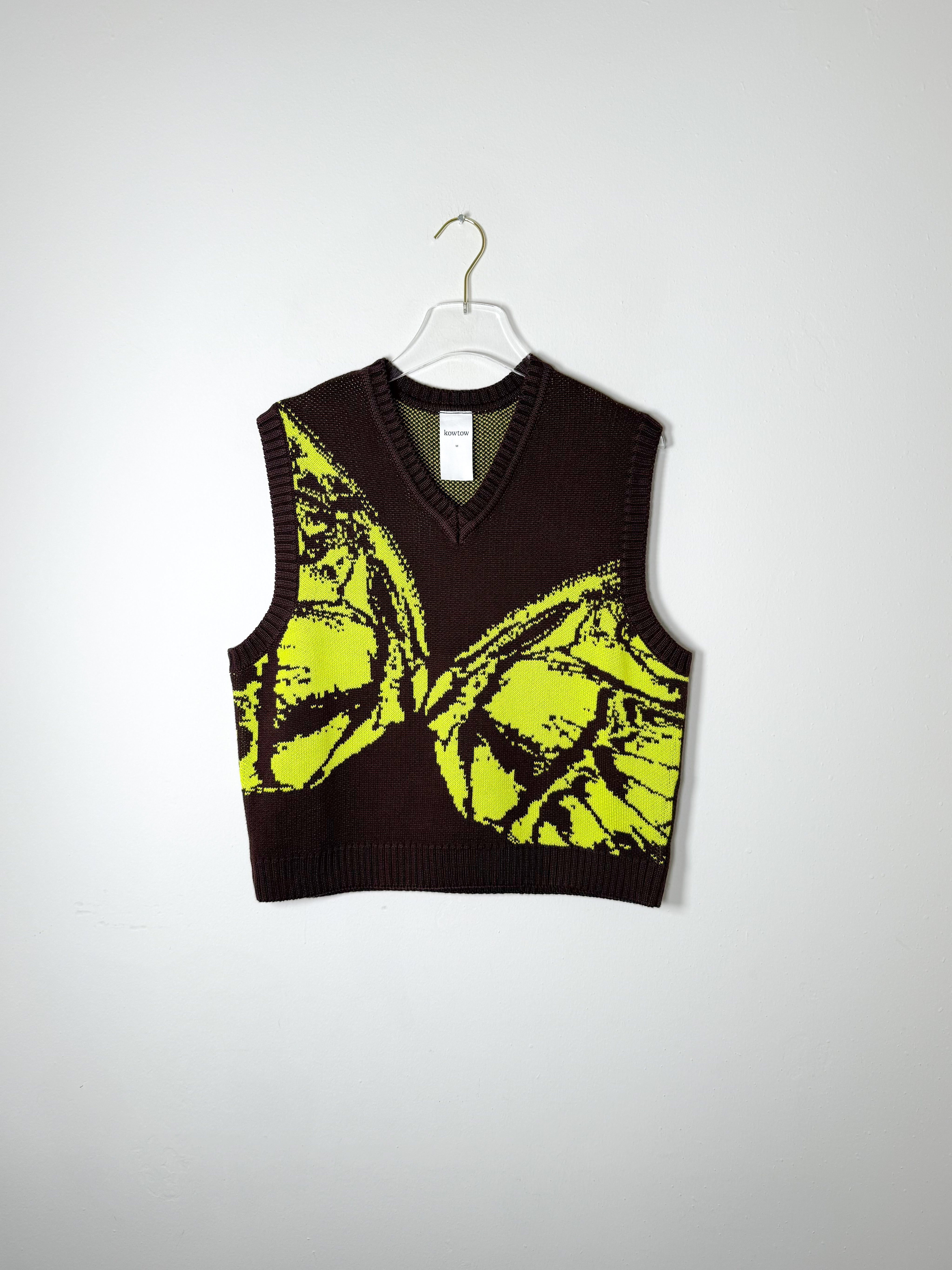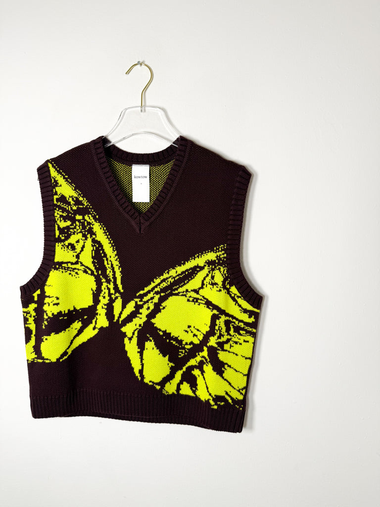 Double-knit cotton vest with a classic v-neckline and a striking yellow butterfly motif on the front. Timeless silhouette designed for easy layering and everyday wear.