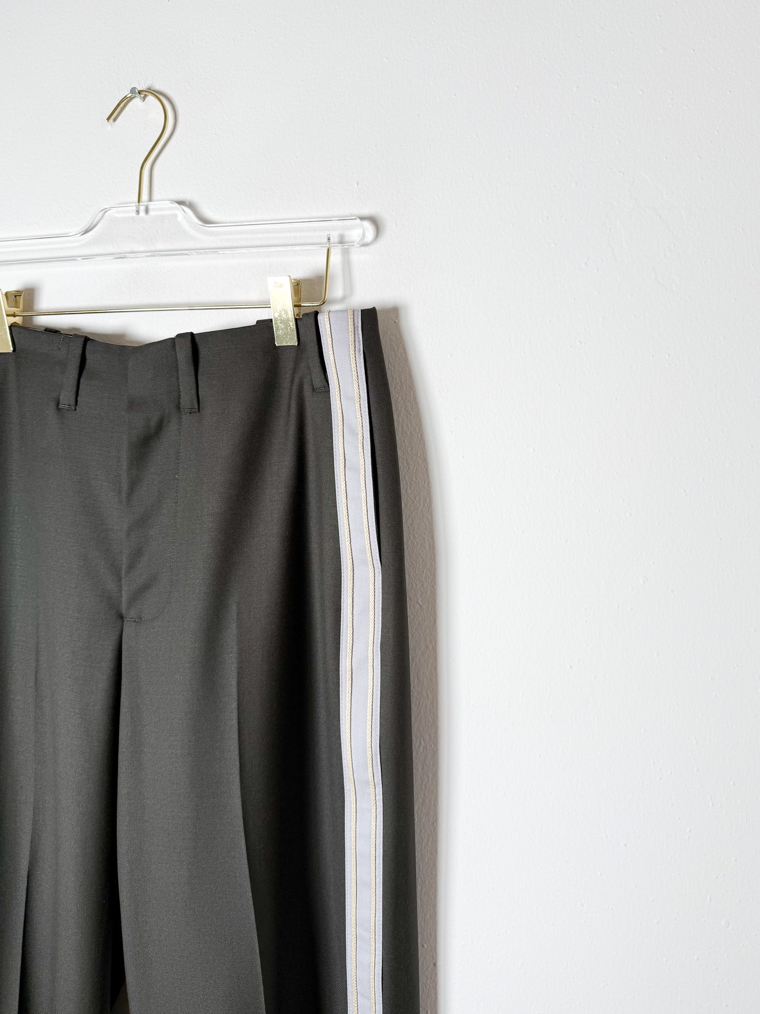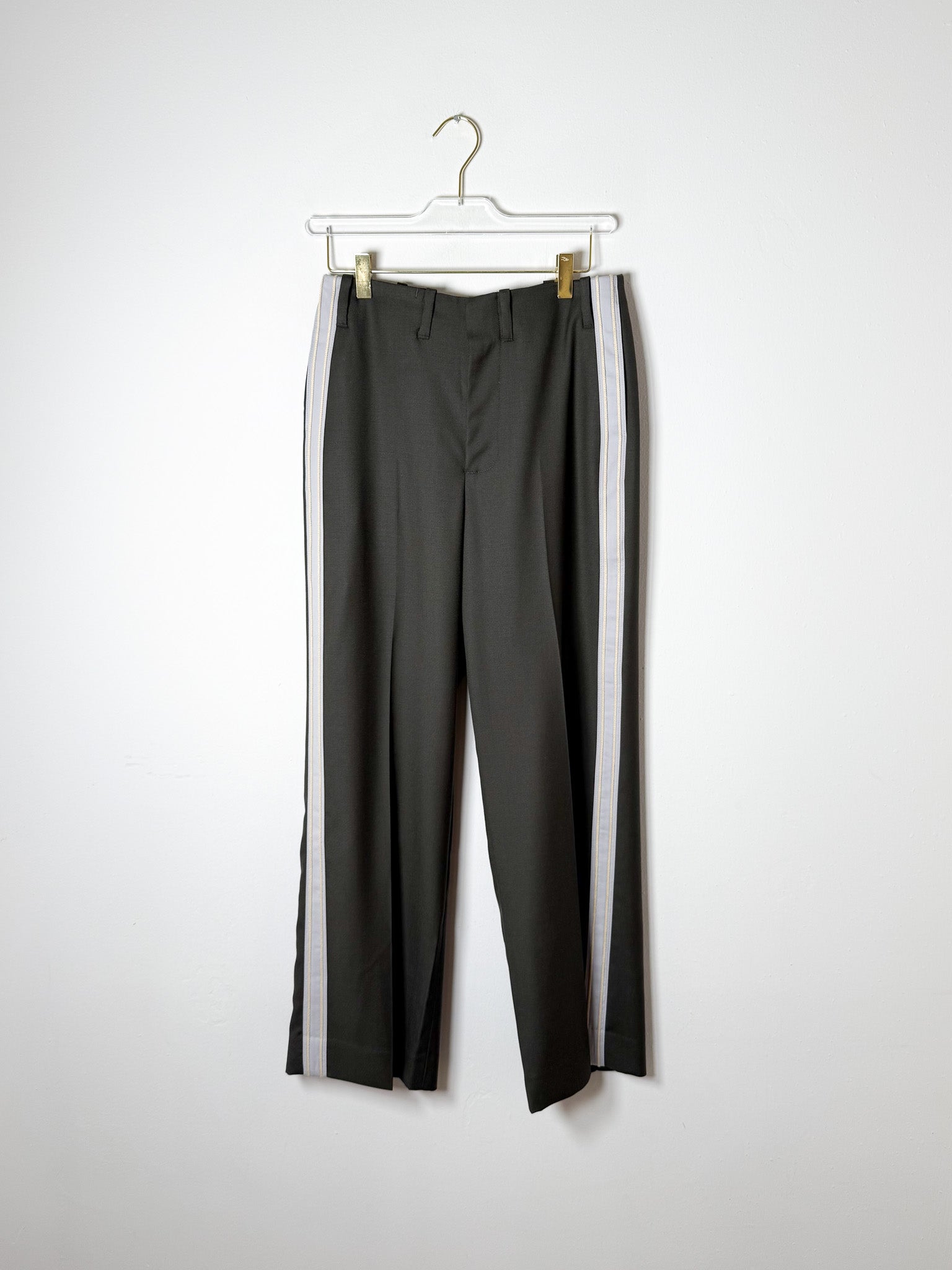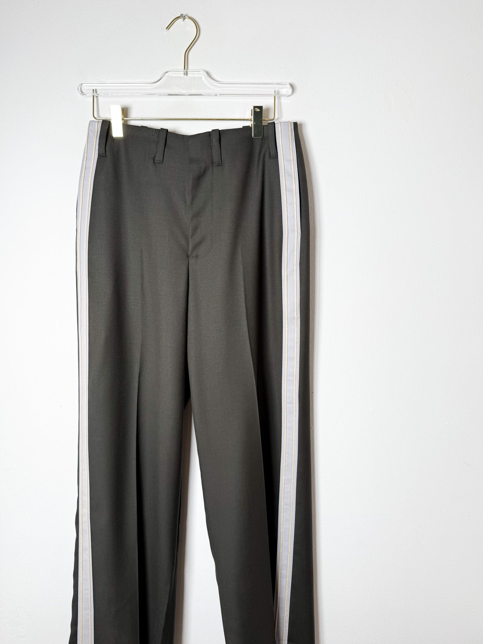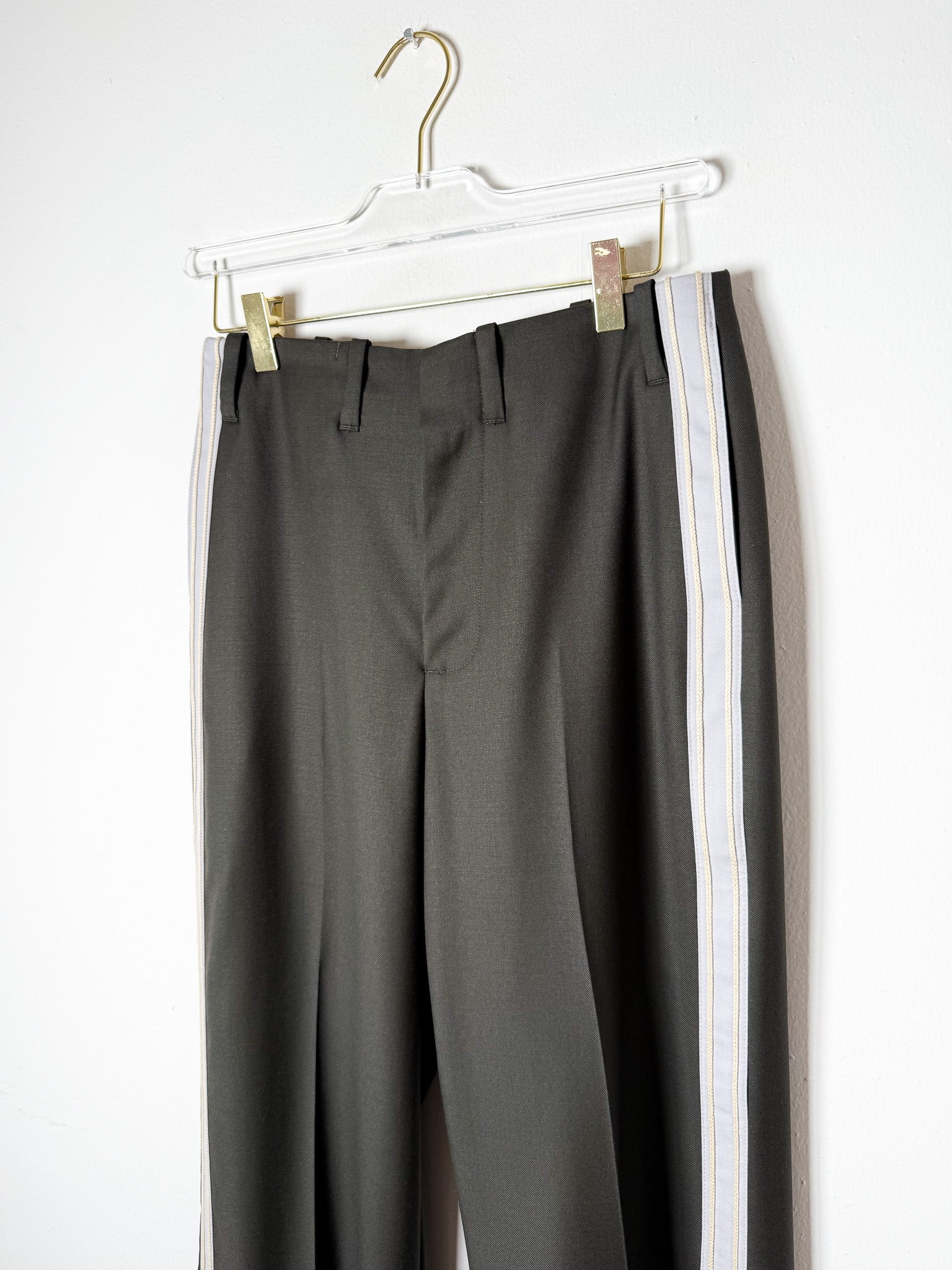 This pant is constructed of an ultra lightweight fine merino wool twill. Stripe detail down side of leg. Featuring a zip fly, belt loops, and western pockets on the back with button closure. Sits on natural waist.