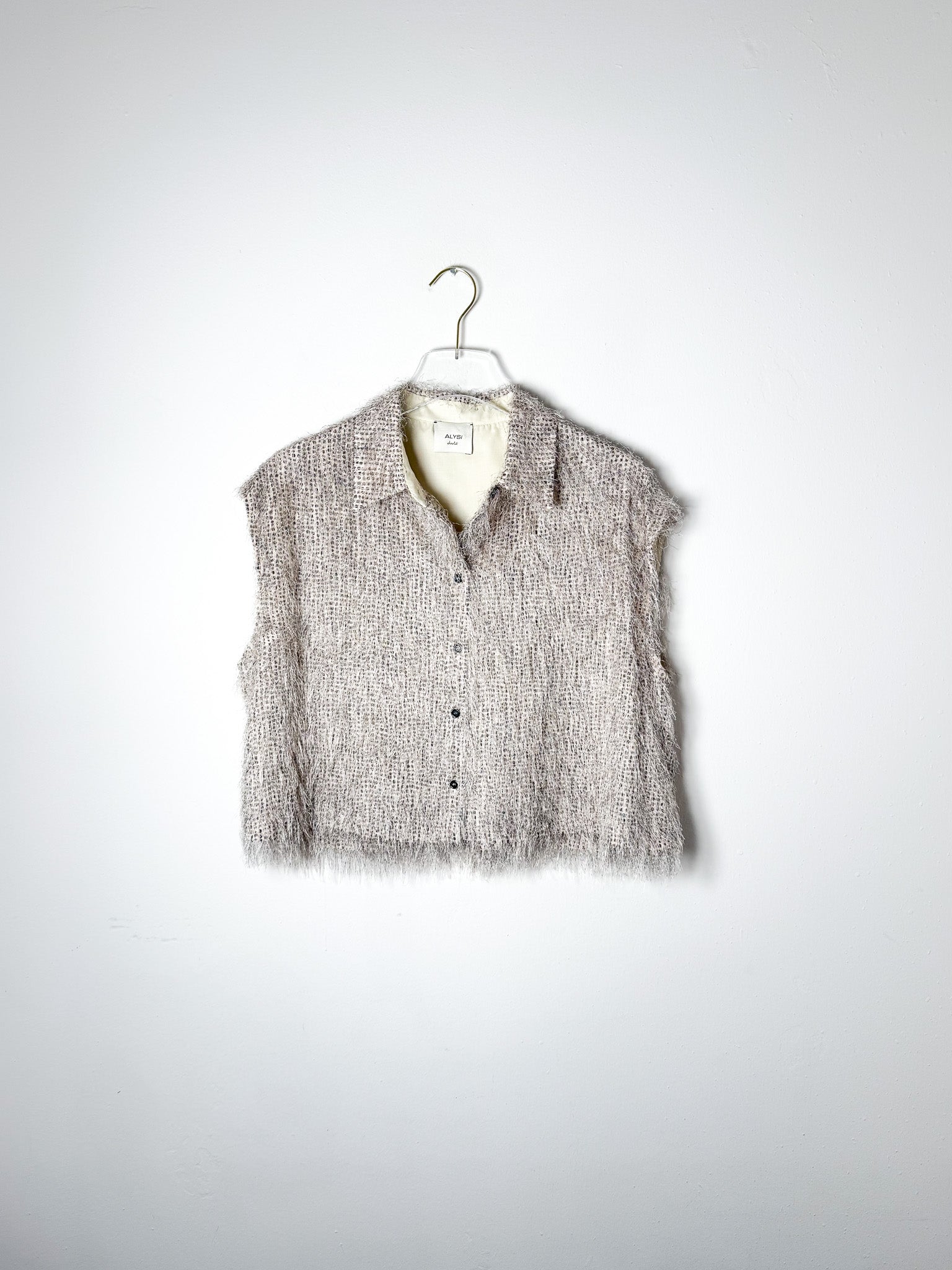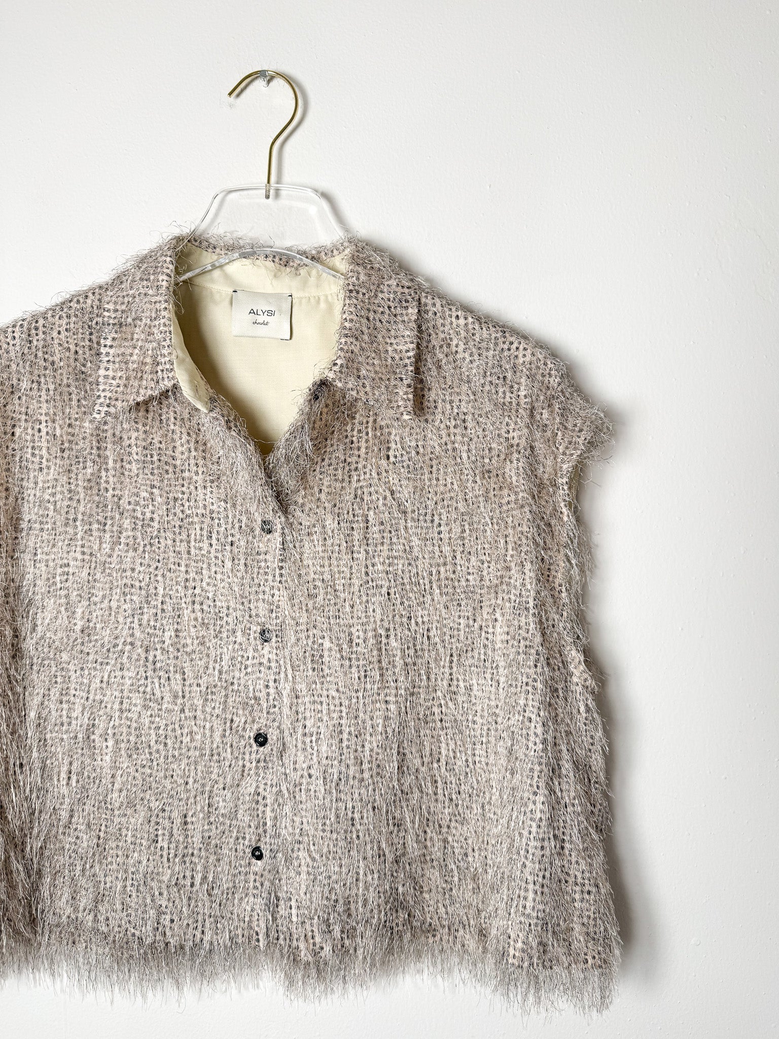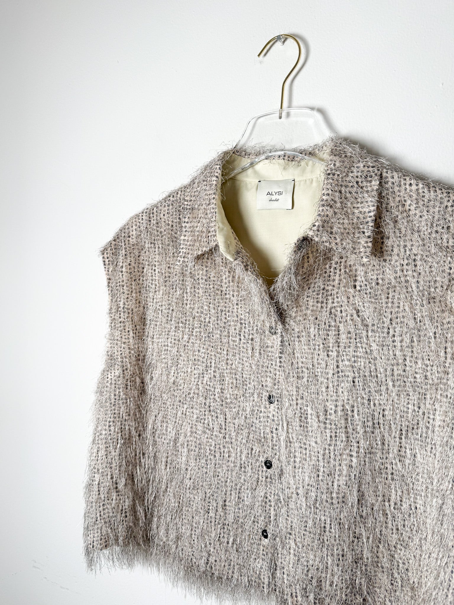 Sleeveless button-front crop with delicate fringe accents across the fabric.